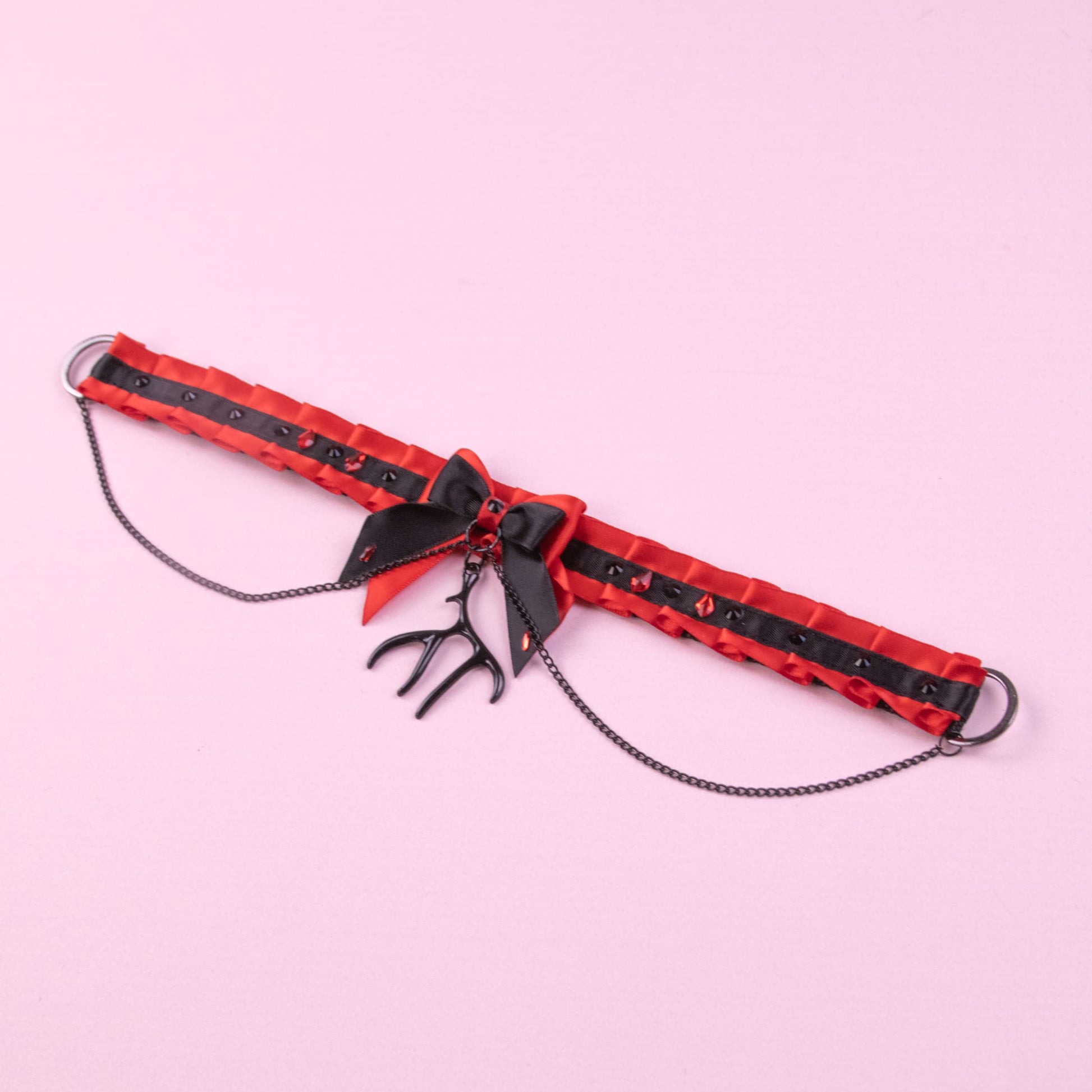 Pleated black and red choker with bow, charm, chains and rhinestone accents.