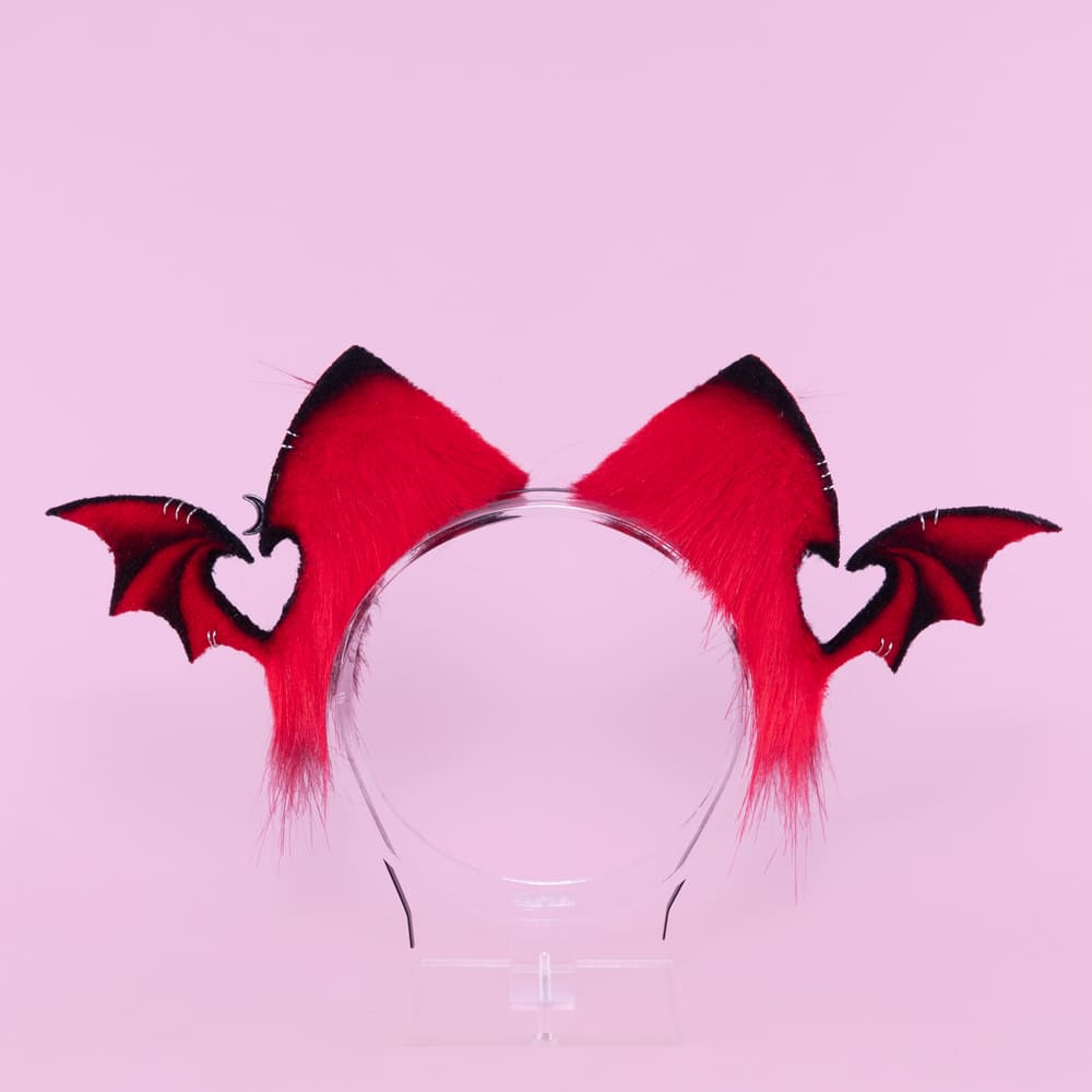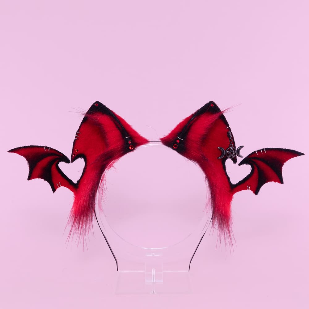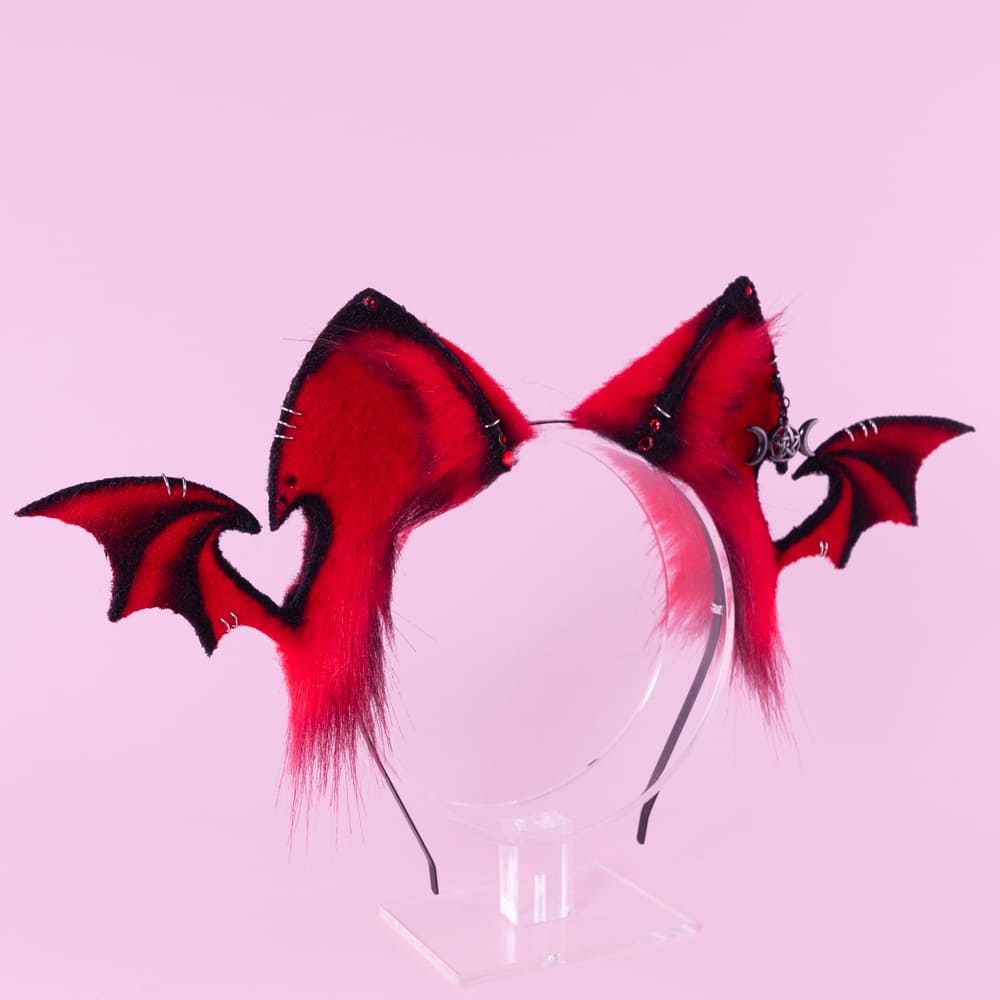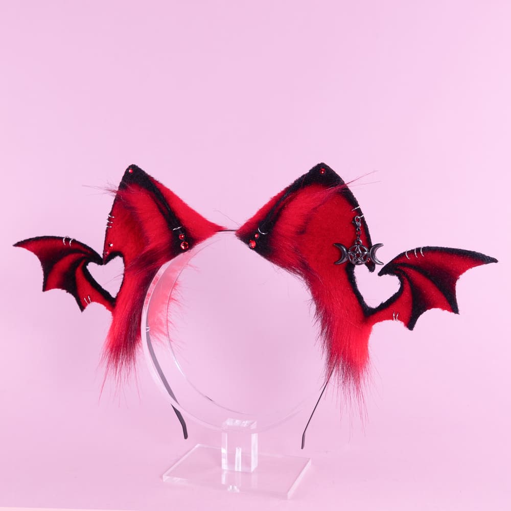 Red kitten shaped ears, approximately 2.5 inches, decorated with airbrushing, piercing, rhinestones and a pendant. Ears are fully wired and posable on a metal headband. Made of luxury quality faux fur.
