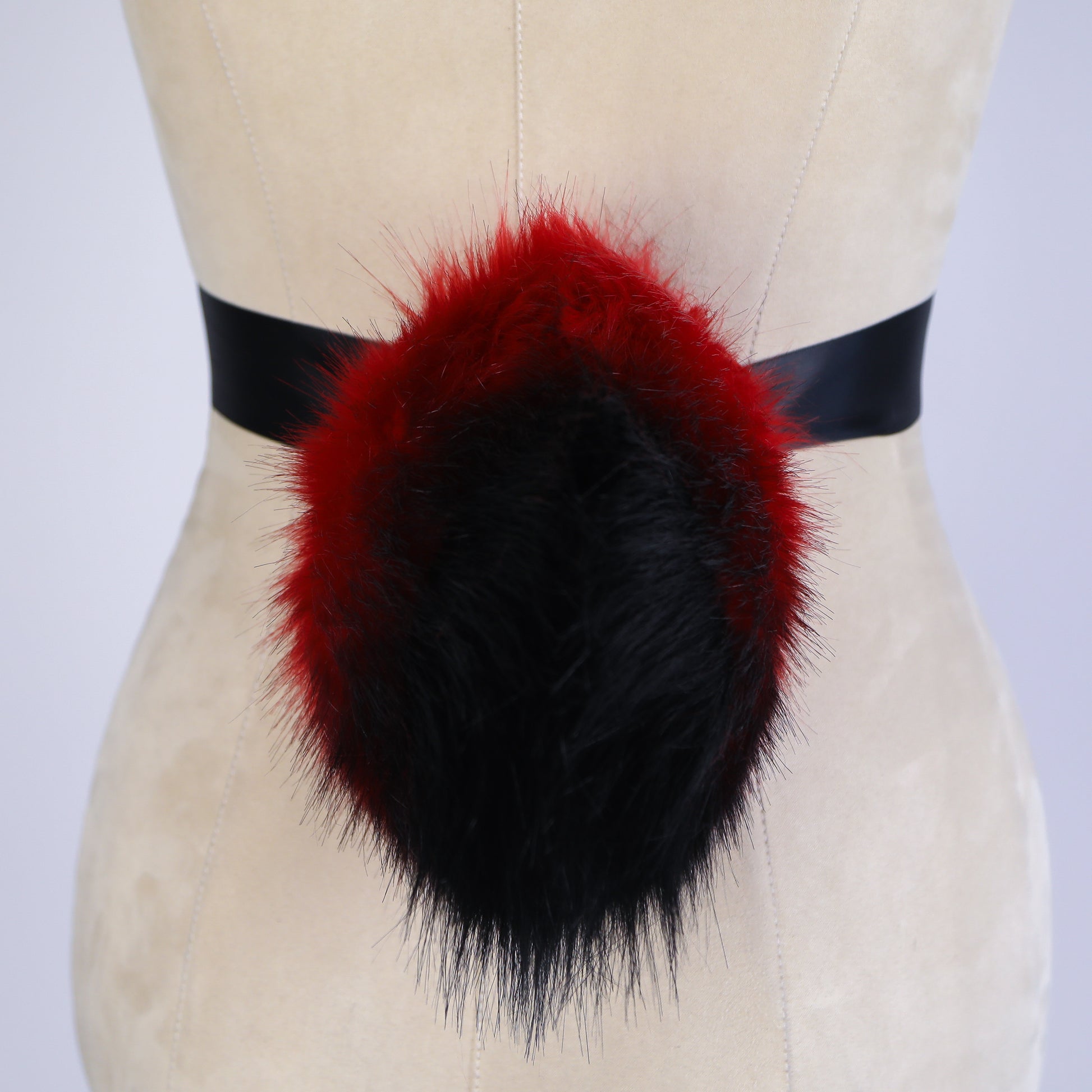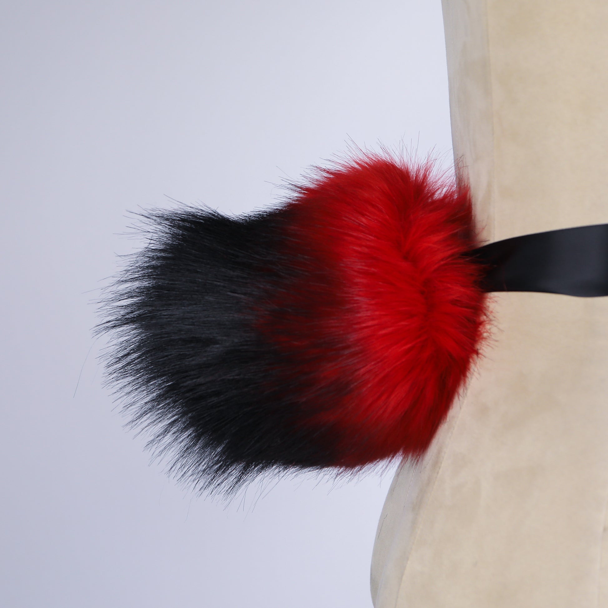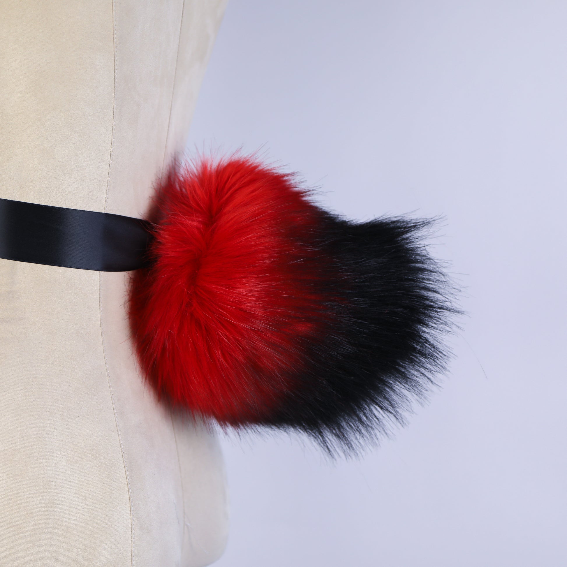 Red and black tail, approximately 6 inches. Made of luxury quality faux fur. Attached by an elastic belt loop and a doublesided ribbon.