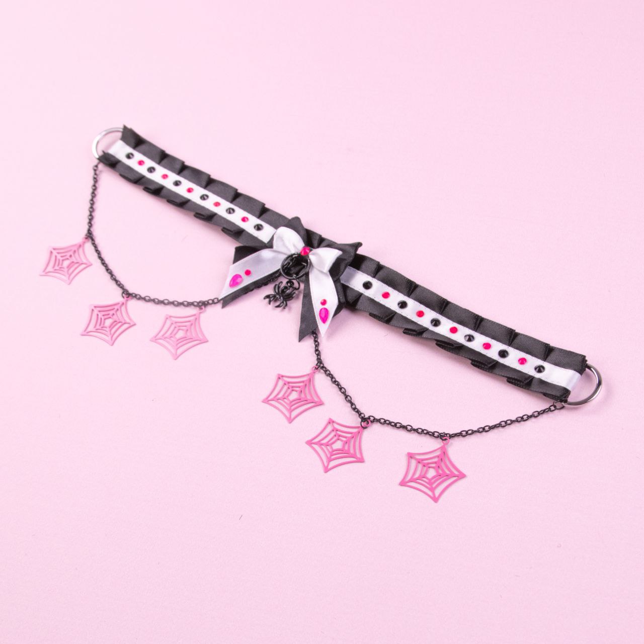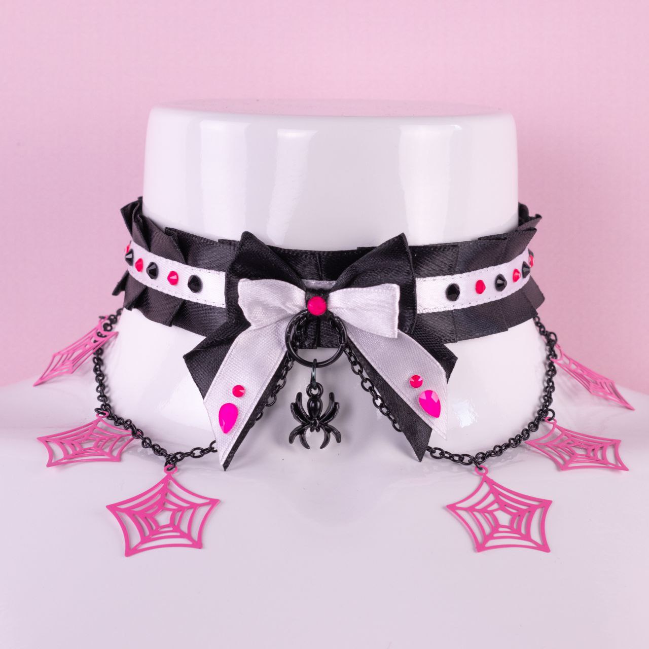 Pleated black and pink choker with bow, charms, chains and rhinestone accents.