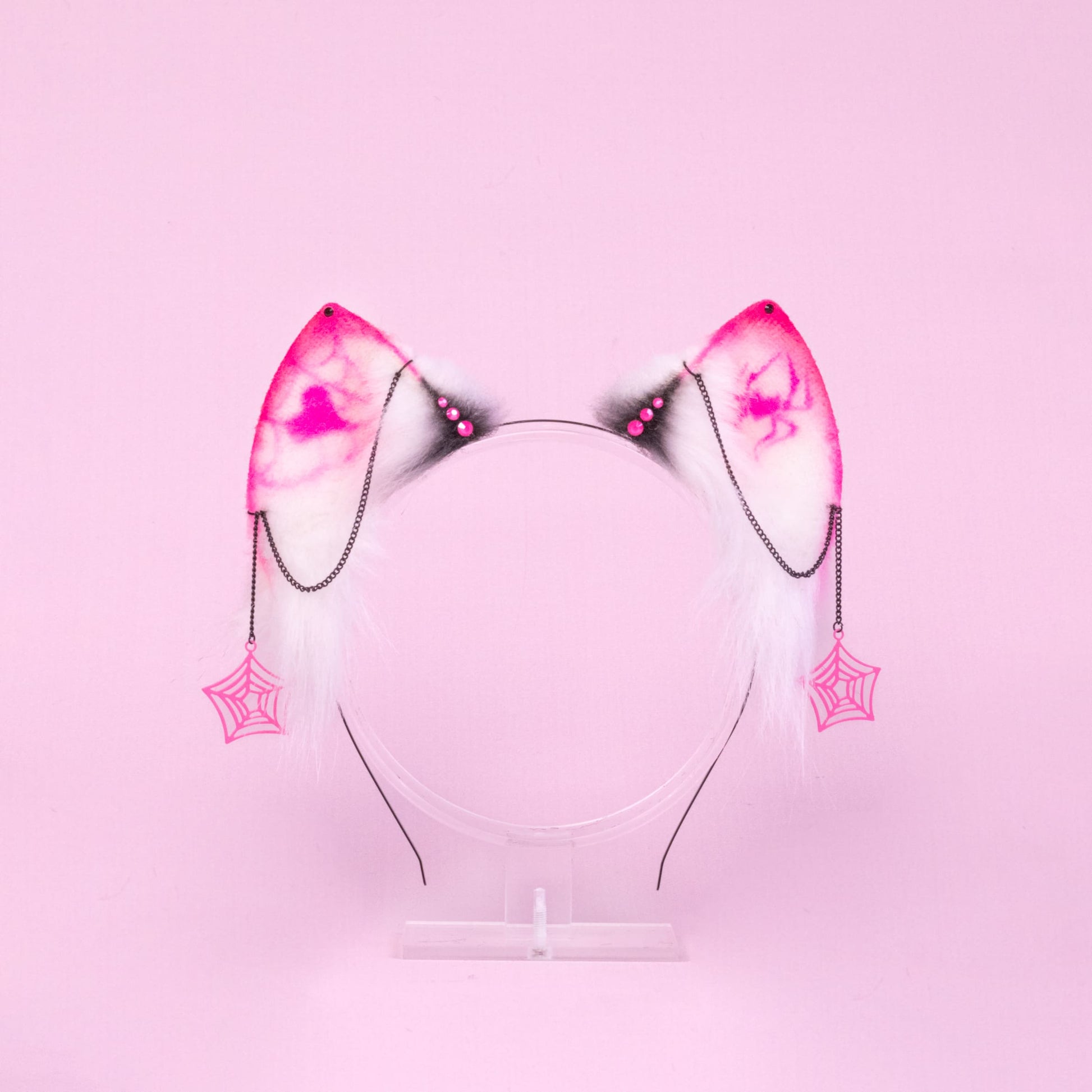 White and pink kitten shaped ears, approximately 2.5 inches, decorated with airbrushing, piercing, rhinestones and chains with themed pendants. Ears are fully wired and posable on a metal headband. Made of luxury quality faux fur and crystals.