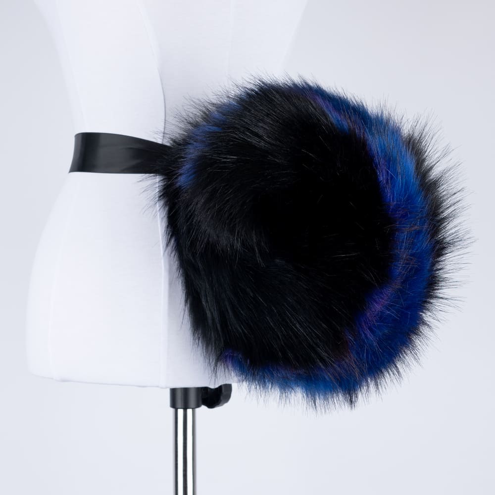 Black and blue puppy shaped tail, approximately 12 inches, decorated with airbrushing. Tail is attached by an elastic belt loop and a doublesided ribbon. Made of luxury quality faux fur.