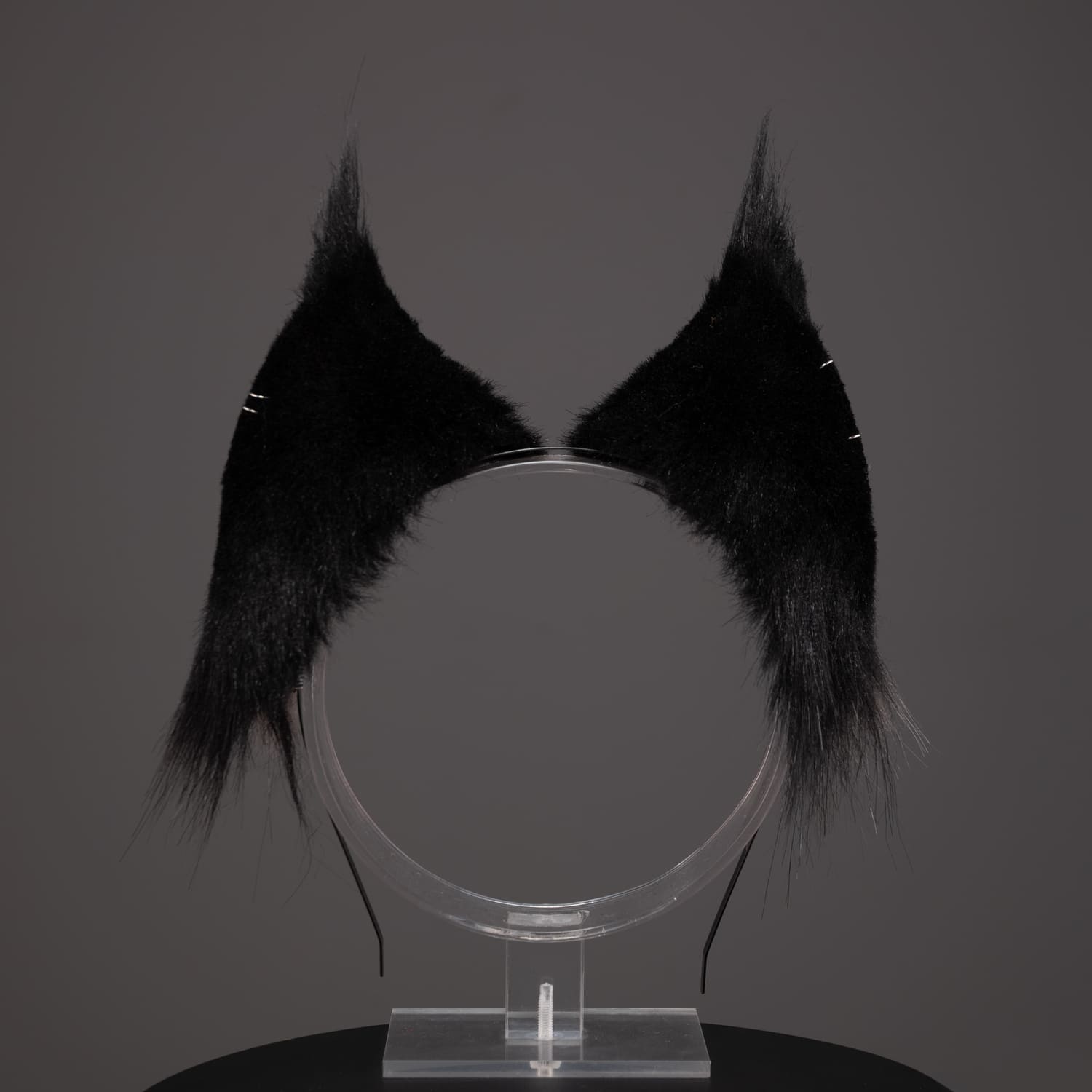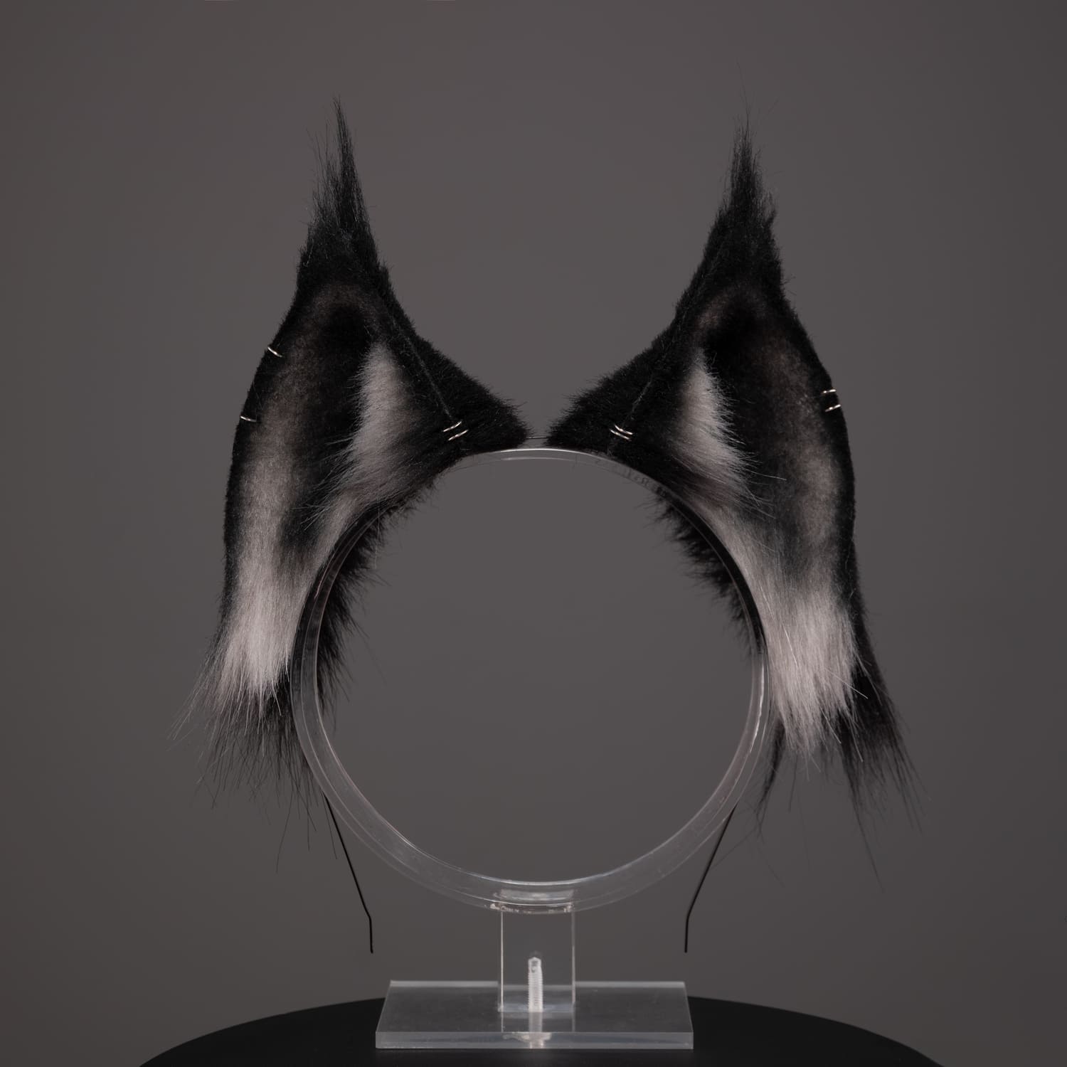 Black and grey lynx shaped ears, approximately 2.5 inches, decorated with metal hoops. Ears are fully wired and posable on a metal headband. Made of luxury quality faux fur.