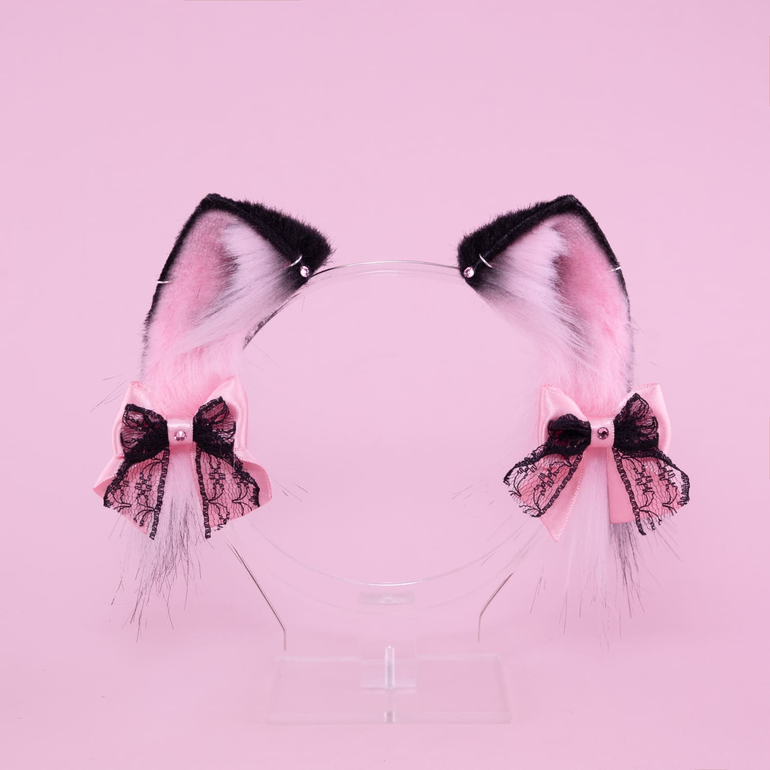Black and pink kitten shaped ears, approximately 2 inches, decorated with rhinestones, metal hoops and cute bows. Ears are fully wired and posable on a metal headband. Made of luxury quality faux fur and crystals.