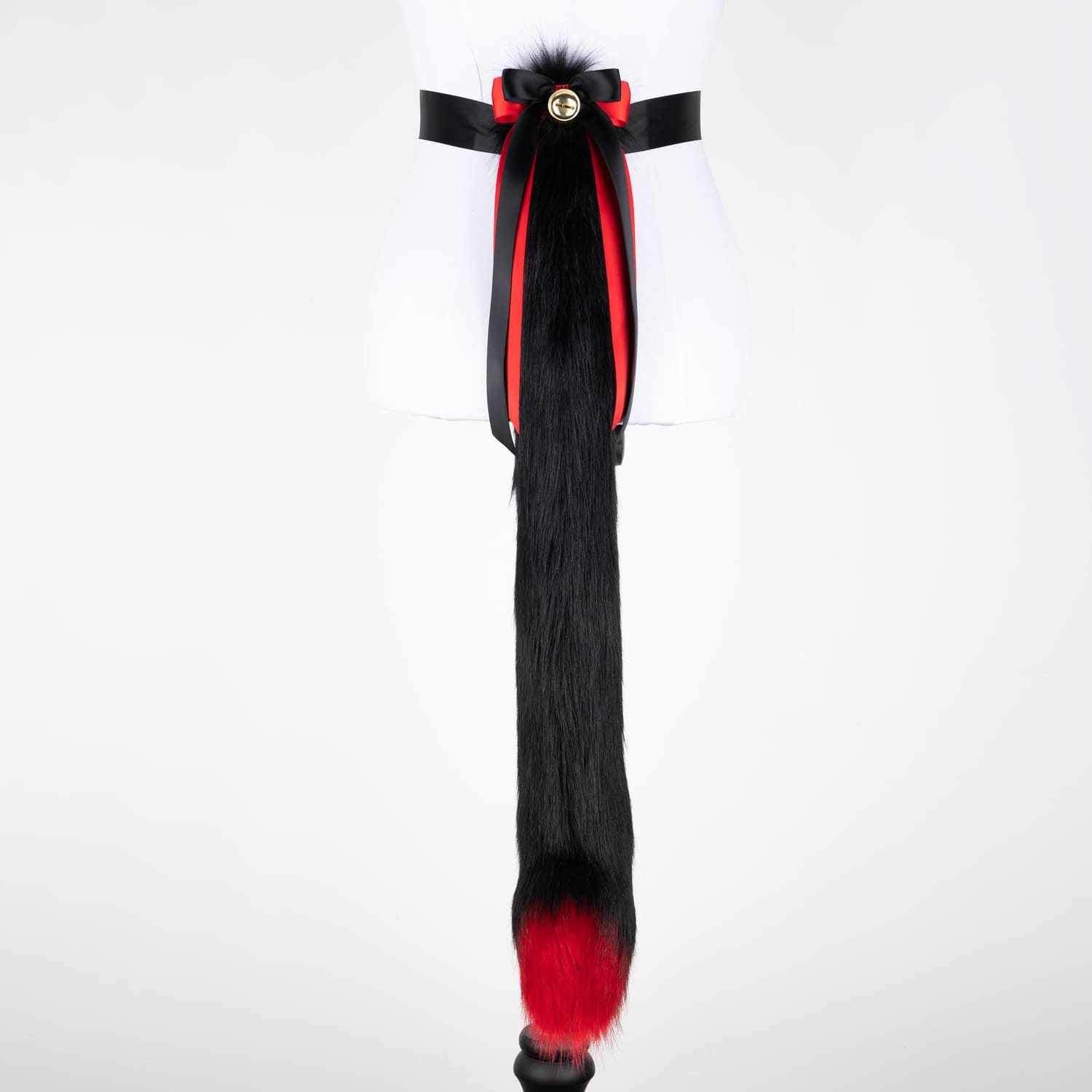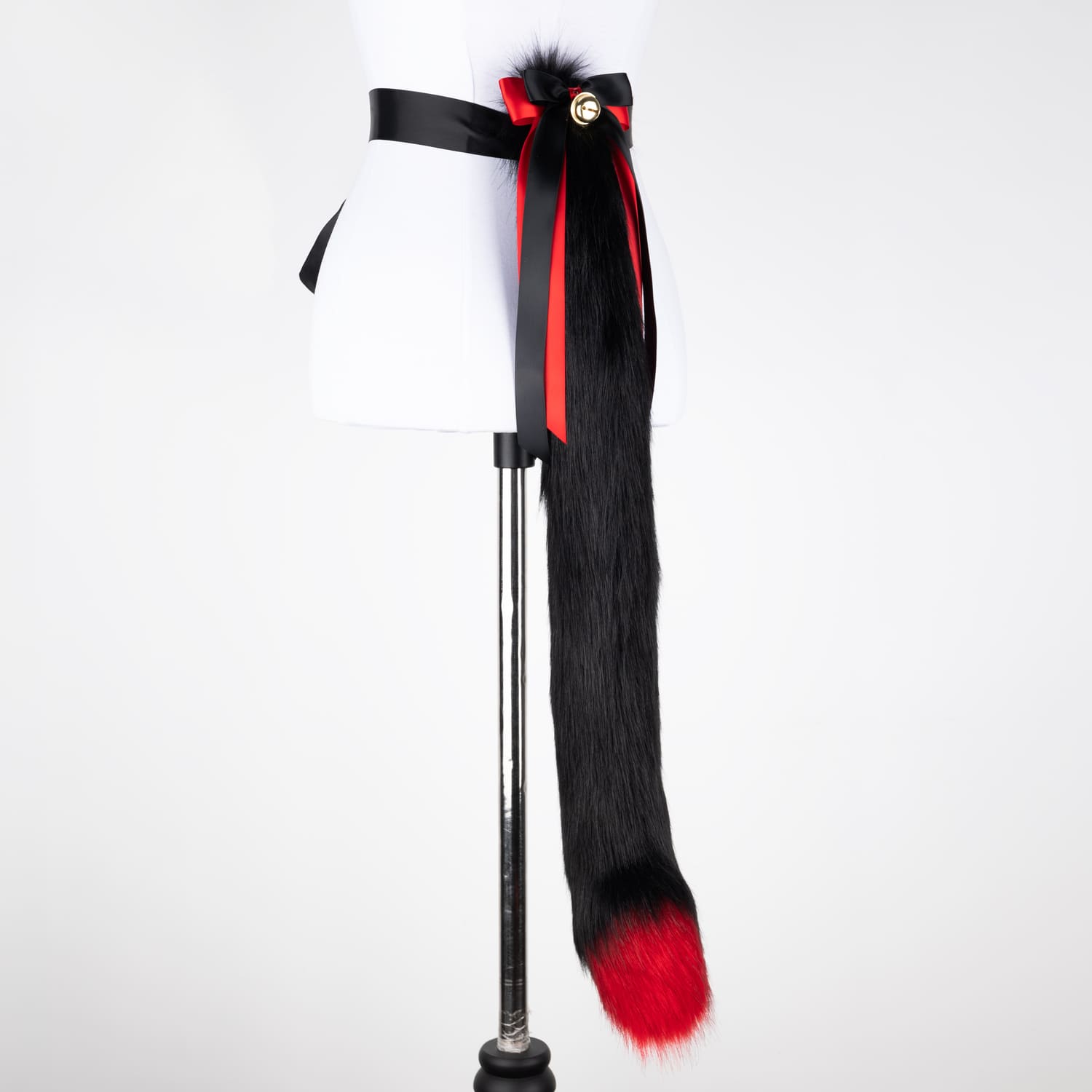 Black and red kitten shaped tail, approximately 30 inches, decorated with airbrushing and a bow with a bell. Tail is attached by an elastic belt loop and a doublesided ribbon. Made of luxury quality faux fur.