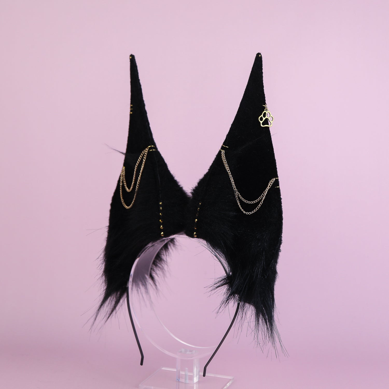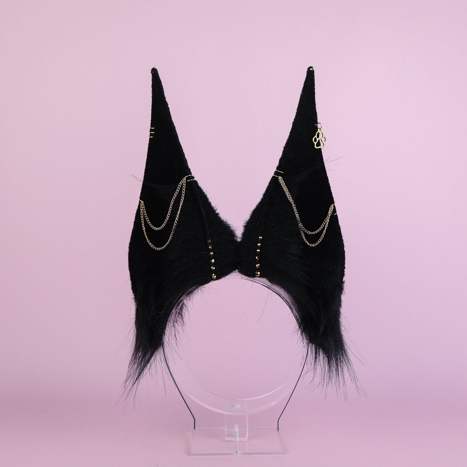 Ears are fully wired and posable on a metal headband. Approximately 7.5 inches tall. We use luxury quality faux fur and crystals.