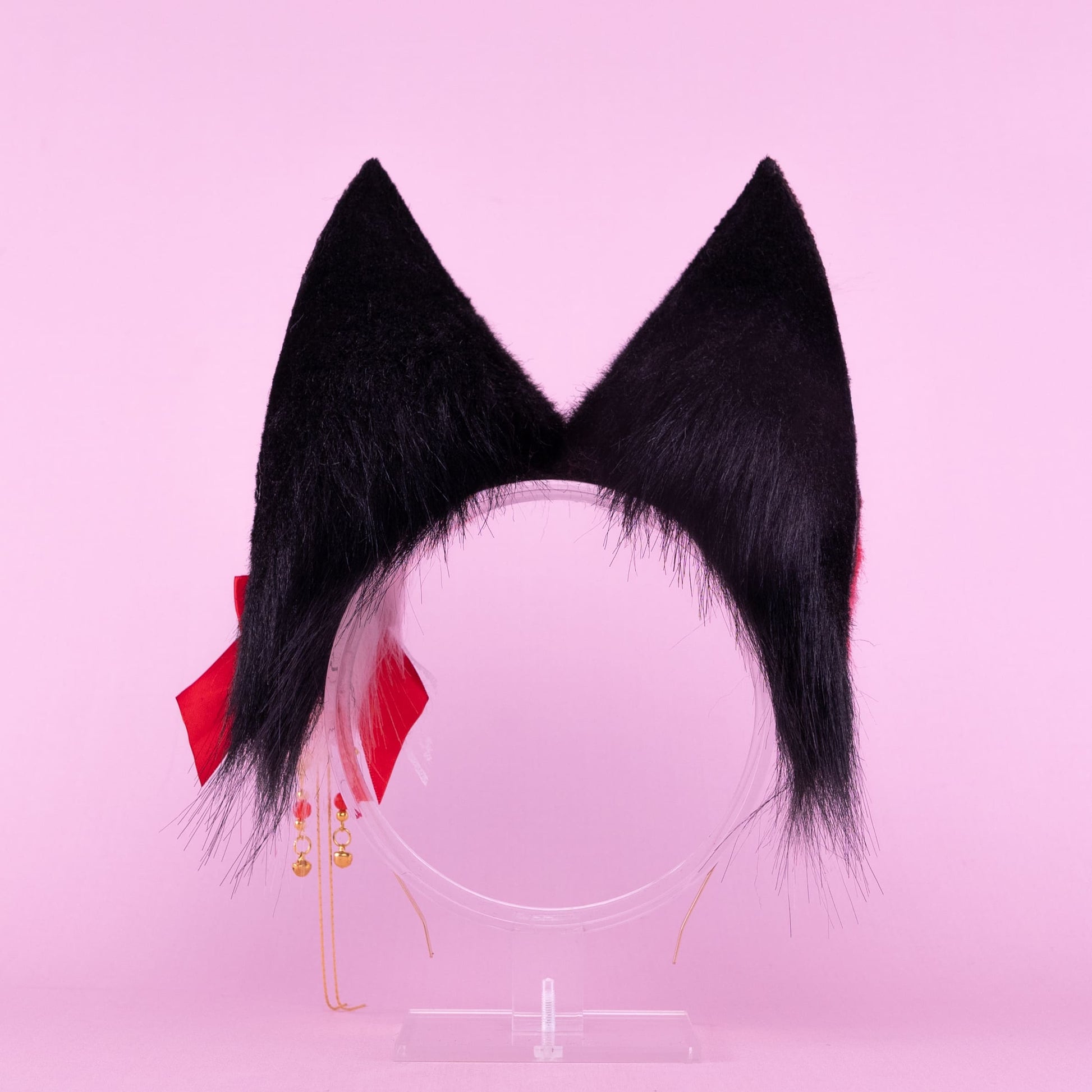Black and red fox shaped ears, approximately 3,5 inches, decorated with airbrushing, rhinestones, metal hoops and bow with themed pin. Ears are fully wired and posable on a metal headband. Made of luxury quality faux fur.