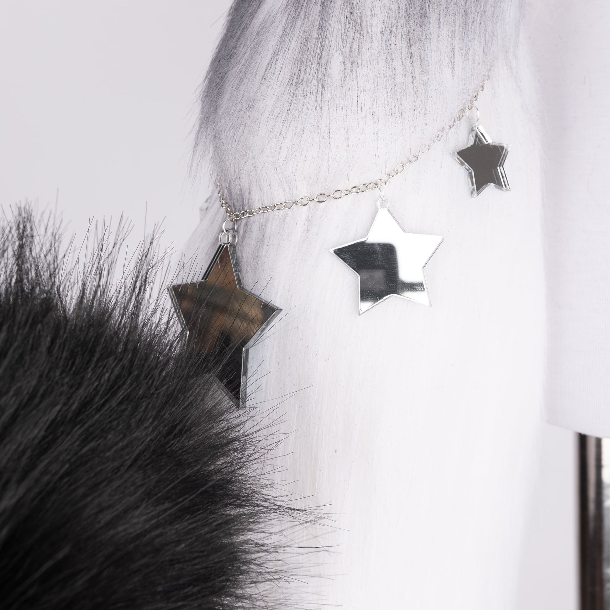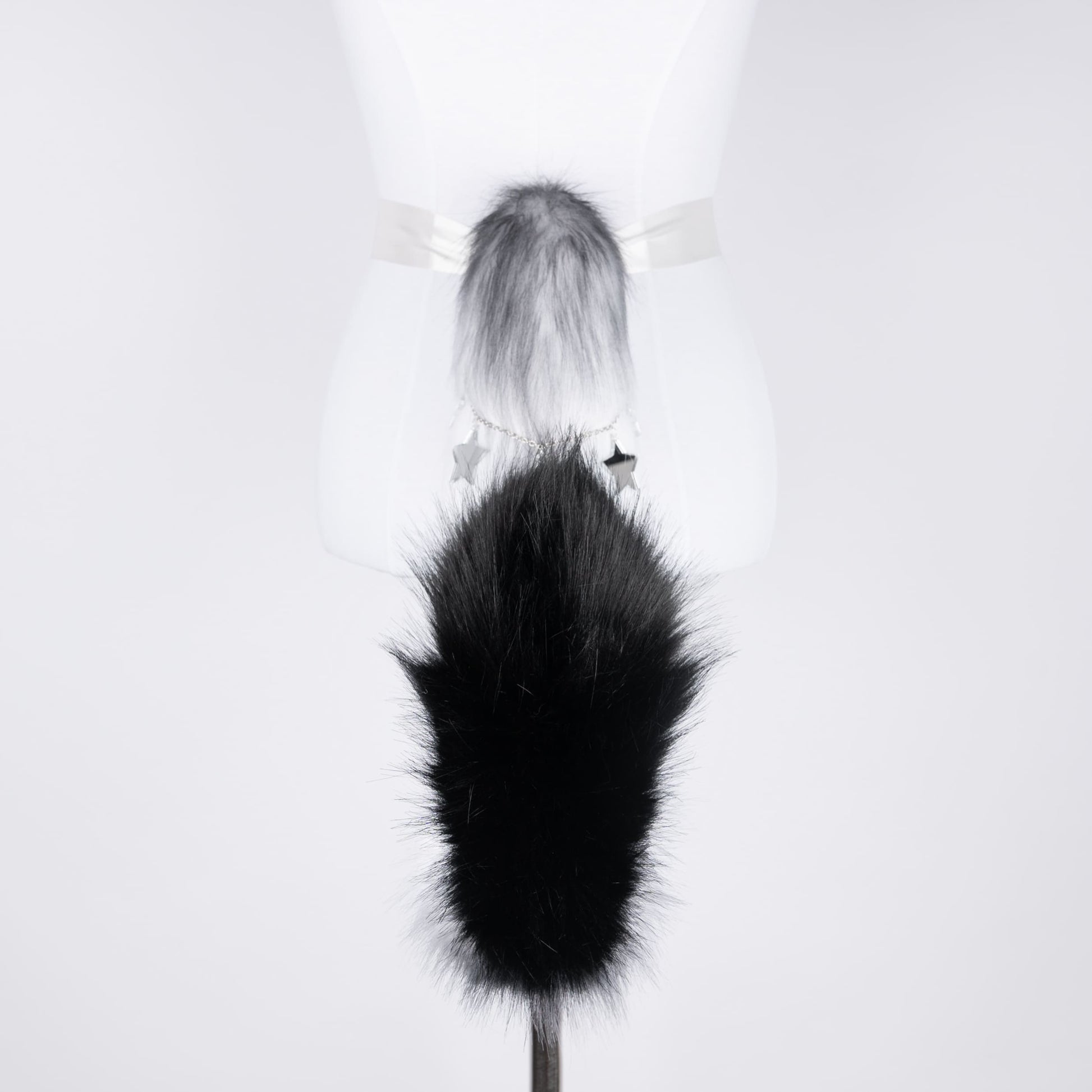 Black puppy shaped tail, approximately 22 inches, decorated with chain and plastic star pendants. Tail is attached by an elastic belt loop and a doublesided ribbon. Made of luxury quality faux fur.