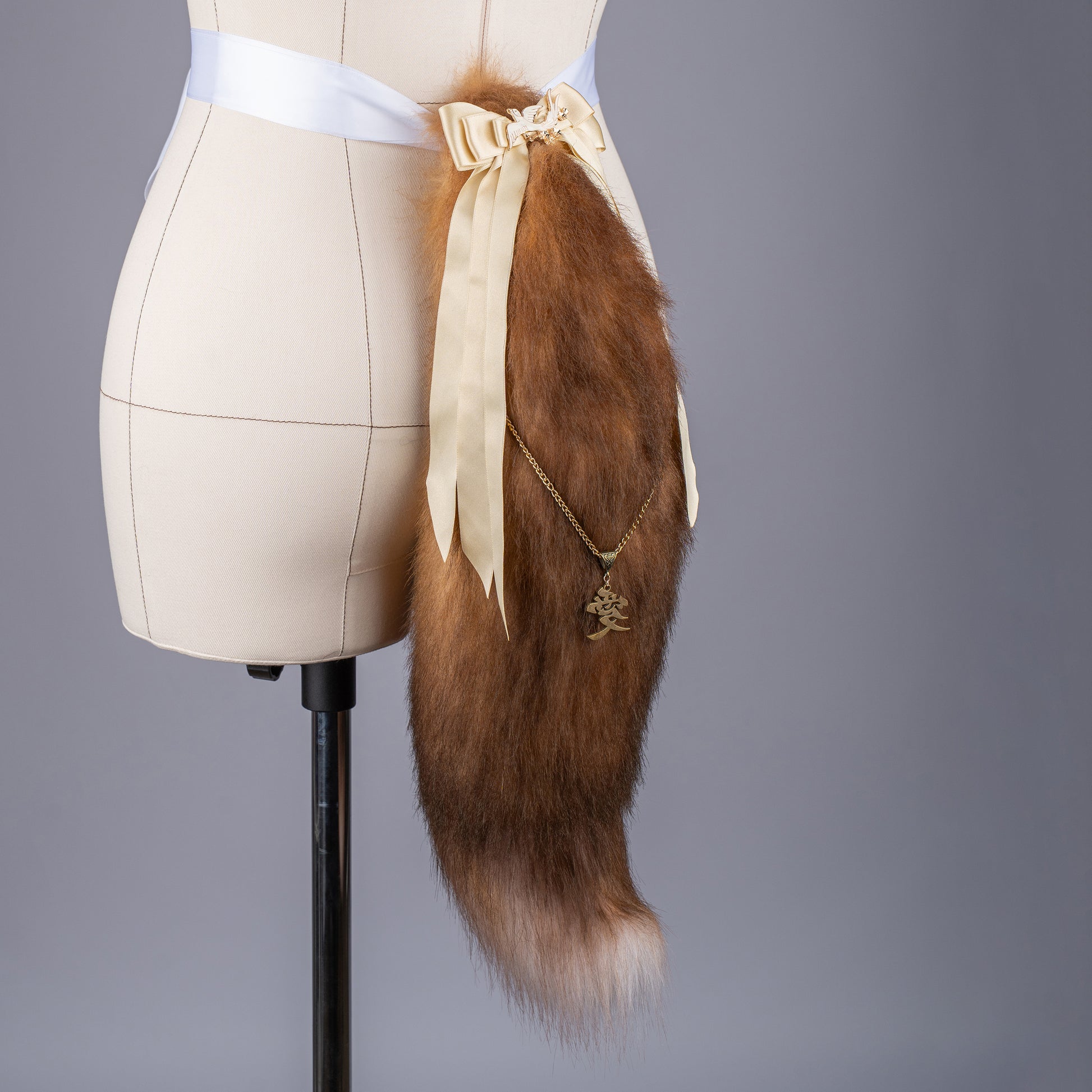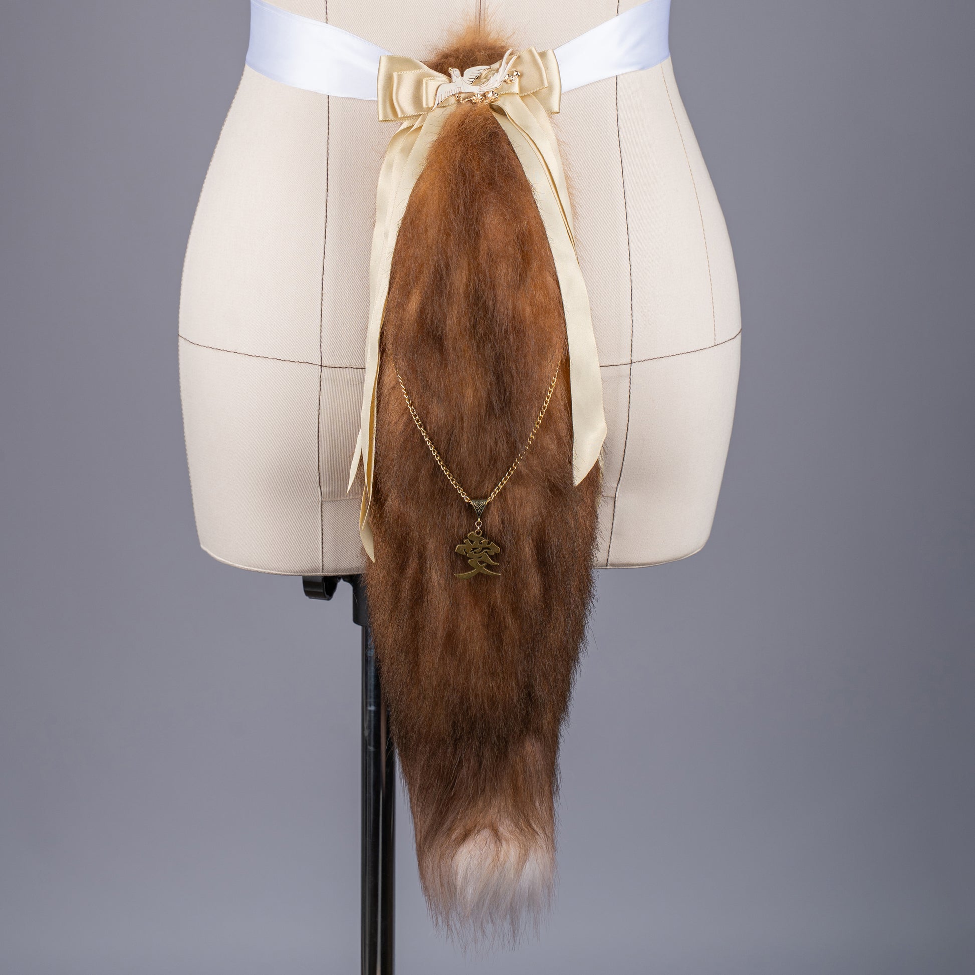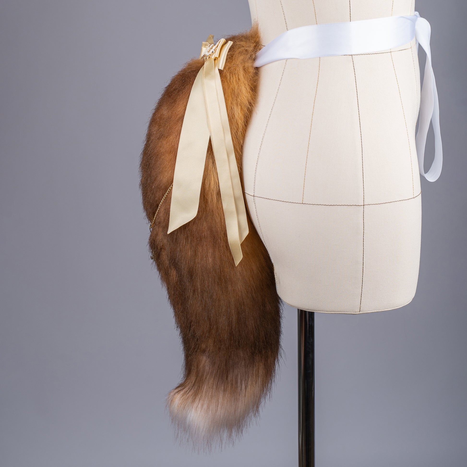 Blond tail, approximately 22 inches, decorated with airbrushing and bow with themed pin. Tail is attached by an elastic belt loop and a doublesided ribbon. Made of luxury quality faux fur.