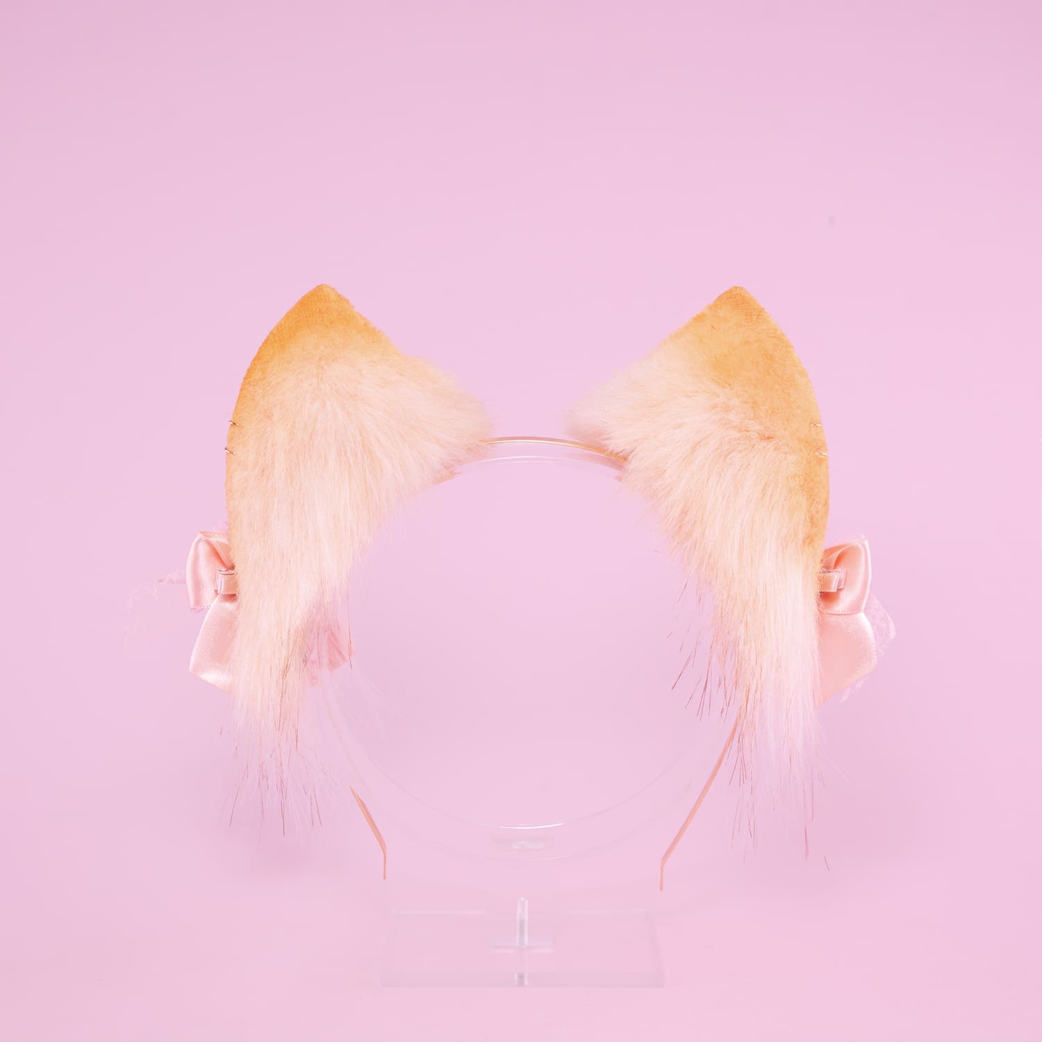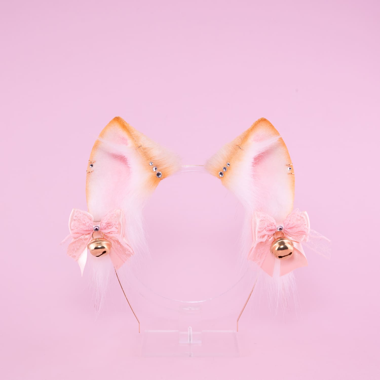 Beige kitten shaped ears, approximately 2.5 inches, decorated with metal hoops, rhinestones and bows with bells. Ears are fully wired and posable on a metal headband. Made of luxury quality faux fur and crystals.