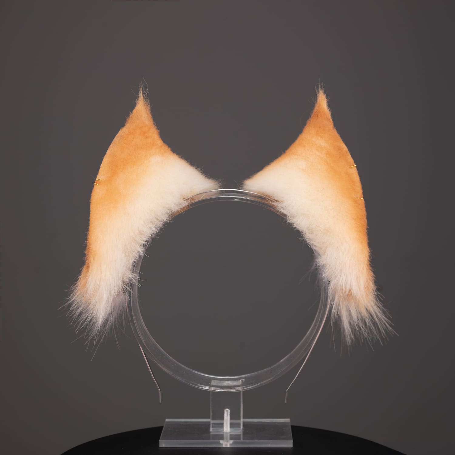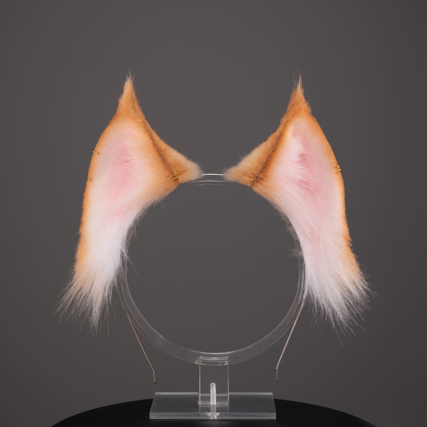 Blonde lynx shaped ears, approximately 2.5 inches, decorated with metal hoops. Ears are fully wired and posable on a metal headband. Made of luxury quality faux fur.