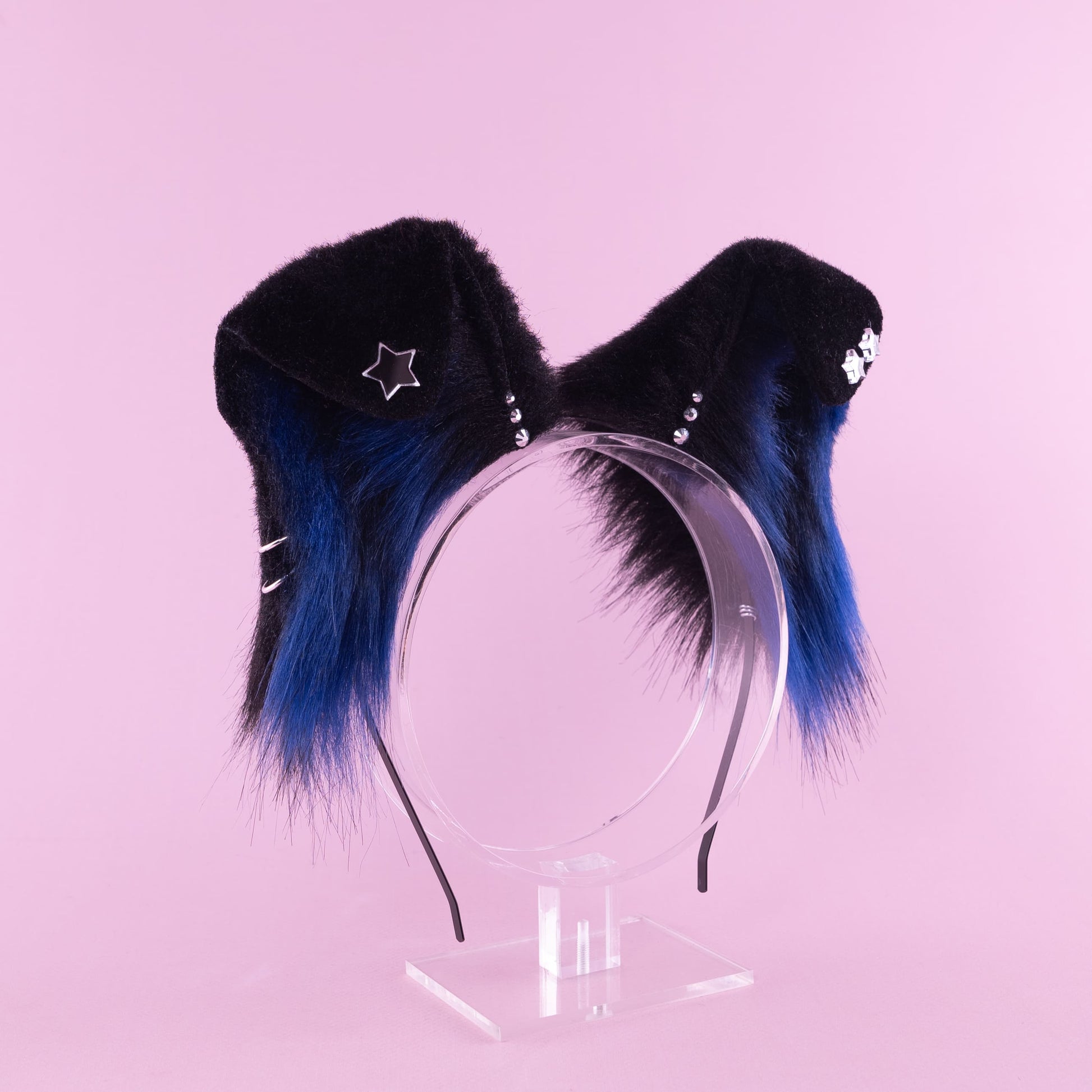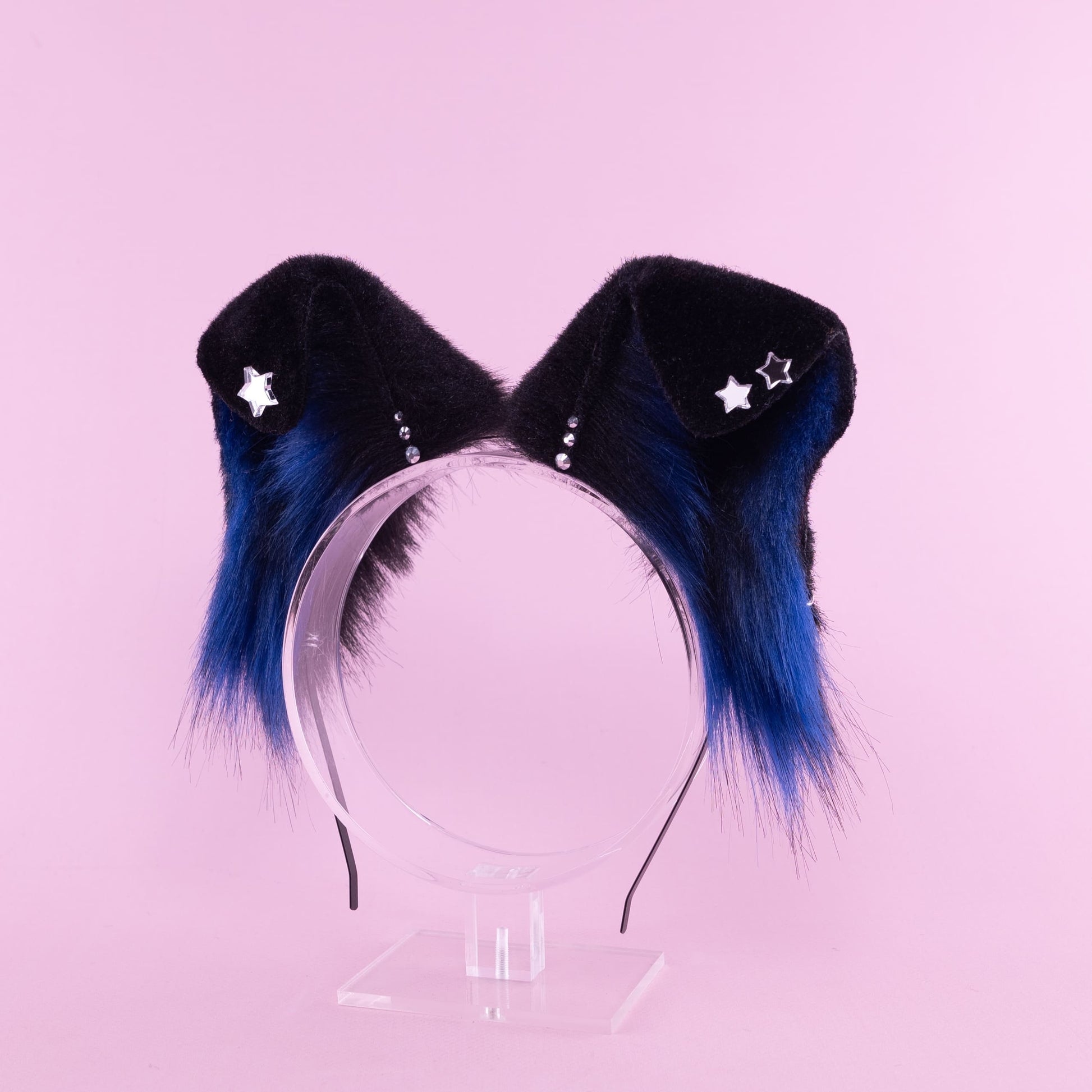 Blue and black puppy shaped ears, approximately 4 inches, decorated with airbrushing, piercing, rhinestones and plastic stars. Ears are fully wired and posable on a metal headband. Made of luxury quality faux fur and crystals.