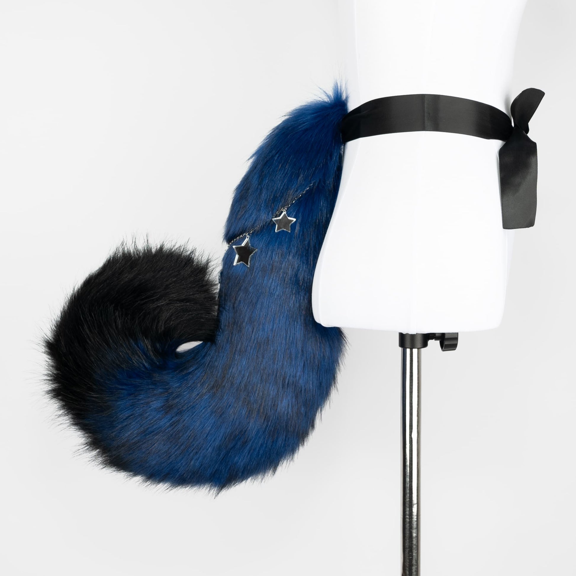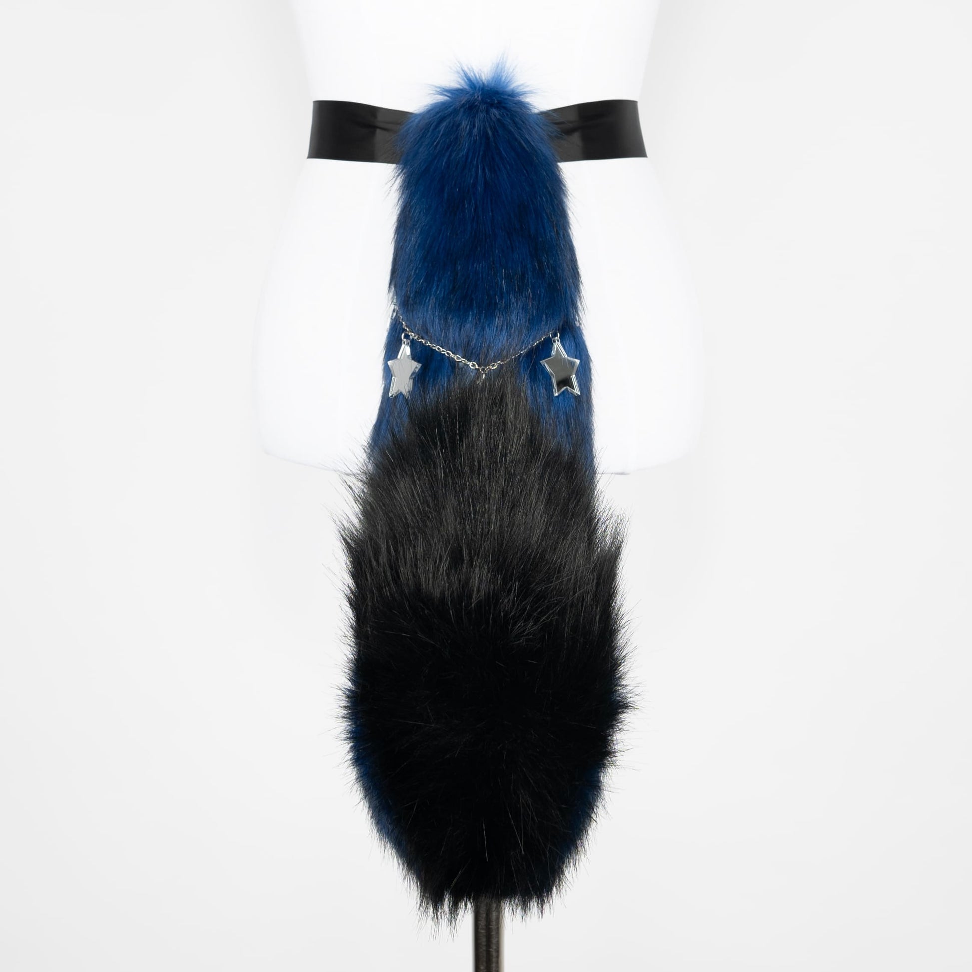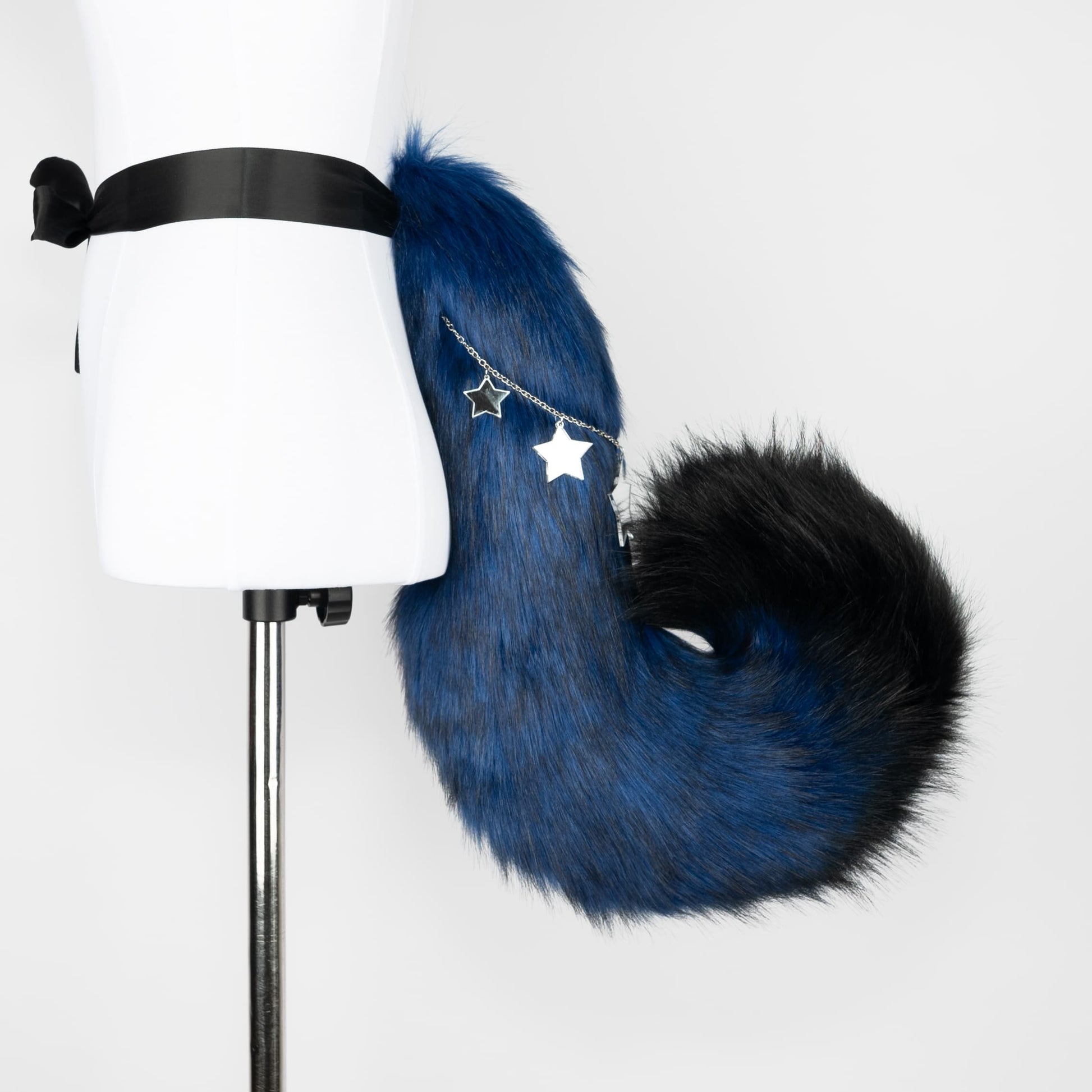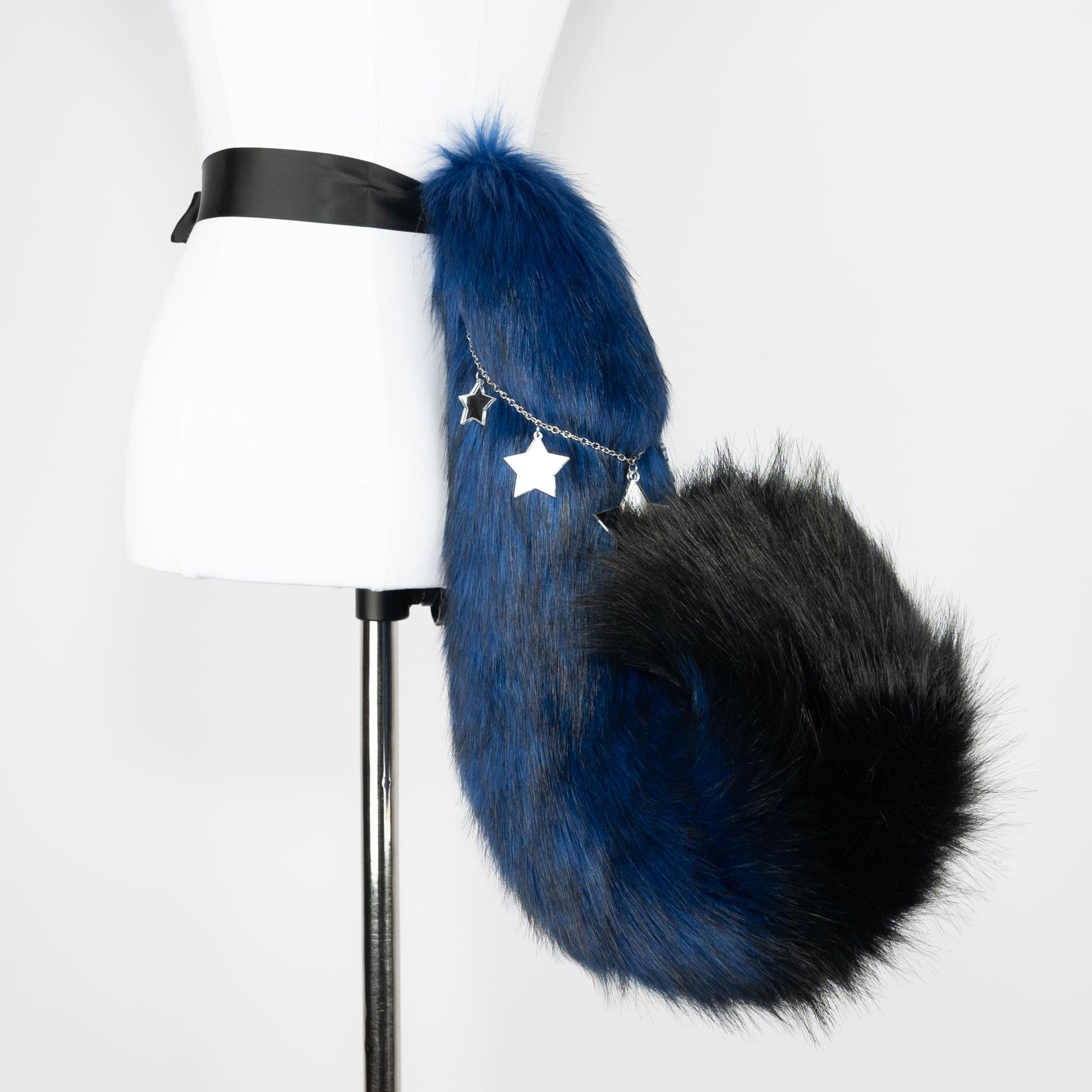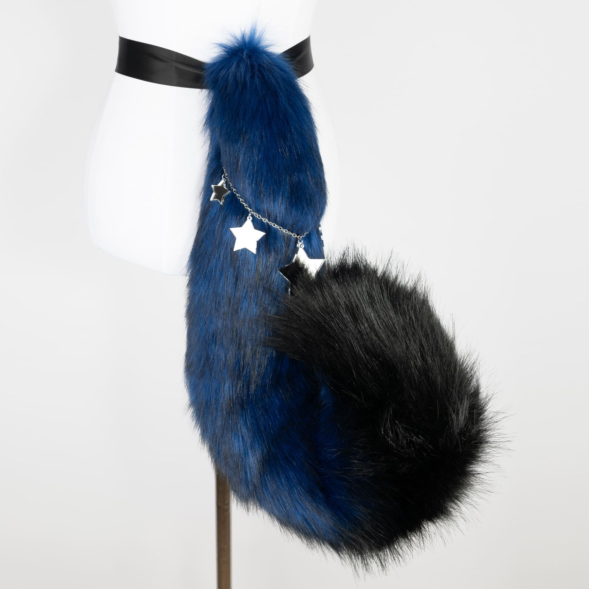 Blue and black puppy shaped tail, approximately 22 inches, decorated with chain and plastic star pendants. Tail is attached by an elastic belt loop and a doublesided ribbon. Made of luxury quality faux fur.