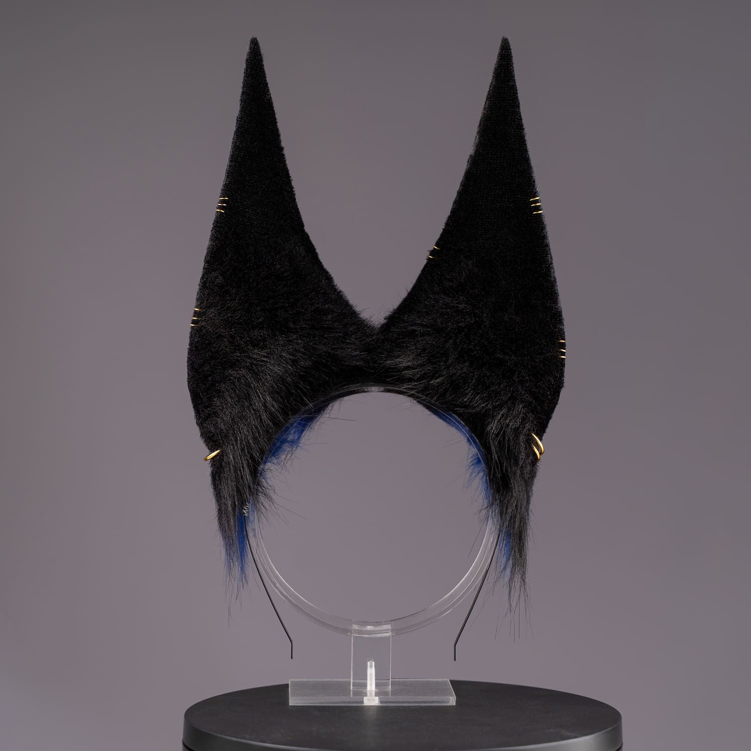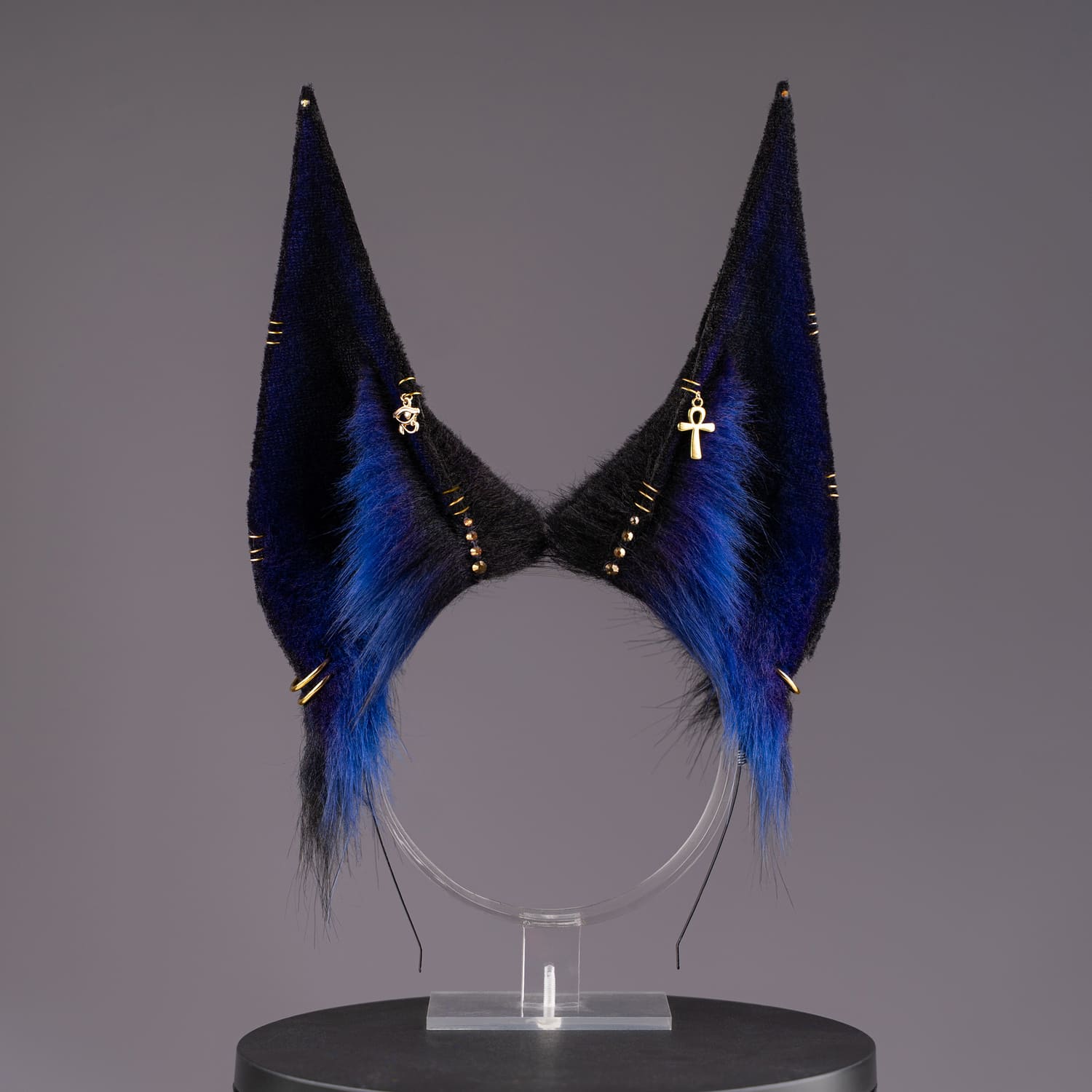 Blue Anubis ears, approximately 7.5 inches, decorated with metal hoops, rhinestones and themed pendants. Ears are fully wired and posable on a metal headband. Made of luxury quality faux fur.