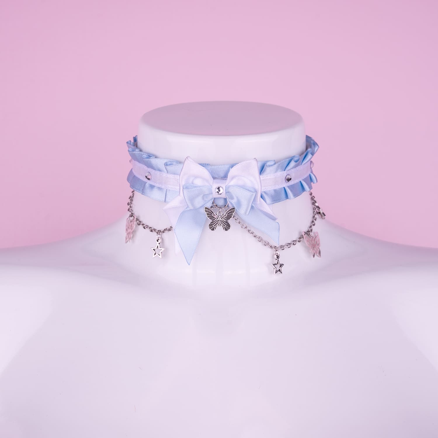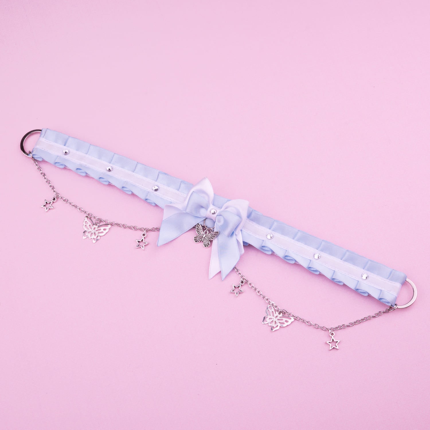 Blue pleated choker with rhinestones, chains, pendants and a bow with a butterfly pendant.