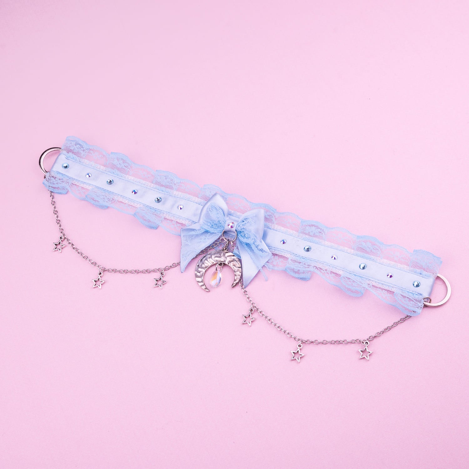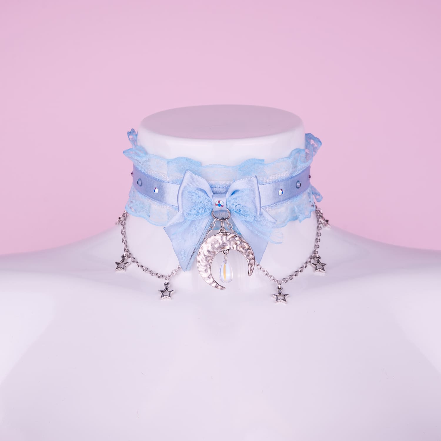 Blue pleated choker with rhinestones, chains, pendants and a bow with a moon pendant.
