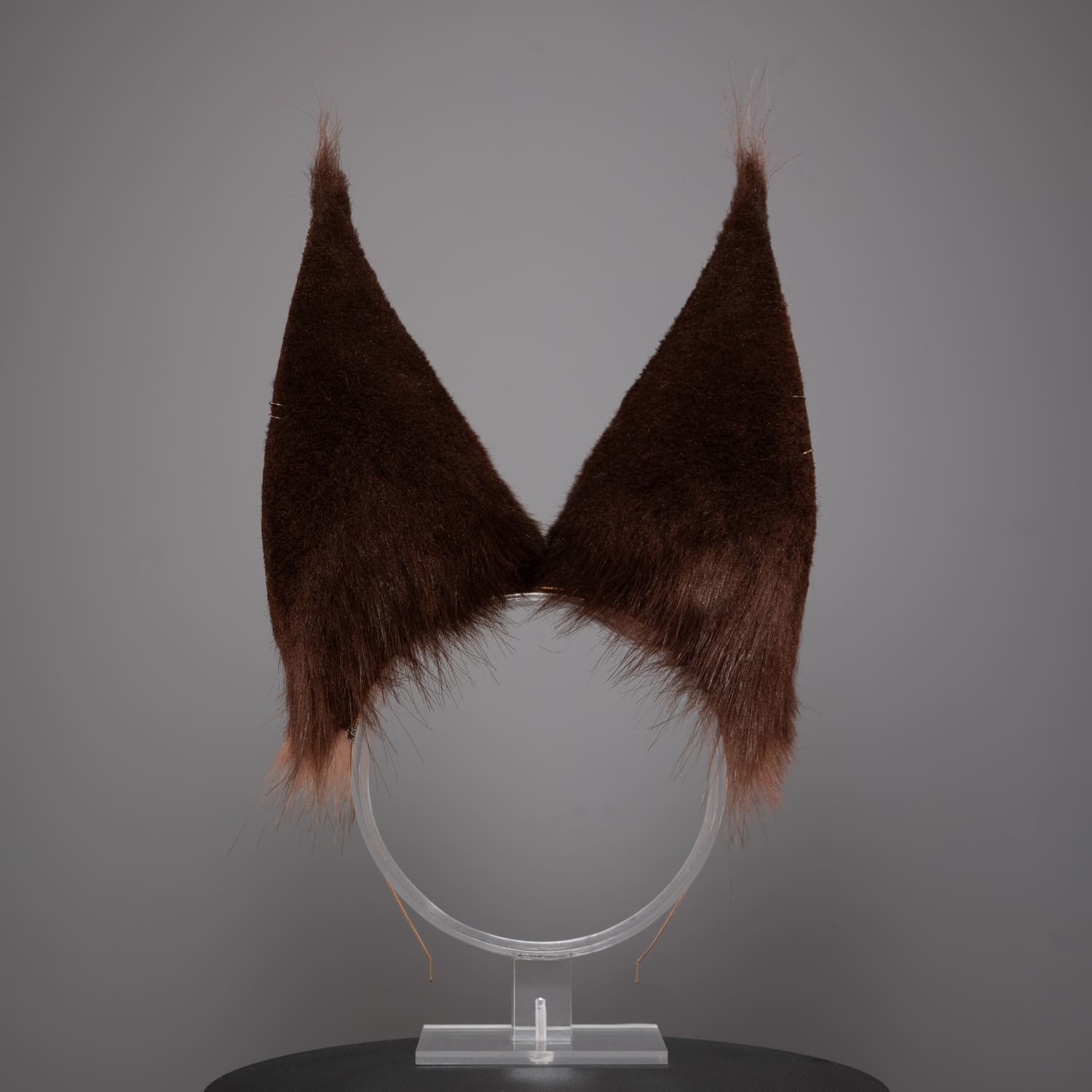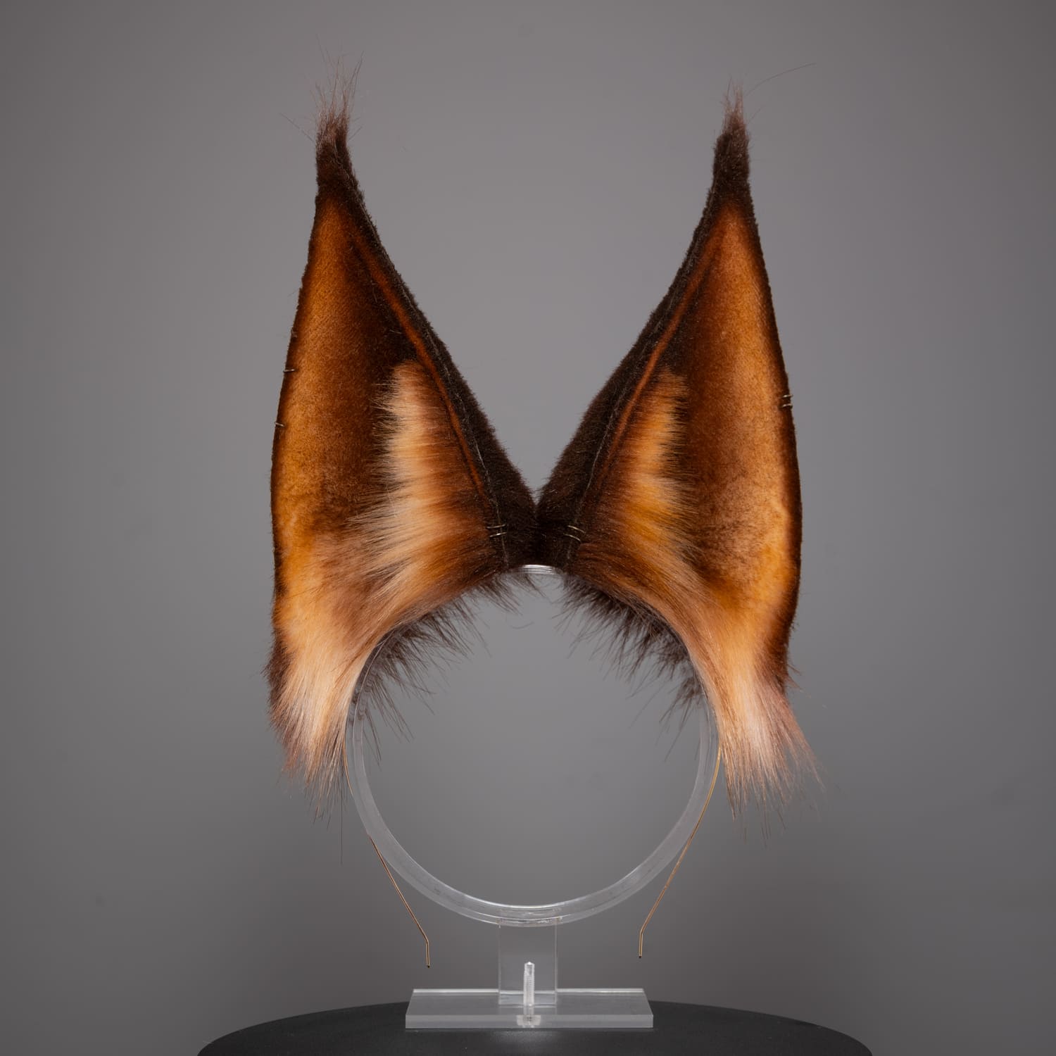 Blonde and brown lynx shaped ears, approximately 7.5 inches, decorated with metal hoops. Ears are fully wired and posable on a metal headband. Made of luxury quality faux fur.