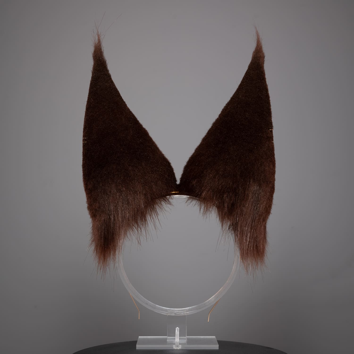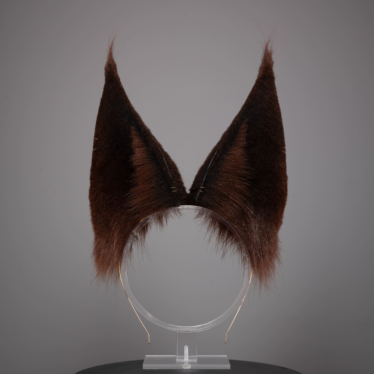 Brown lynx shaped ears, approximately 7.5 inches, decorated with metal hoops. Ears are fully wired and posable on a metal headband. Made of luxury quality faux fur.