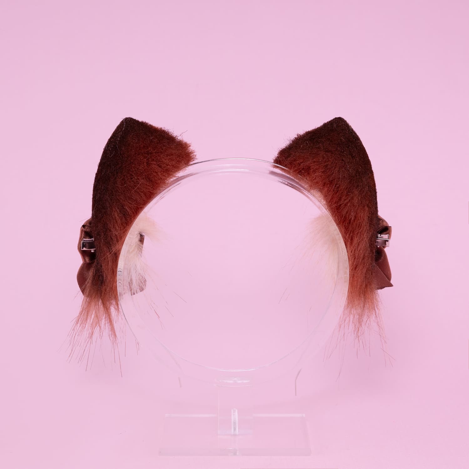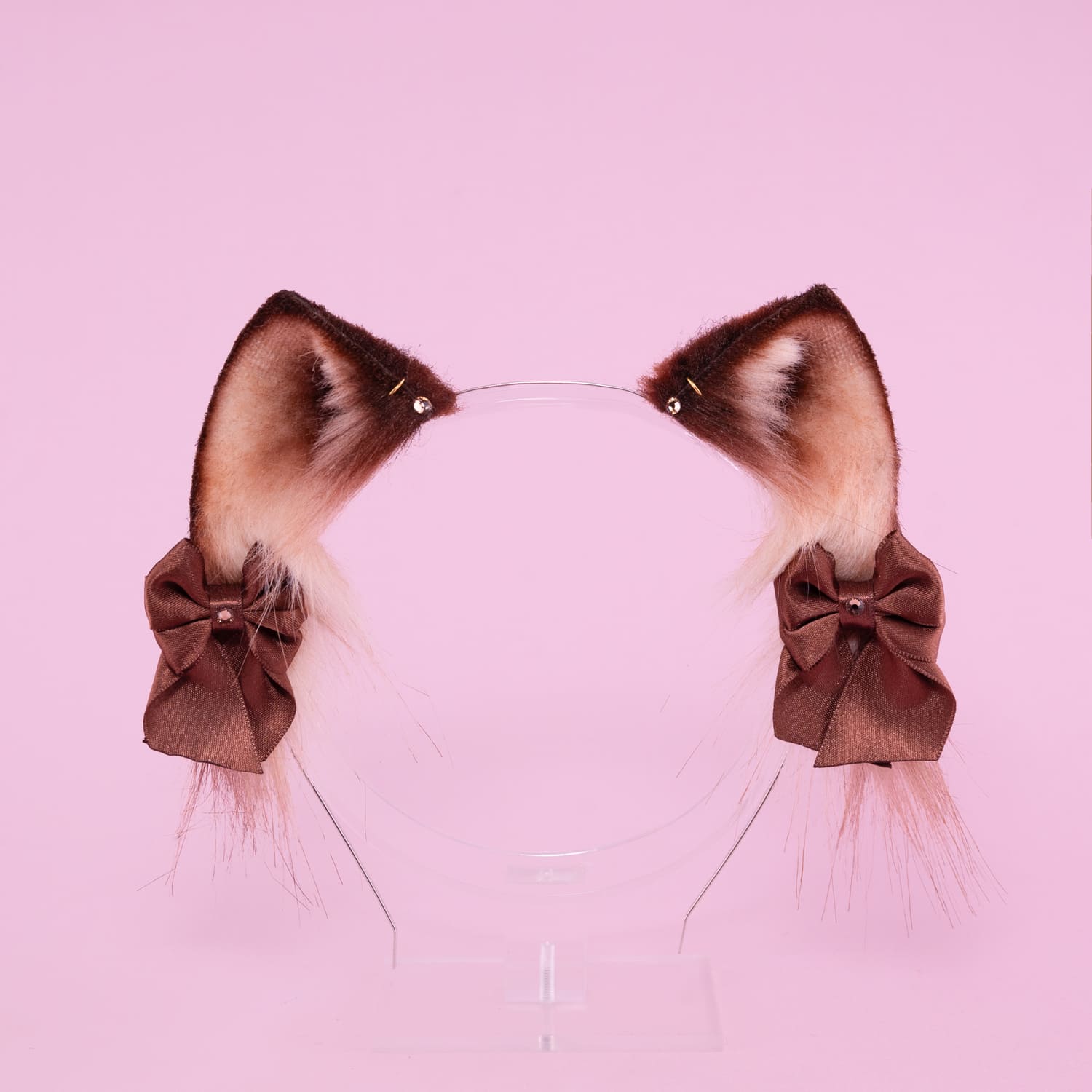 Brown kitten shaped ears, approximately 2 inches, decorated with rhinestones, metal hoops and cute bows. Ears are fully wired and posable on a metal headband. Made of luxury quality faux fur and crystals.