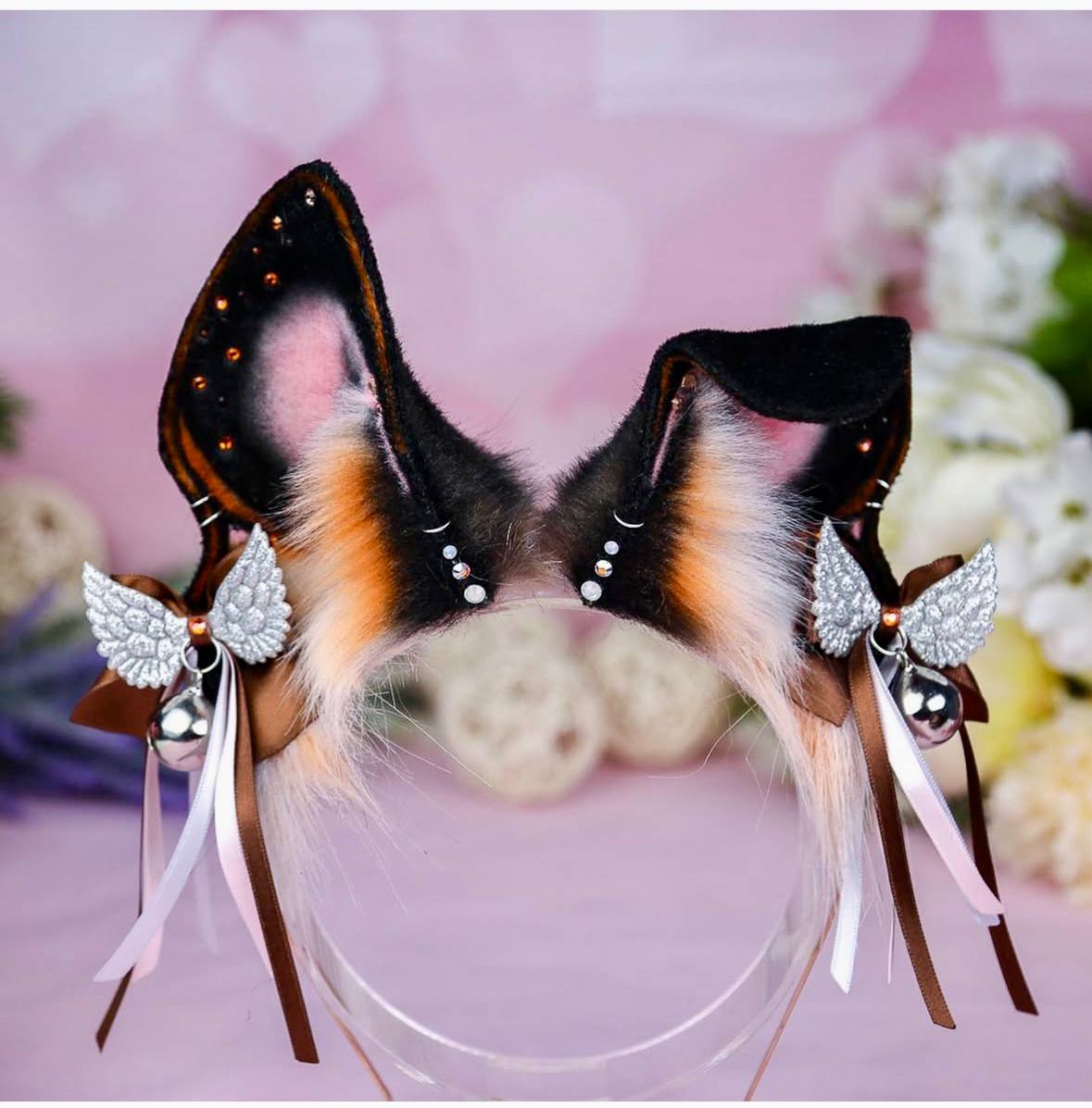 Ears are fully wired and posable on a metal headband. Approximately 3,5 inches tall. We use luxury quality faux fur and crystals. Ears are decorated with piercing hoops and removable bow on little alligator clips with bell.