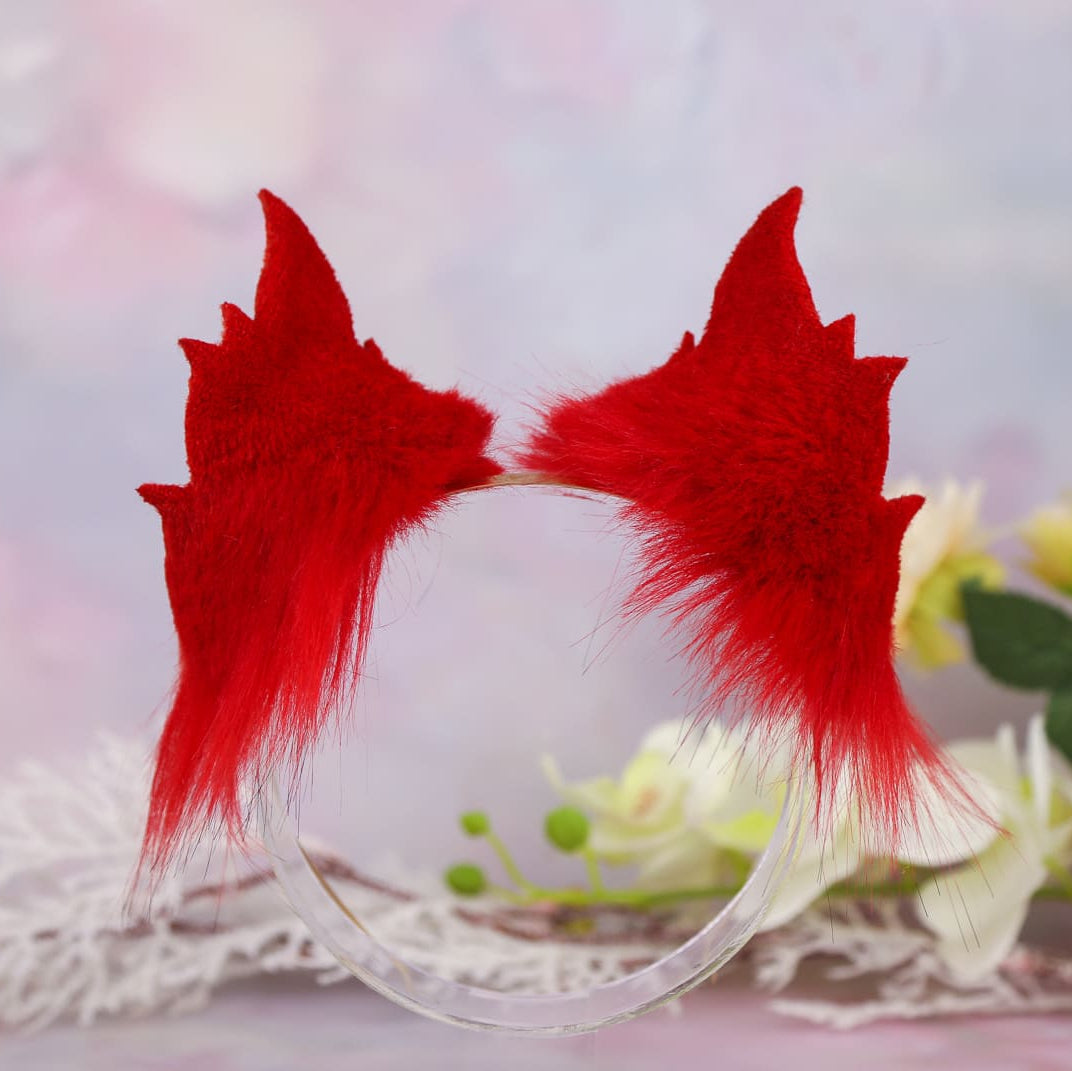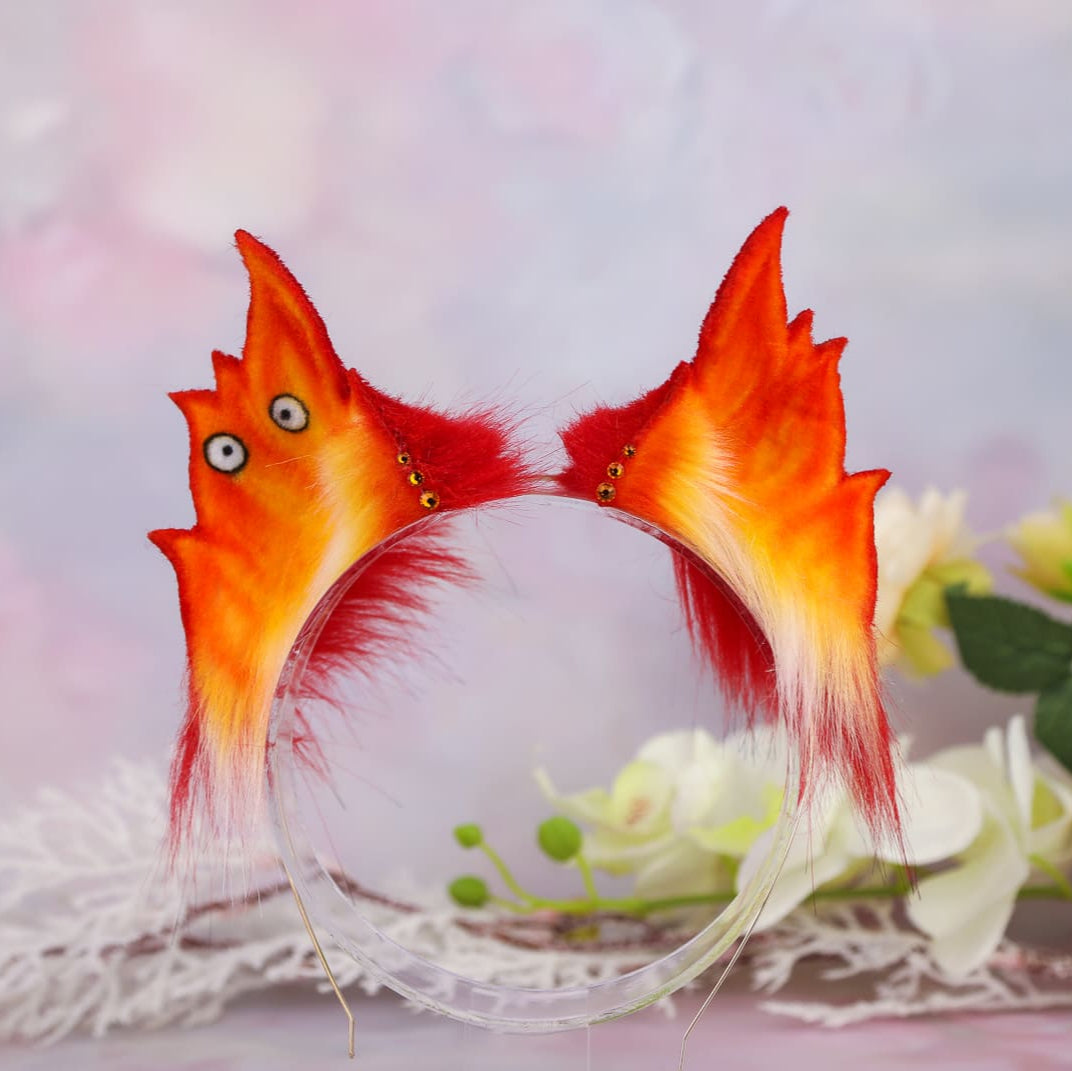 Orange ears, approximately 2.5 inches, decorated with rhinestones and airbrushing. Ears are fully wired and posable on a metal headband. Made of luxury quality faux fur and crystals.