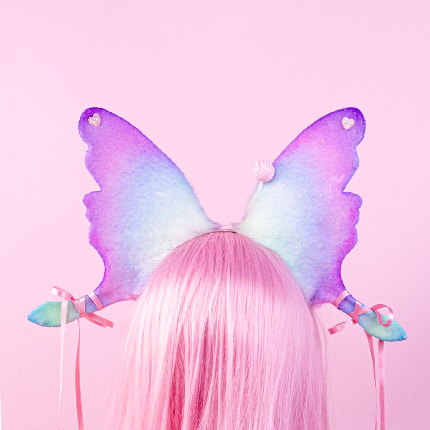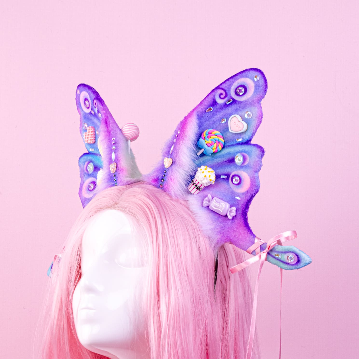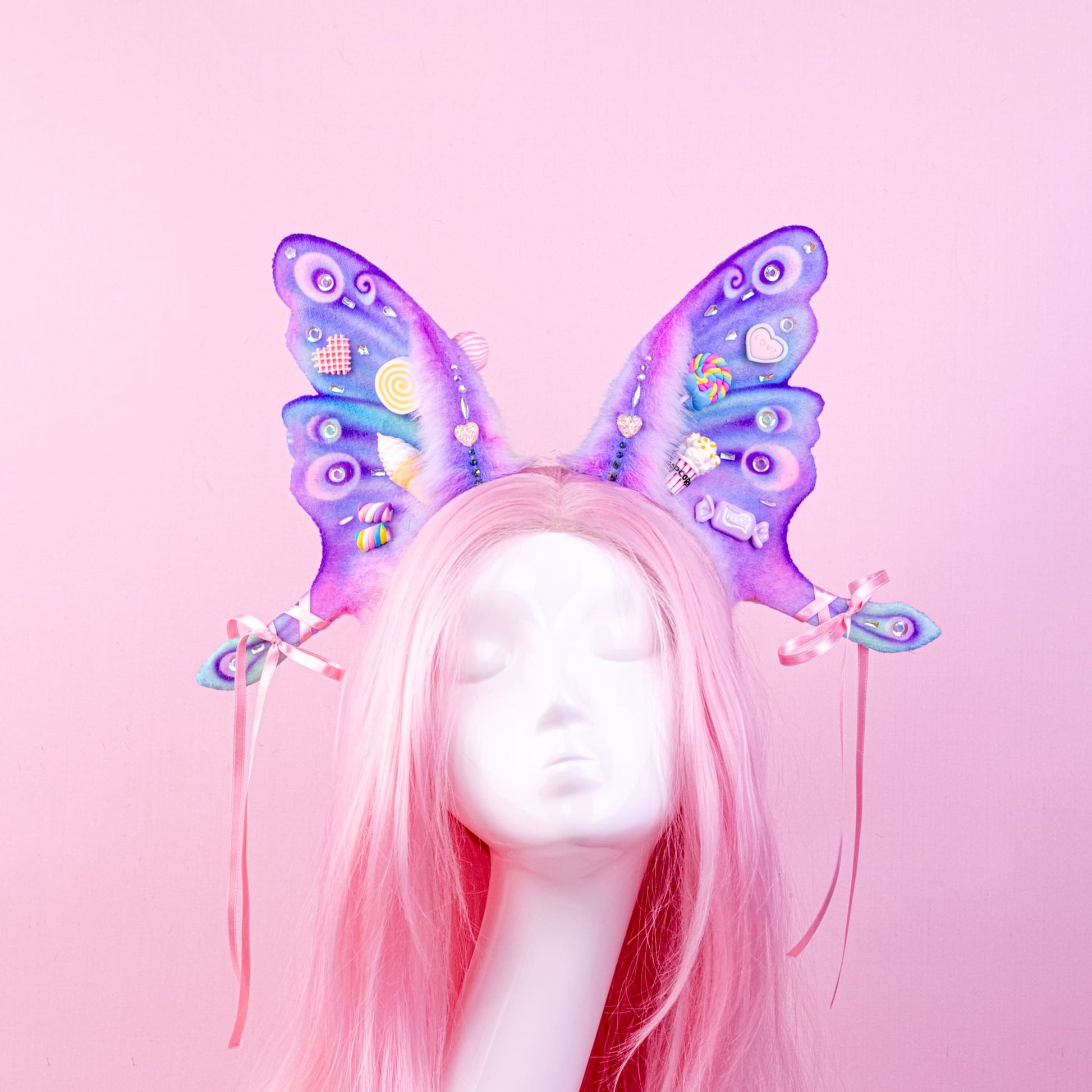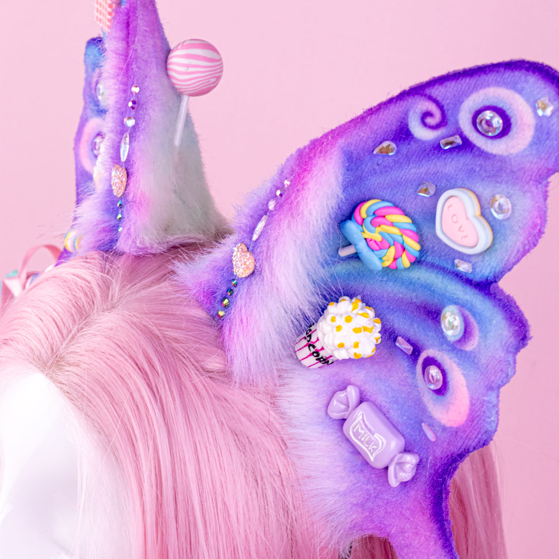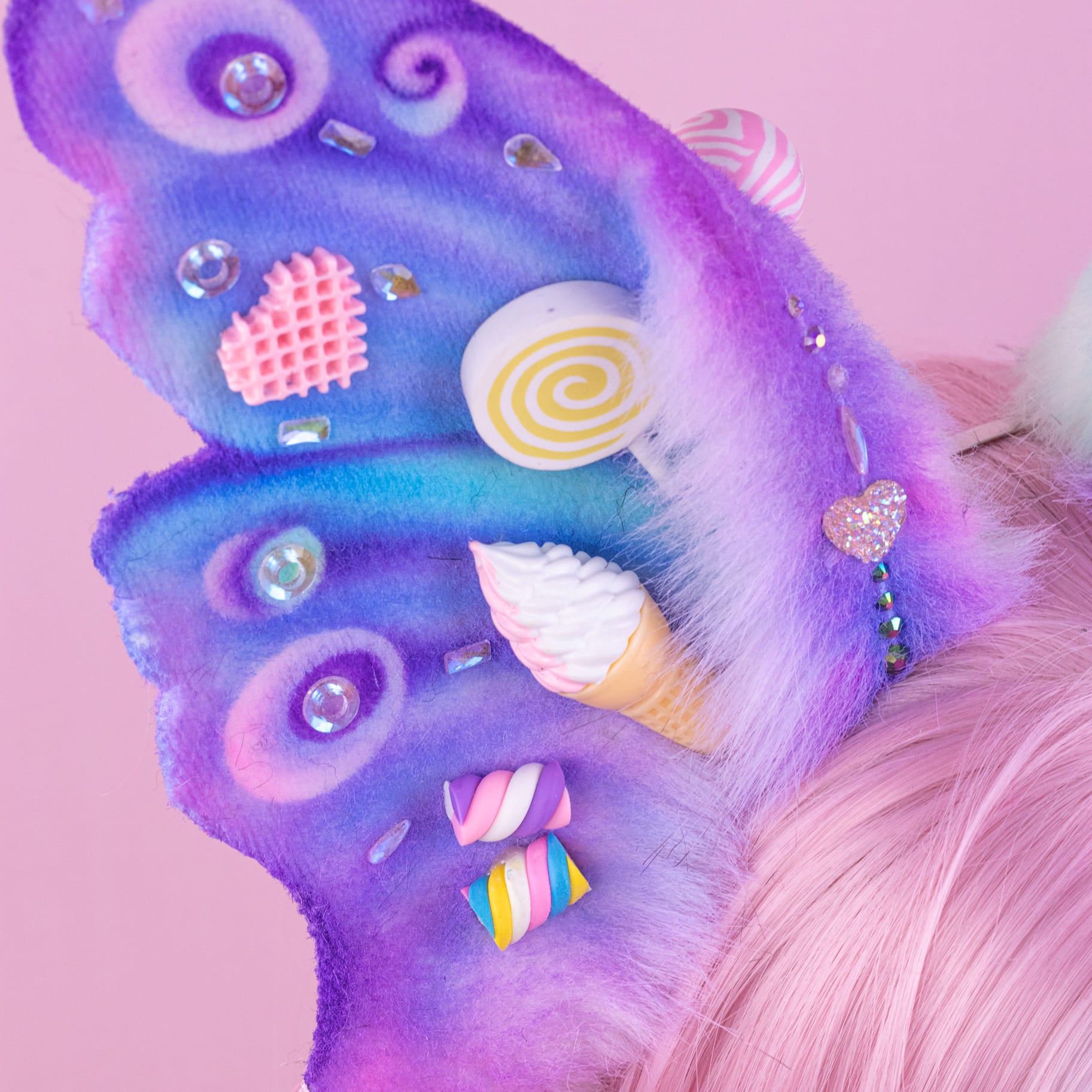 Pink and lilac ears, approximately 8 inches, decorated with rhinestones, airbrushing and cute sweets decor. Ears are fully wired and posable on a metal headband. Made of luxury quality faux fur and crystals.