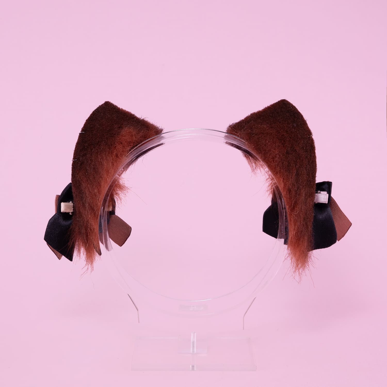 Brown kitten shaped ears, approximately 2 inches, decorated with rhinestones, metal hoops and cute bows. Ears are fully wired and posable on a metal headband. Made of luxury quality faux fur and crystals.