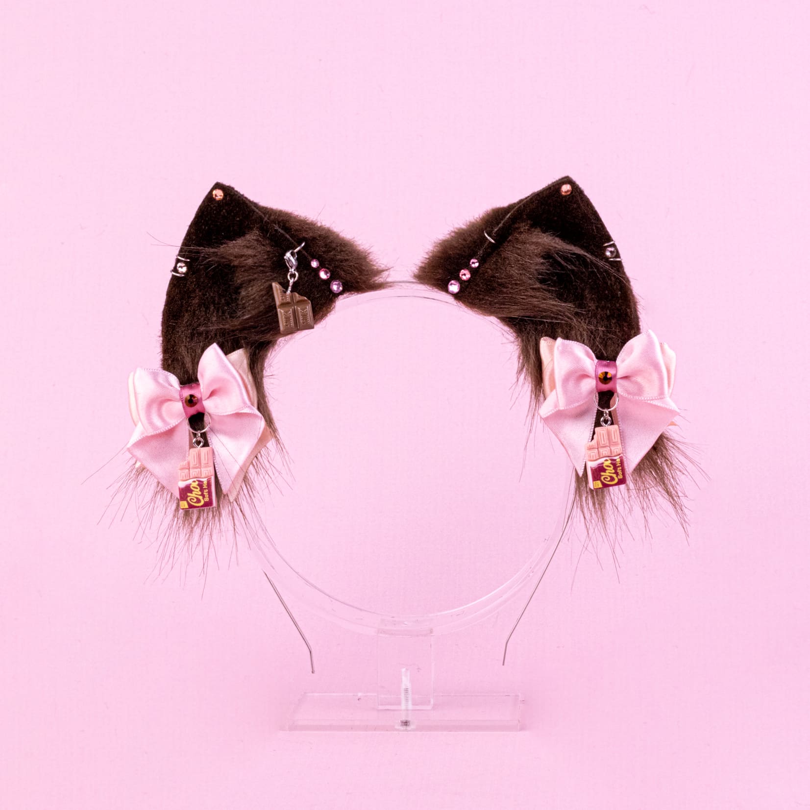 Brown kitten shaped ears, approximately 2,5 inches, decorated with piercing, rhinestones, pendants and removable bows on little alligator clips with pendants. Ears are fully wired and posable on a metal headband. Made of luxury quality faux fur and crystals.