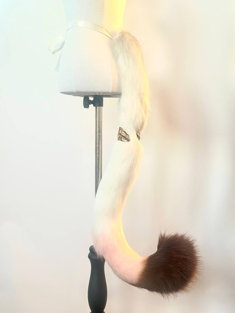 Kitten shaped tail, approximately 30 inches, decorated with airbrushing. Tail is attached by an elastic belt loop and a doublesided ribbon. Made of luxury quality faux fur.