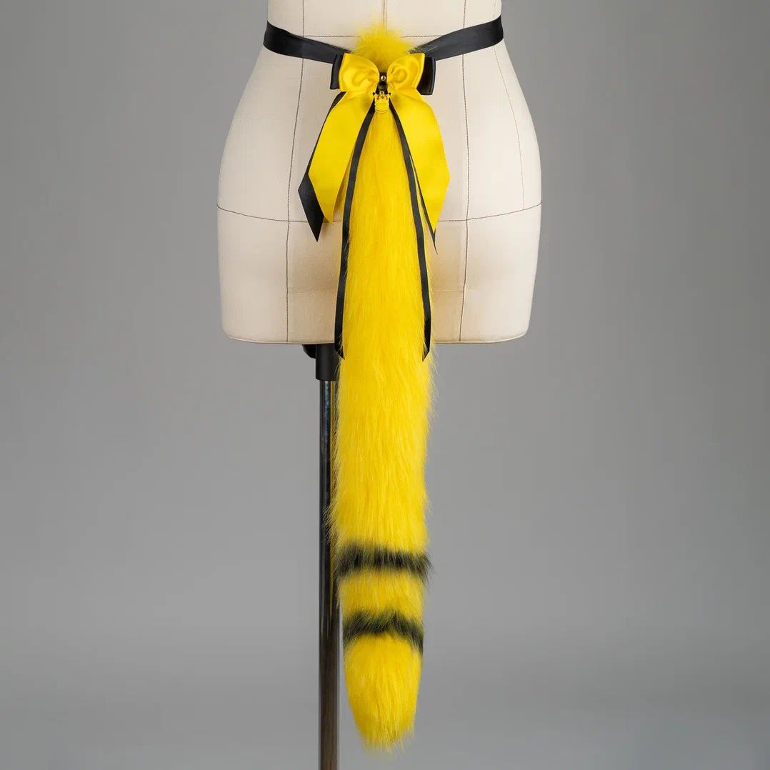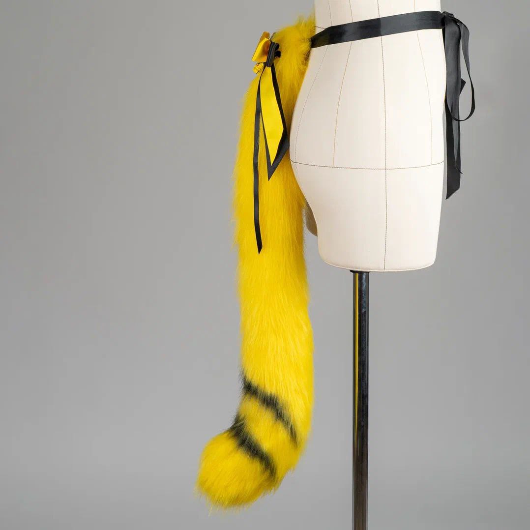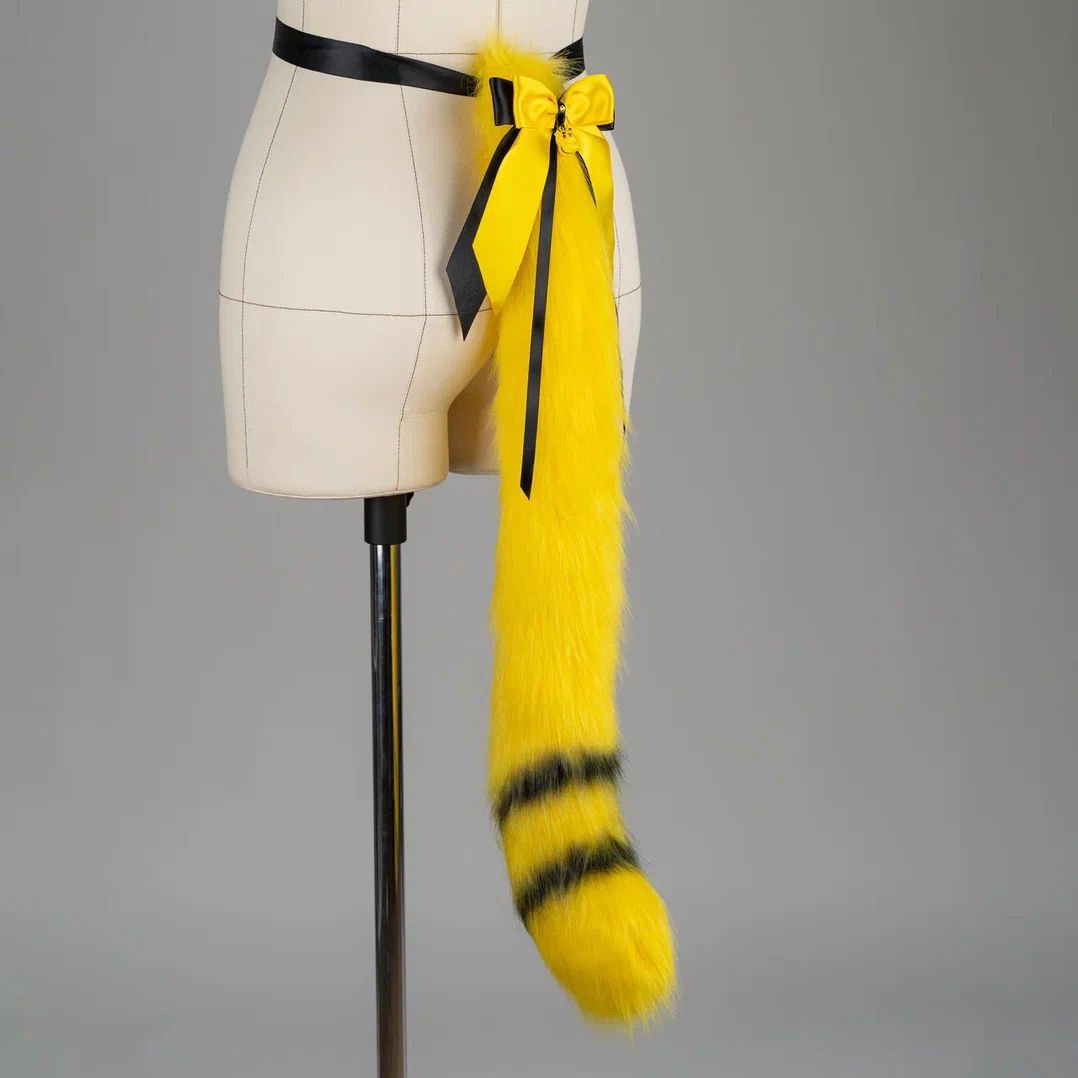 Yellow and black kitten shaped tail, approximately 30 inches, decorated with airbrushing and a bow with a pendant. Tail is attached by an elastic belt loop and a doublesided ribbon. Made of luxury quality faux fur.