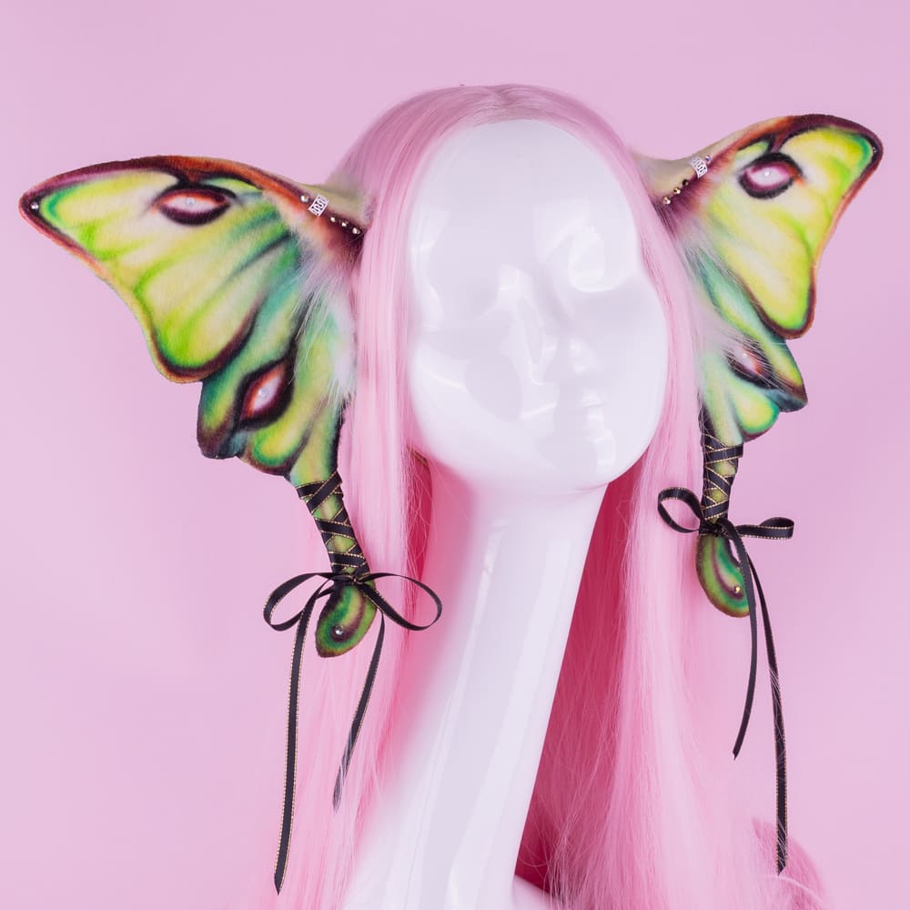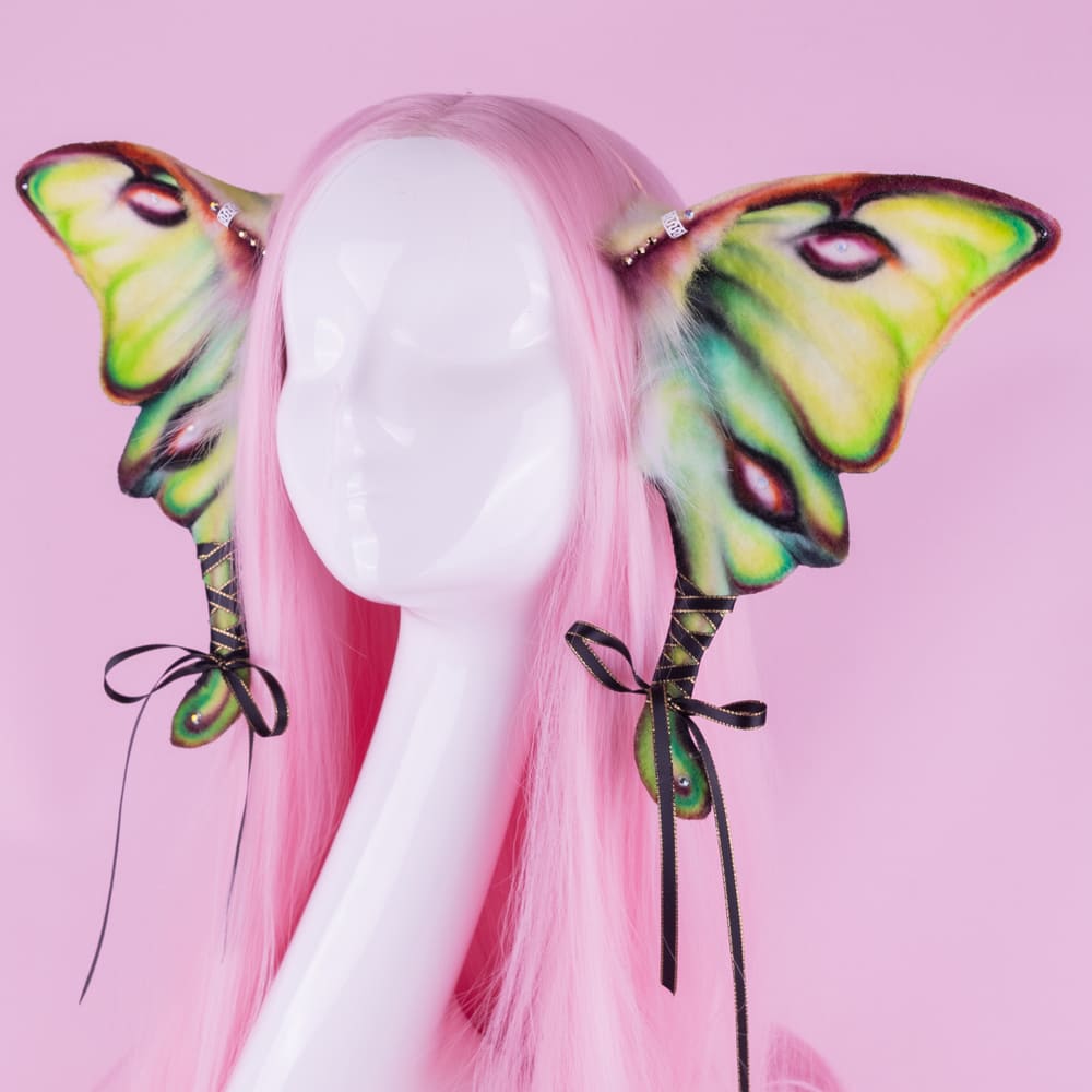Green and yellow butterfly ears, approximately 9.5 inches, decorated with airbrushing, piercing, rhinestones and ribbons. Ears are fully wired and posable on a metal headband. Made of luxury quality faux fur and crystals.
