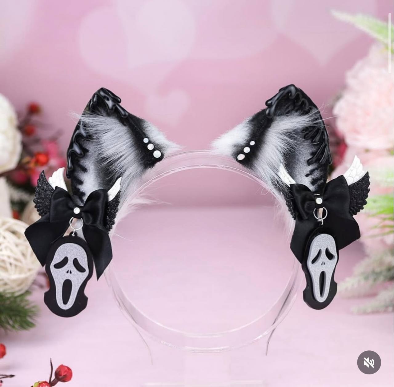 Black cat shaped ears, approximately 2.25 inches, decorated with metal hoops and bows. Ears are fully wired and posable on a metal headband. Made of luxury quality faux fur.
