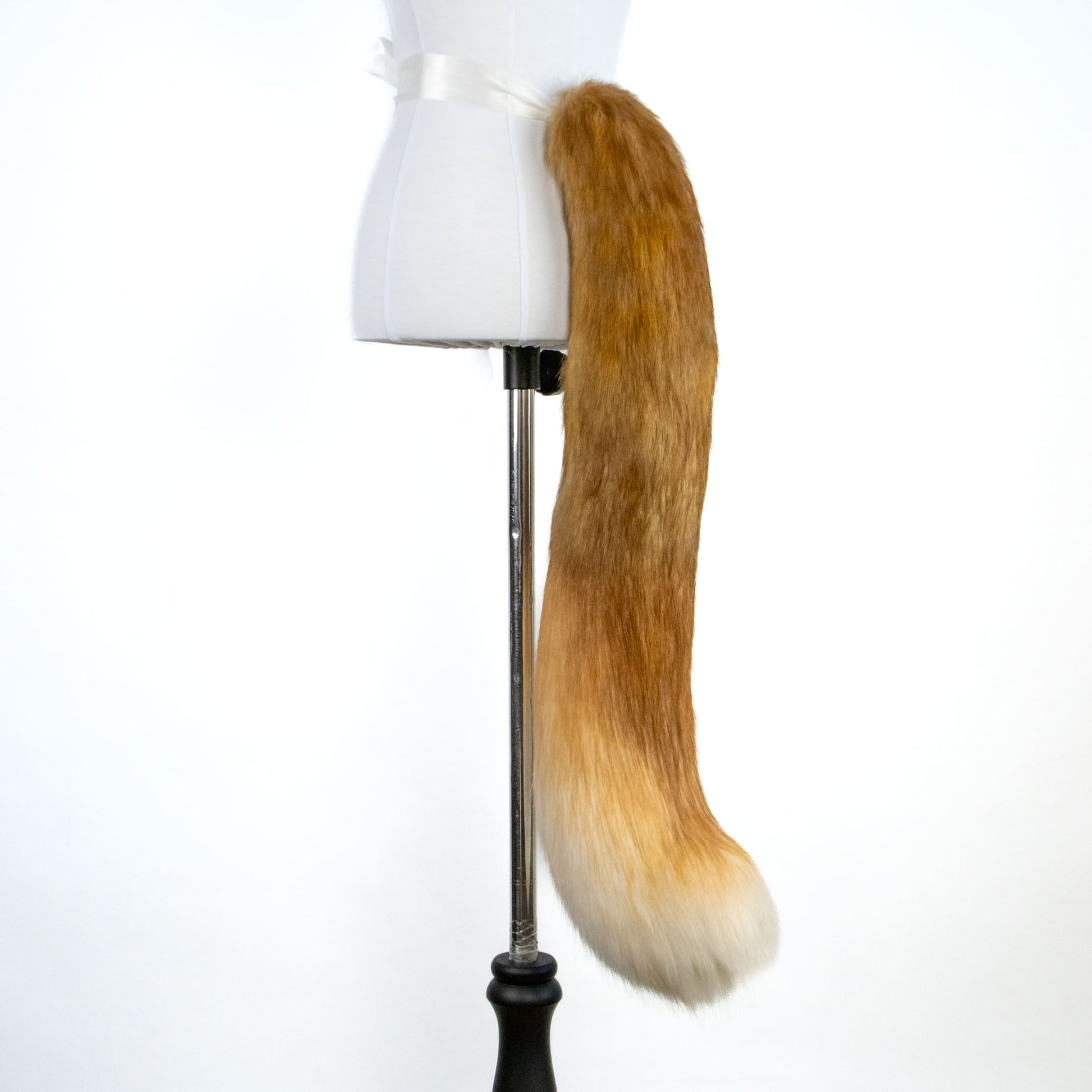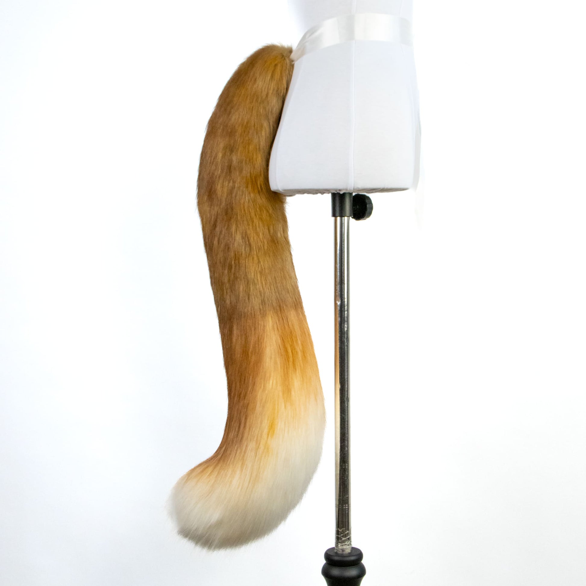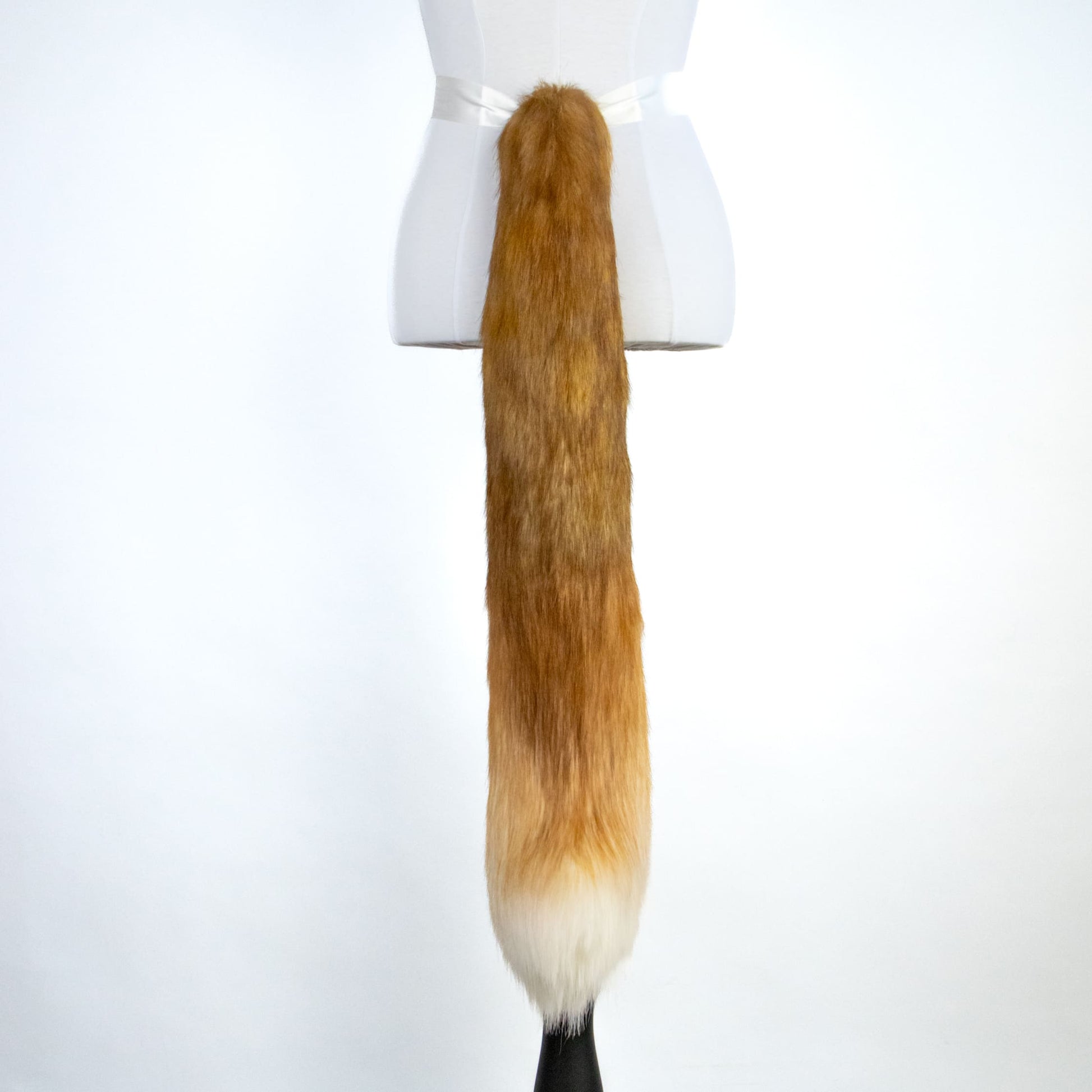 Golden tail, approximately 30 inches, decorated with airbrushing. Tail is attached by an elastic belt loop and a doublesided ribbon. Made of luxury quality faux fur.