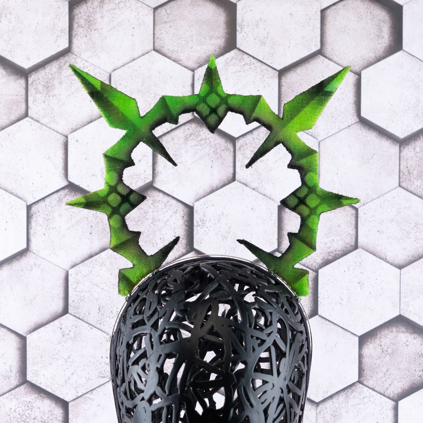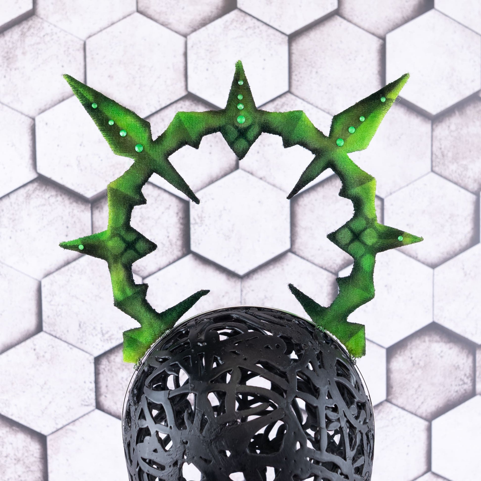 Green Halo headband, approximately 4 inches, is made of luxury quality faux fur. Inside is a steel wire frame for stability. Decorated with free hand airbrushing and rhinestones.