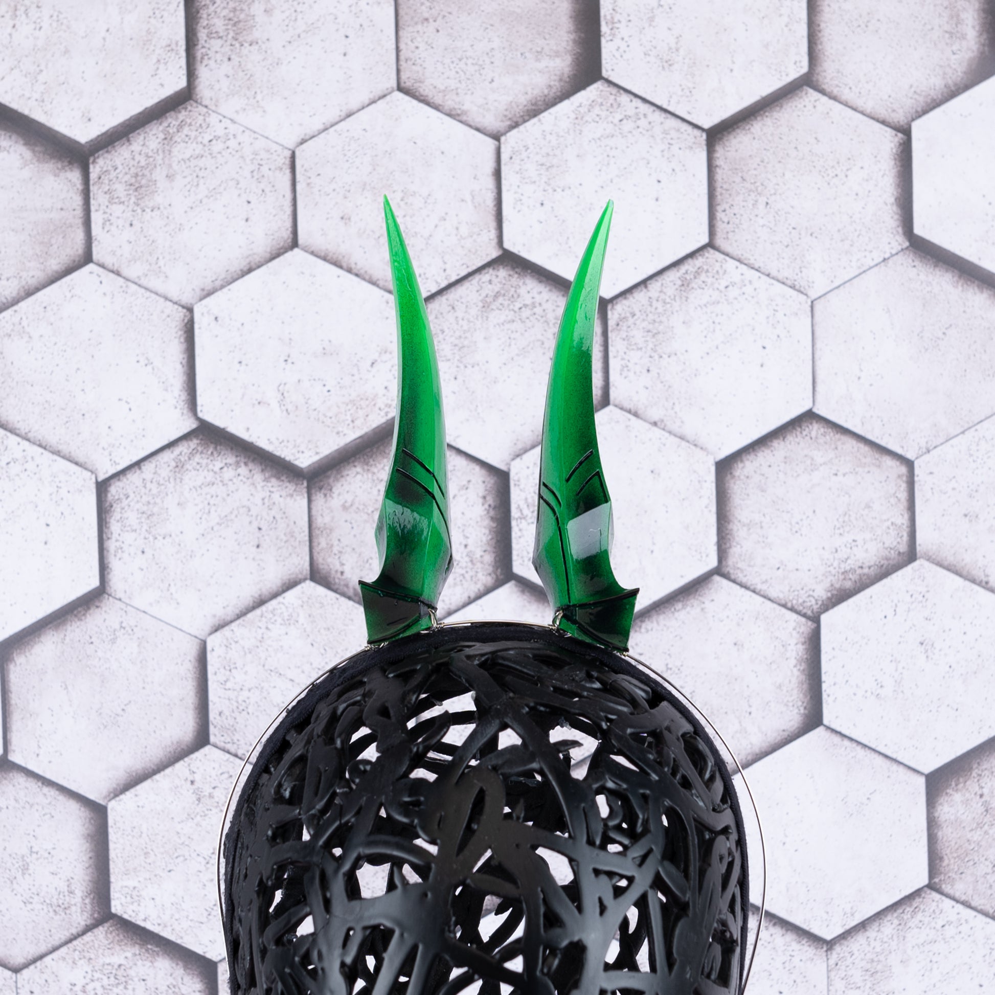 Green cyber horns. Fully wired and posable on a metal headband.