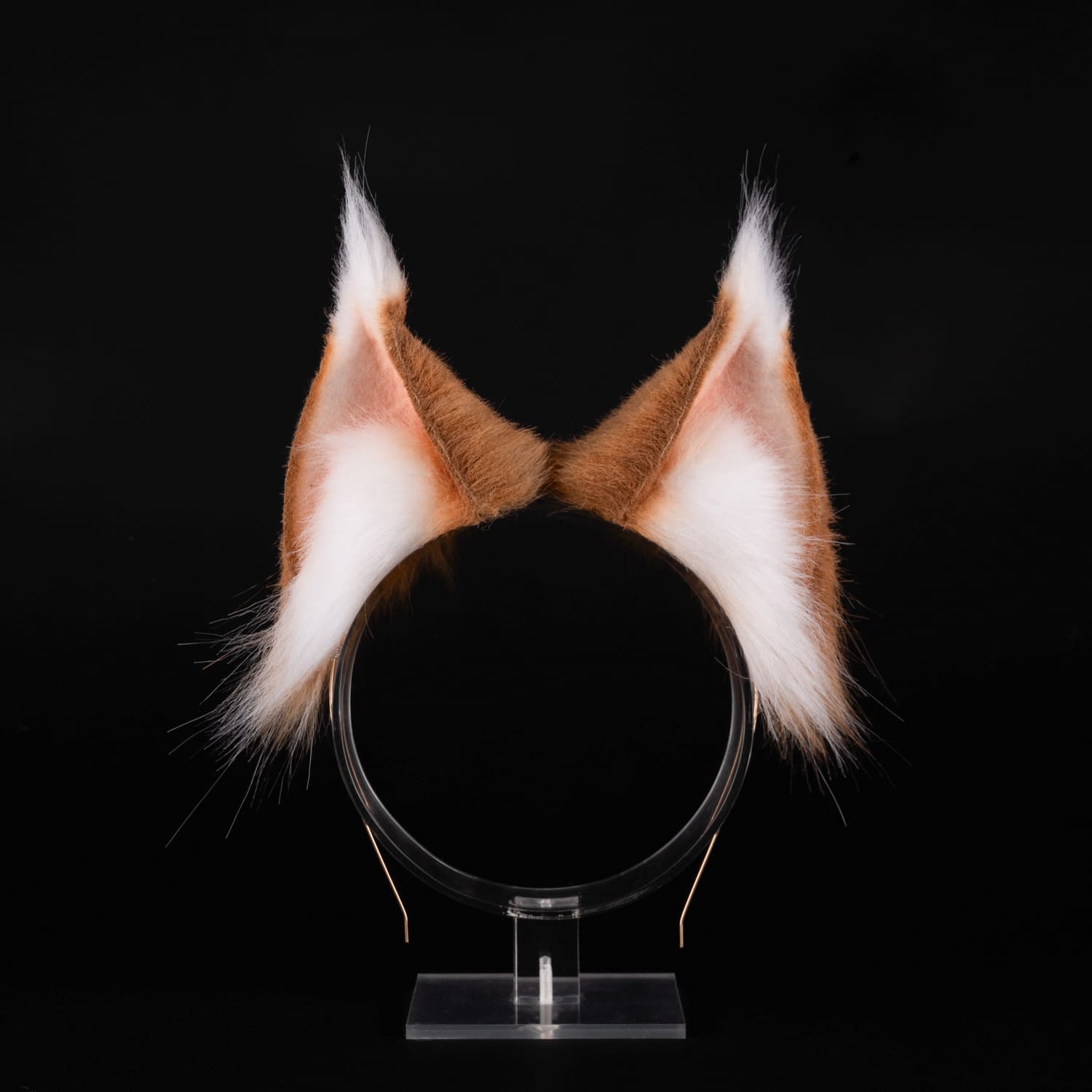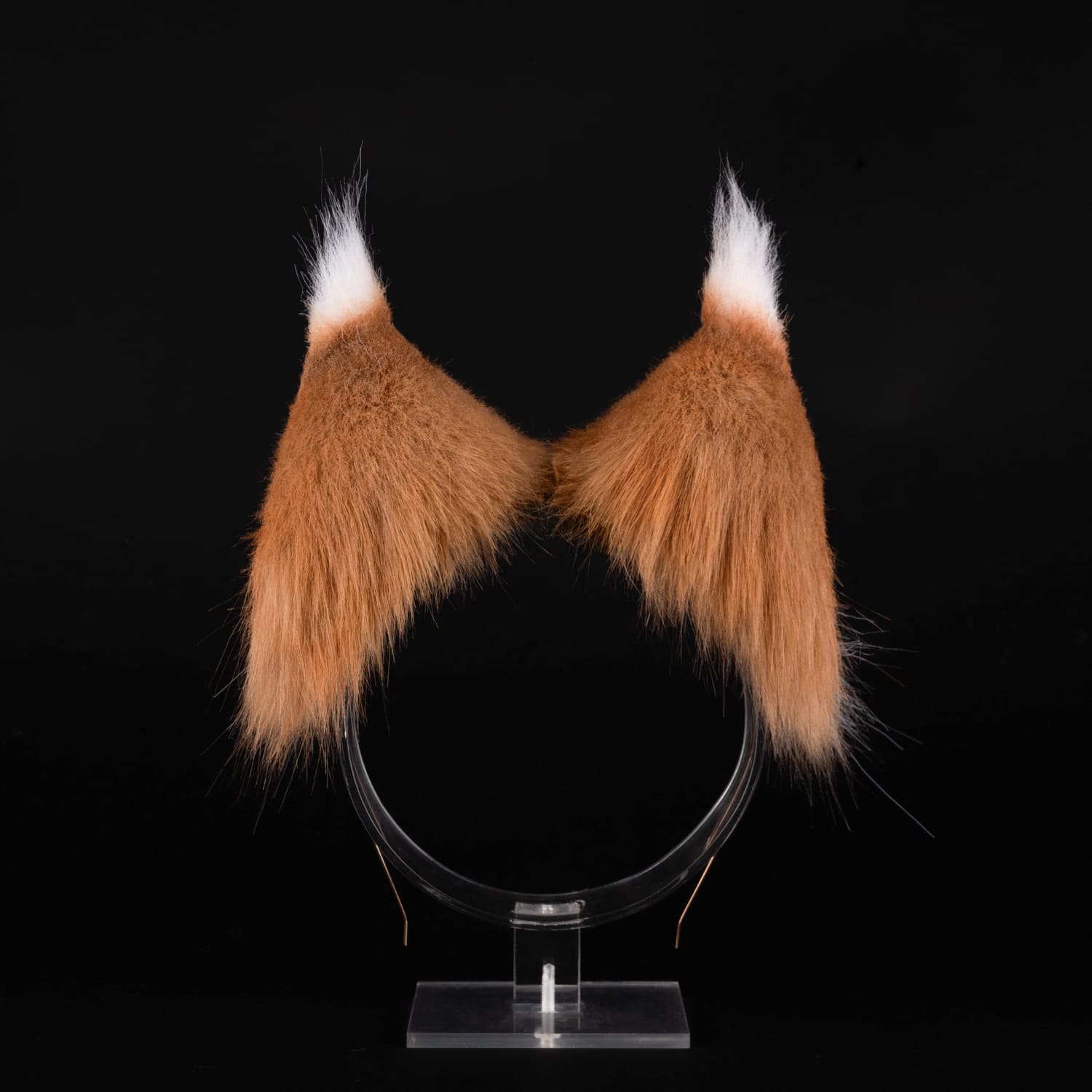 Ginger foxy shaped ears, approximately 3,5 inches, decorated with airbrushing. Ears are fully wired and posable on a metal headband. Made of luxury quality faux fur.