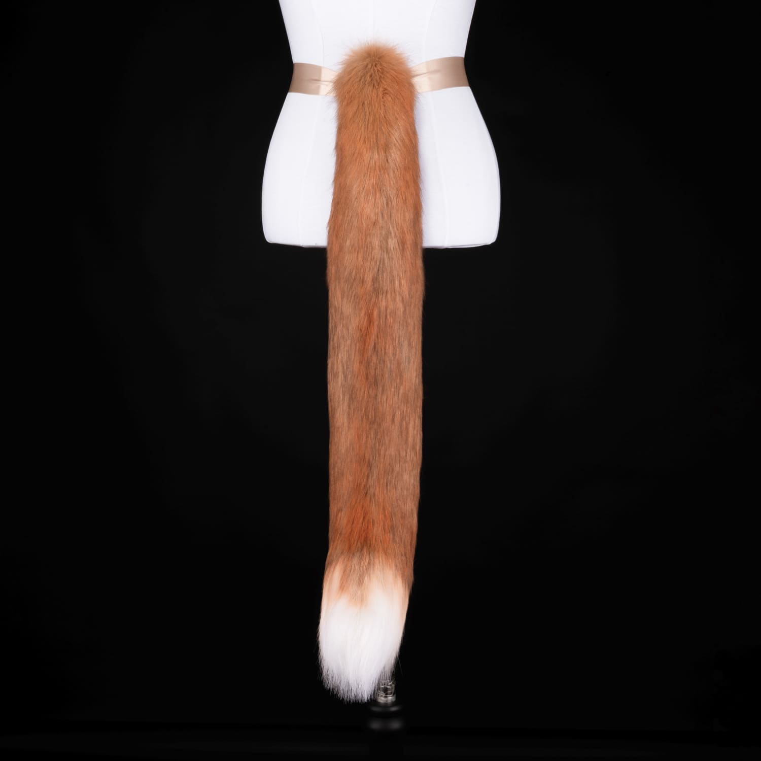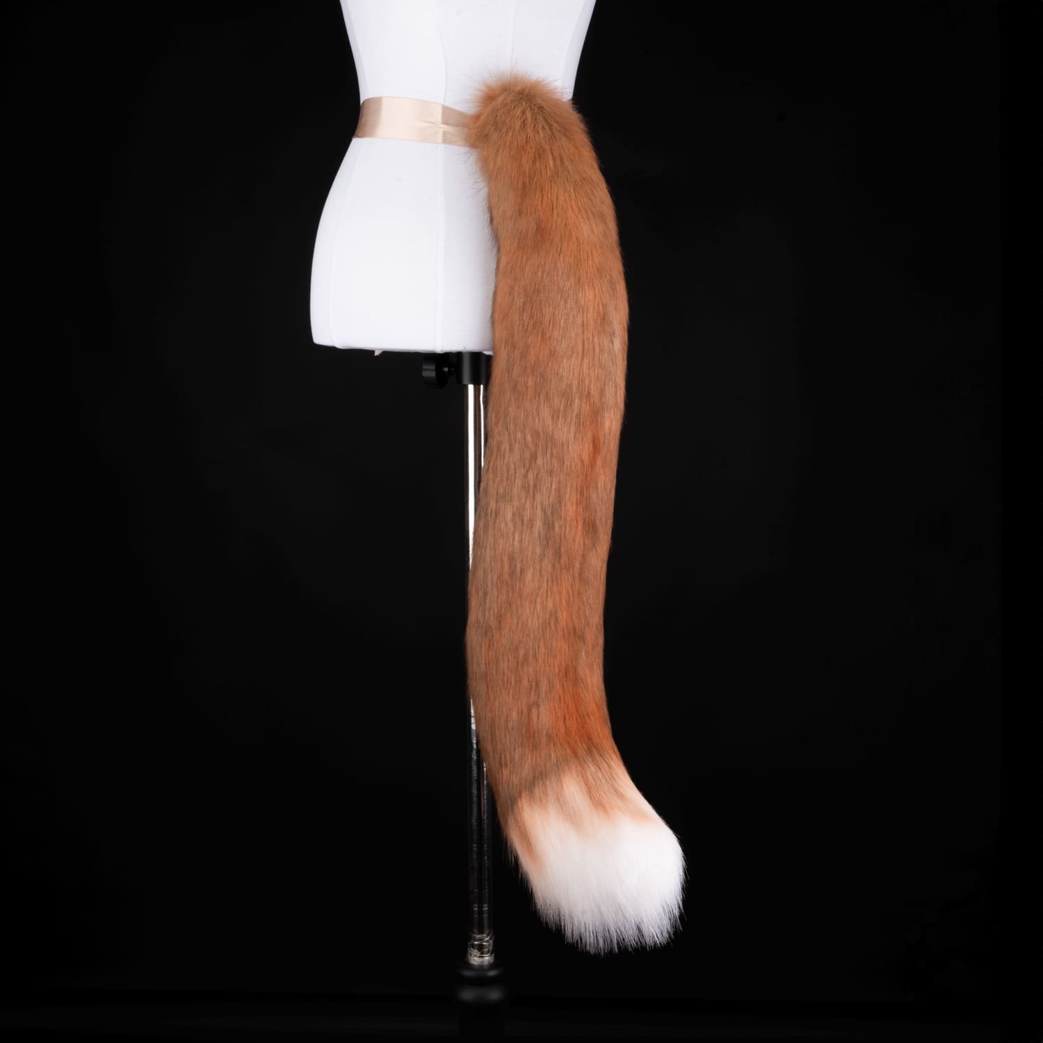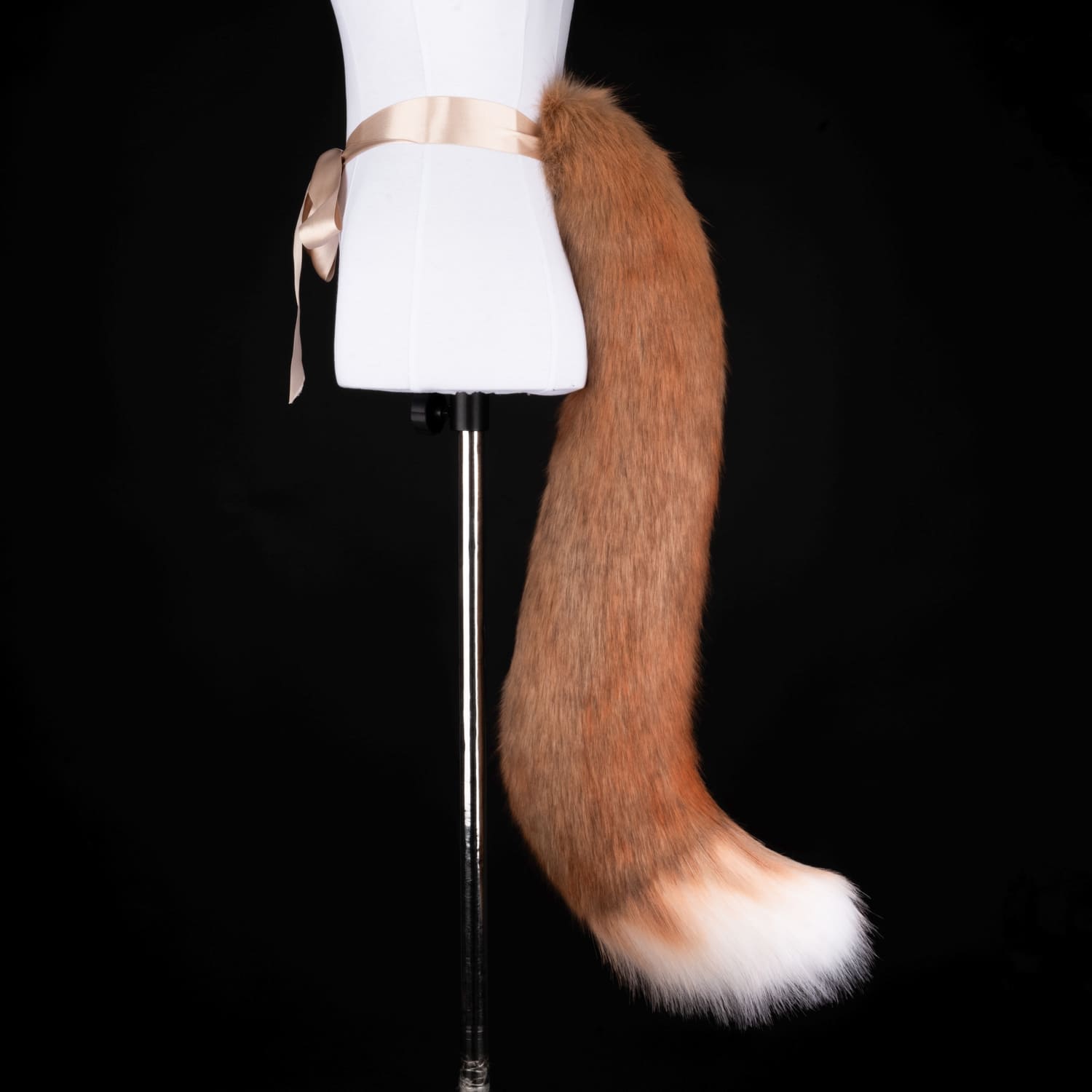 Ginger foxy shaped tail, approximately 30 inches, decorated with airbrushing. Tail is attached by an elastic belt loop and a doublesided ribbon. Made of luxury quality faux fur.