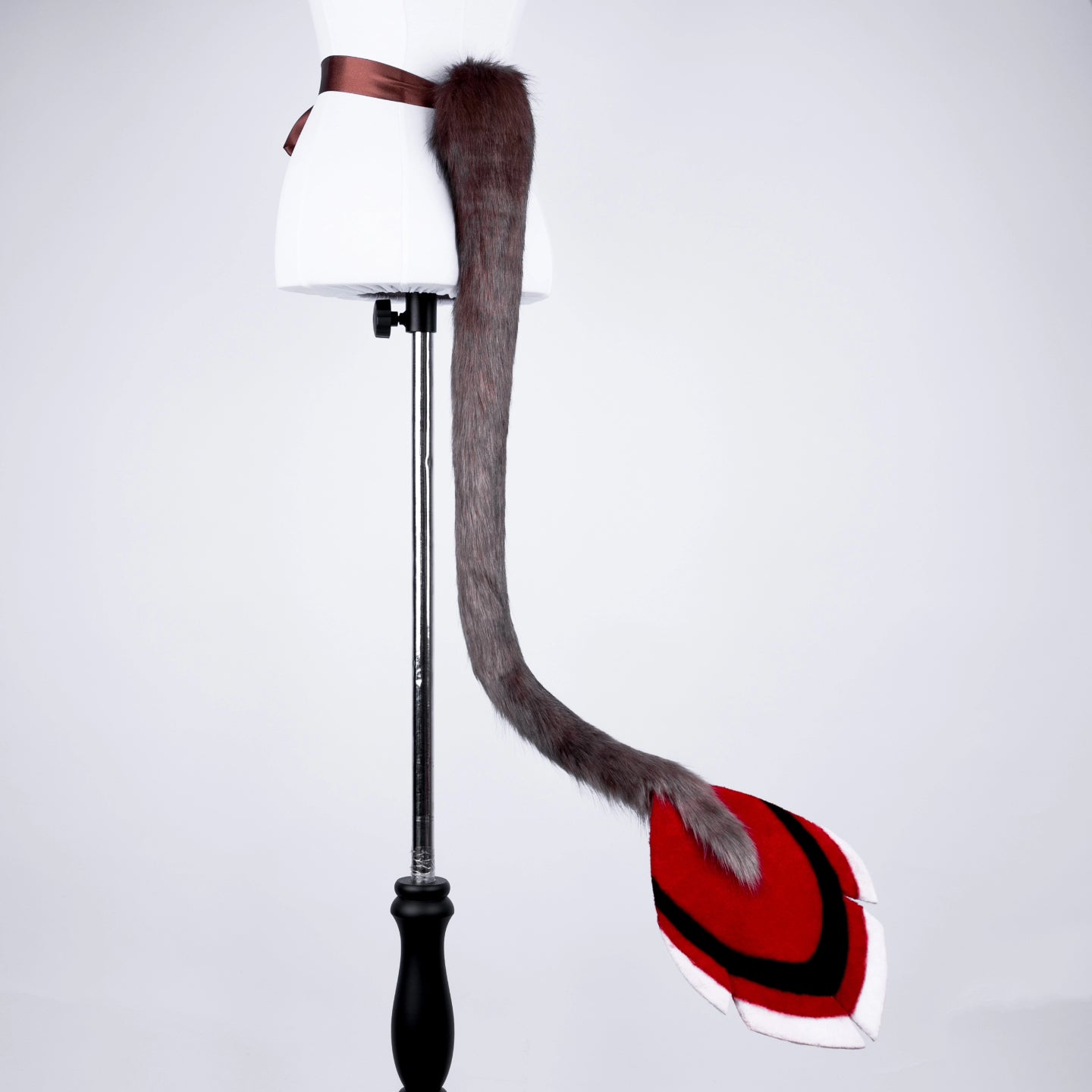 Brown tail, approximately 33 inches, decorated with airbrushing. Made of luxury quality faux fur. Attached by an elastic belt loop and a doublesided ribbon.