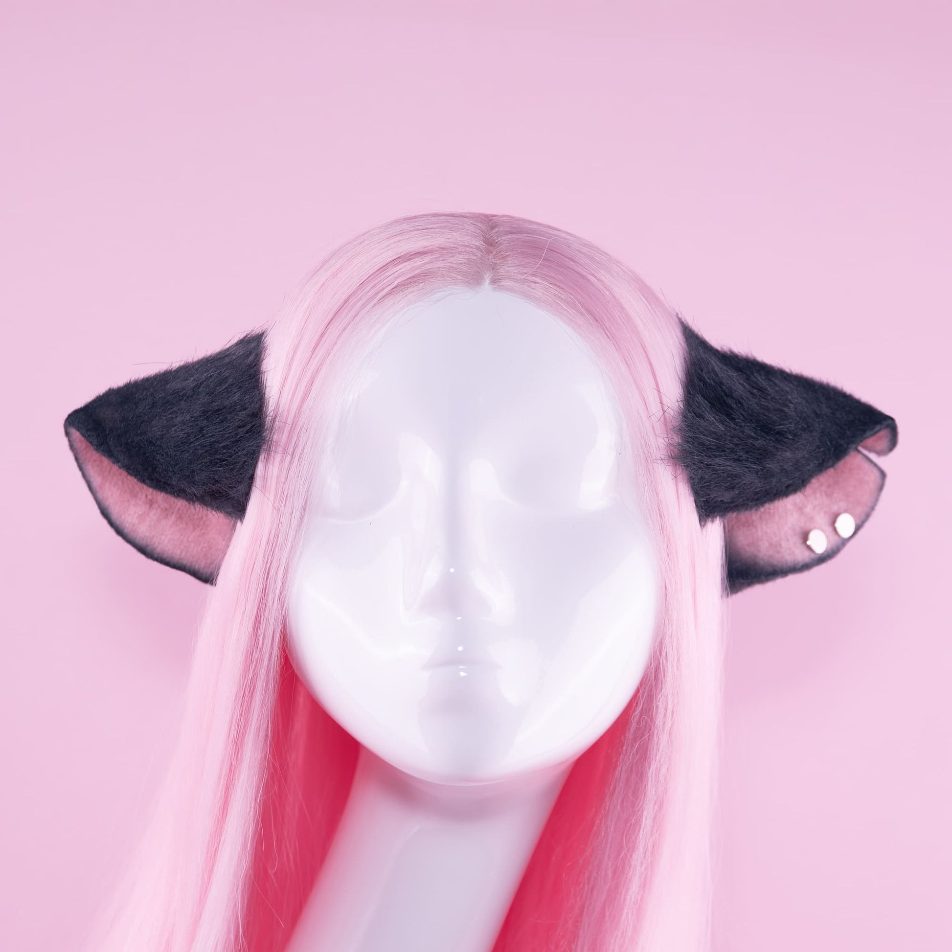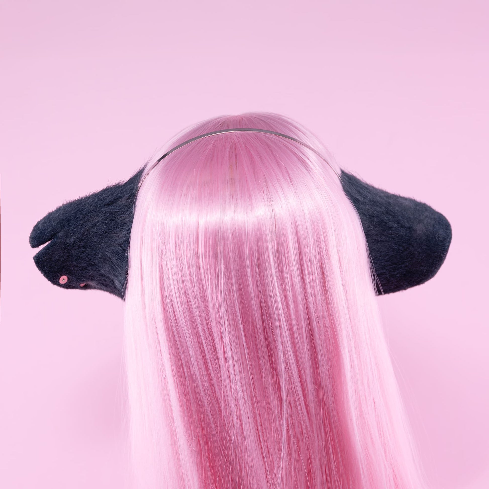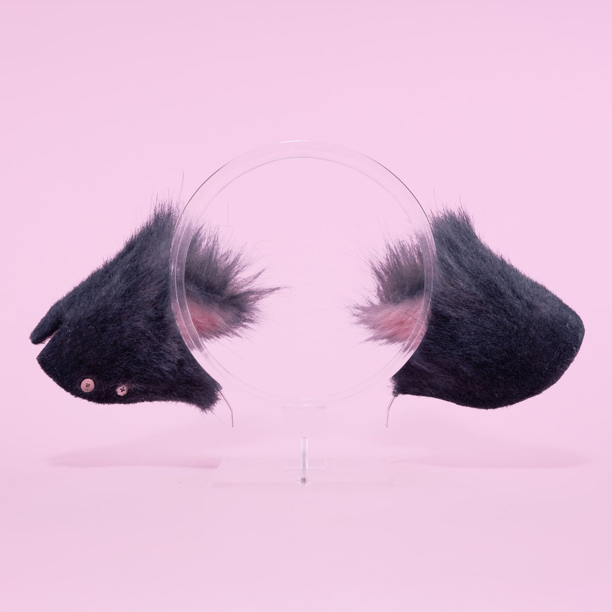 Grey rat shaped ears, approximately 2.5 inches. Ears are fully wired and posable on a metal headband. Made of luxury quality faux fur.