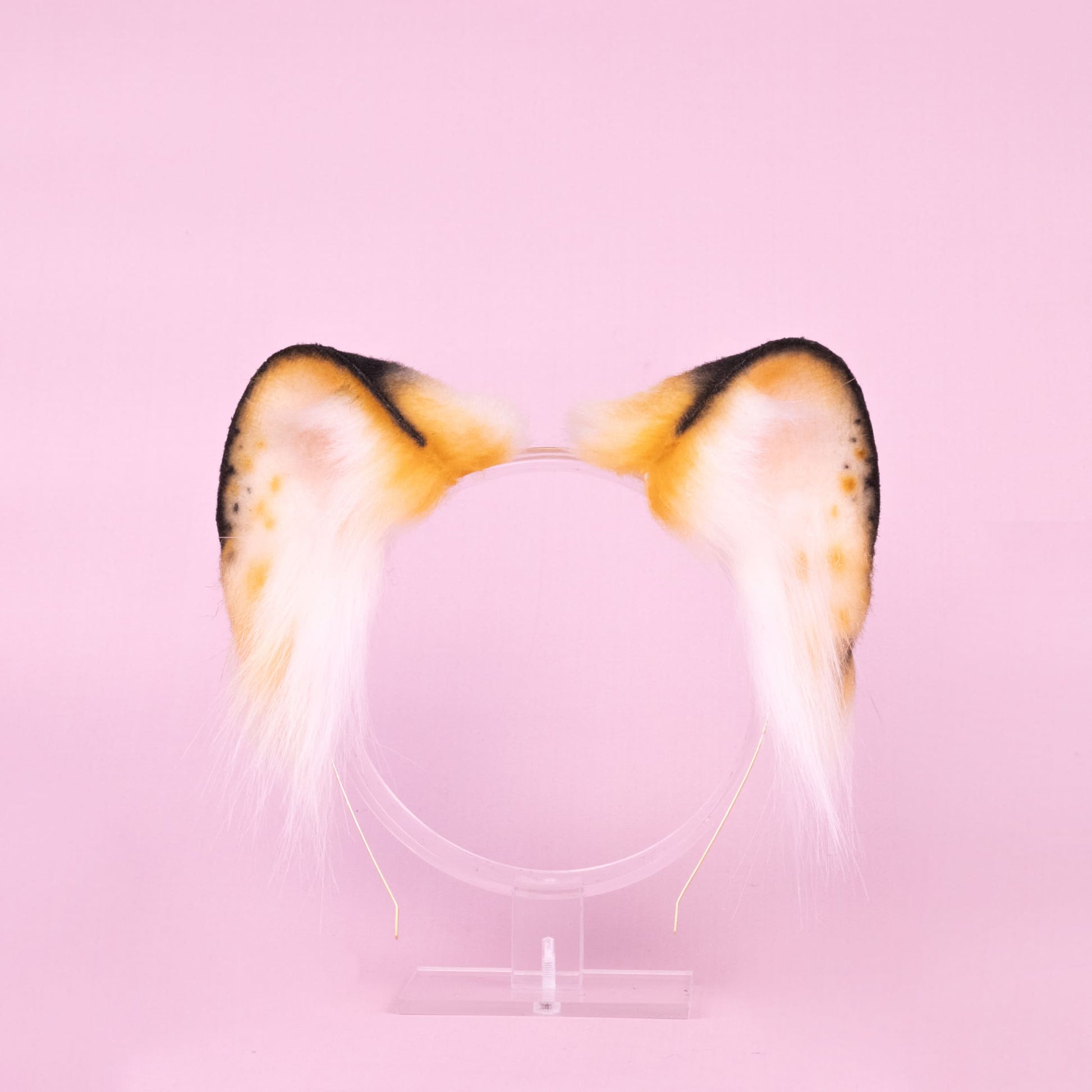 Black and orange leopard shaped ears, approximately 2.5 inches, decorated with airbrushing. Ears are fully wired and posable on a metal headband. Made of luxury quality faux fur.