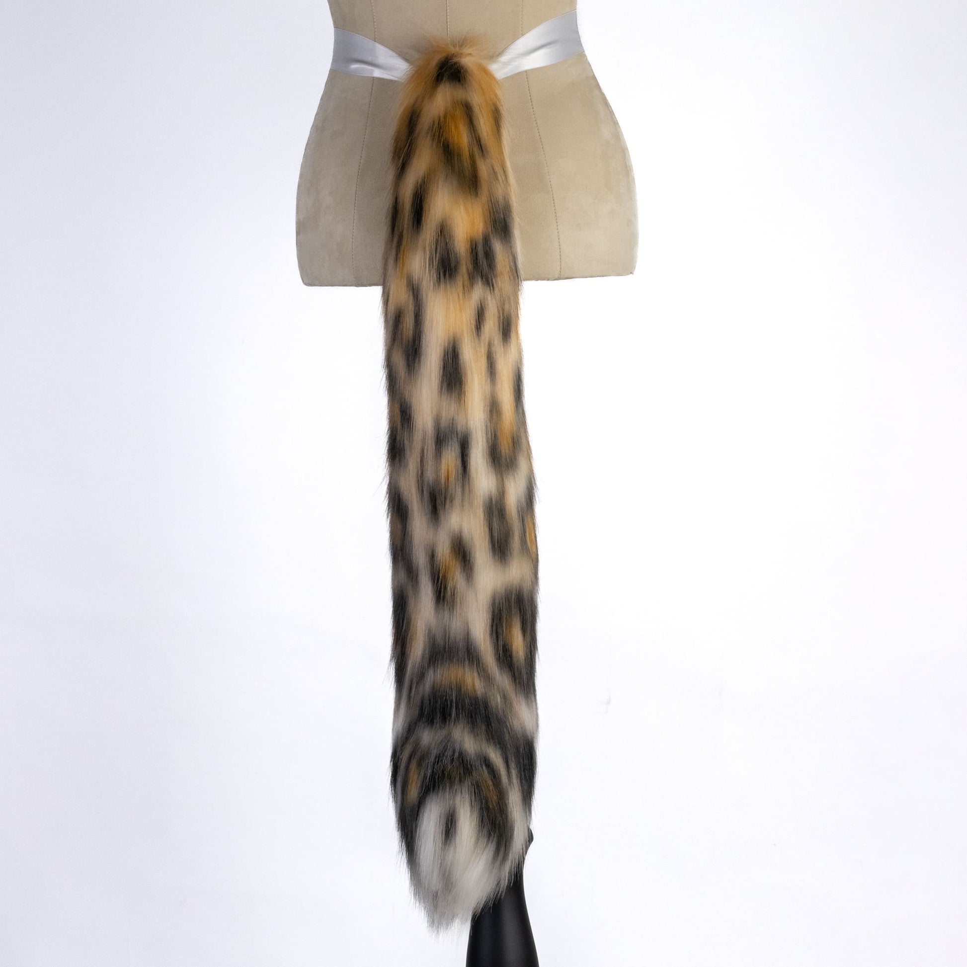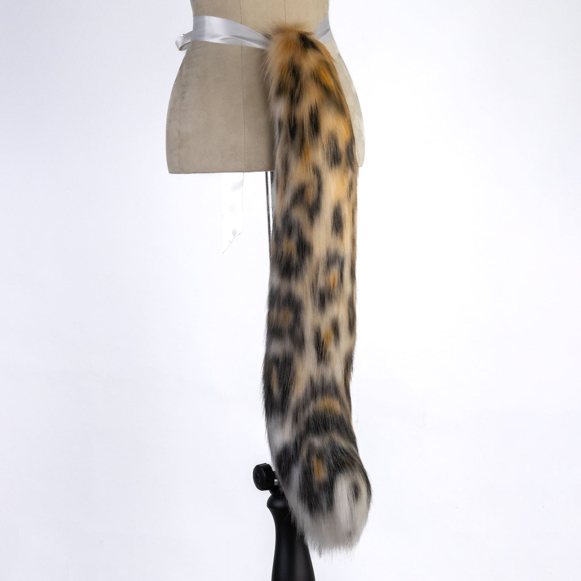 Spotted leopard shaped tail, approximately 30 inches, decorated with airbrushing. Tail is attached by an elastic belt loop and a doublesided ribbon. Made of luxury quality faux fur.