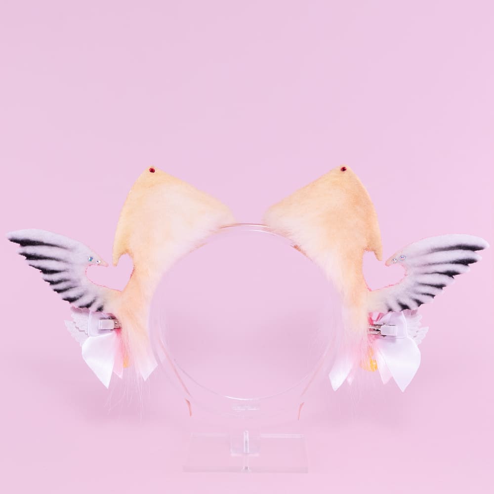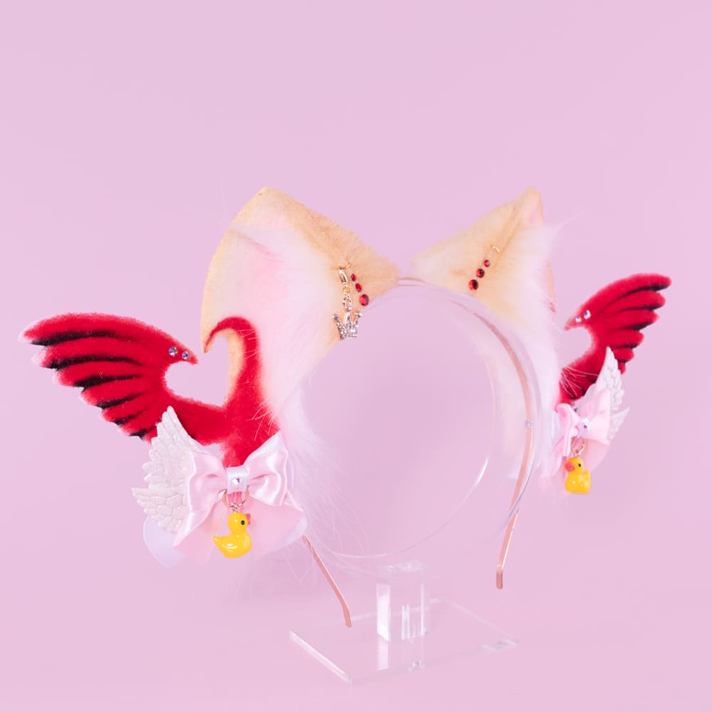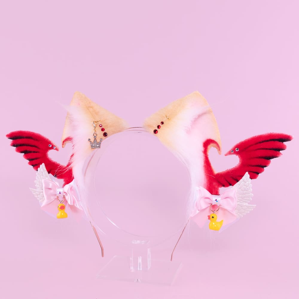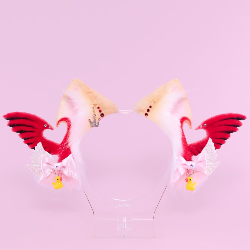 Beige and red kitten shaped ears, approximately 2.5 inches, decorated with airbrushing, piercing, rhinestones, a pendant and removable bows with themed pendants. Ears are fully wired and posable on a metal headband. Made of luxury quality faux fur.
