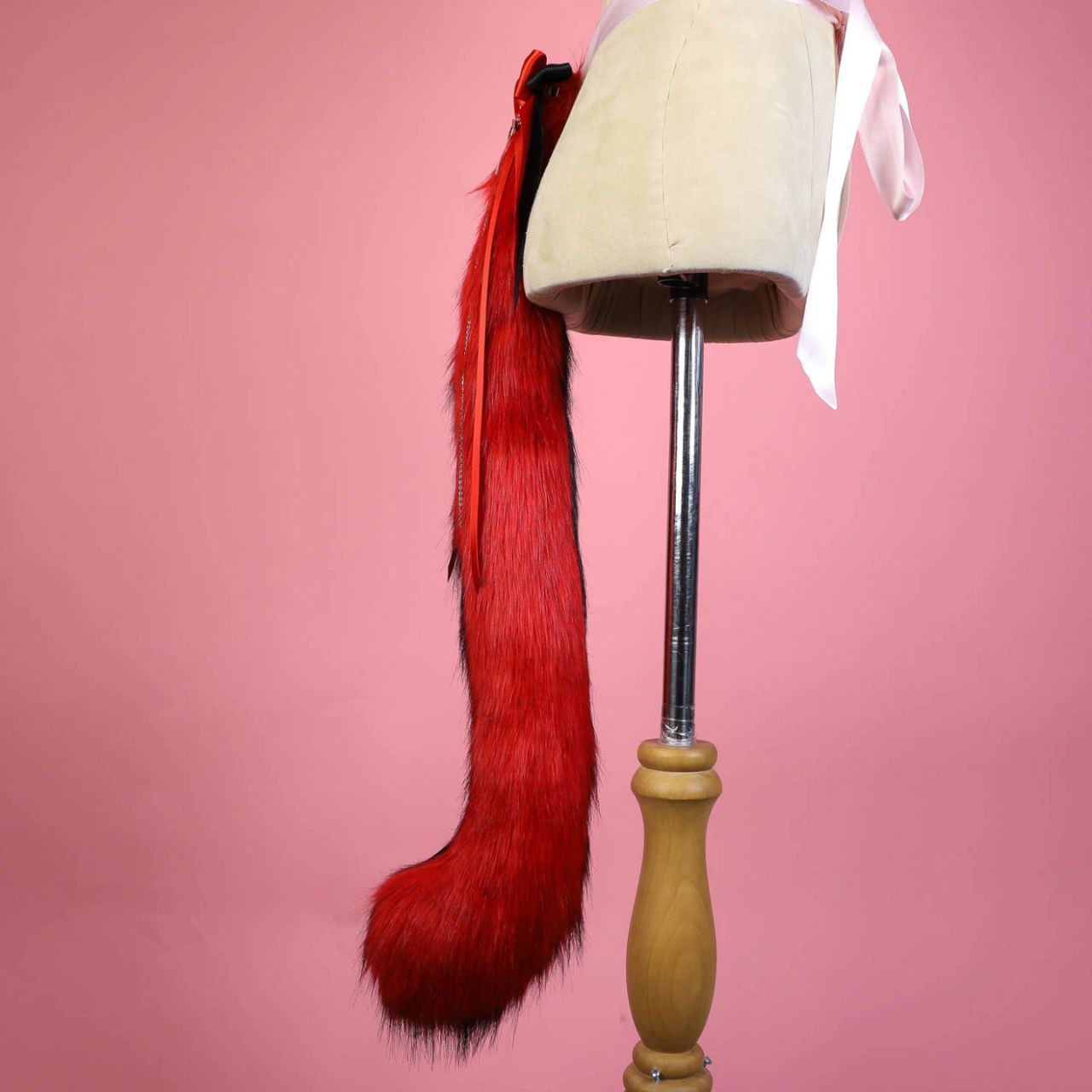 Black and red tail, approximately 30 inches, decorated with bow, chains and themed pendant. Tail is attached by an elastic belt loop and a doublesided ribbon. Made of luxury quality faux fur.