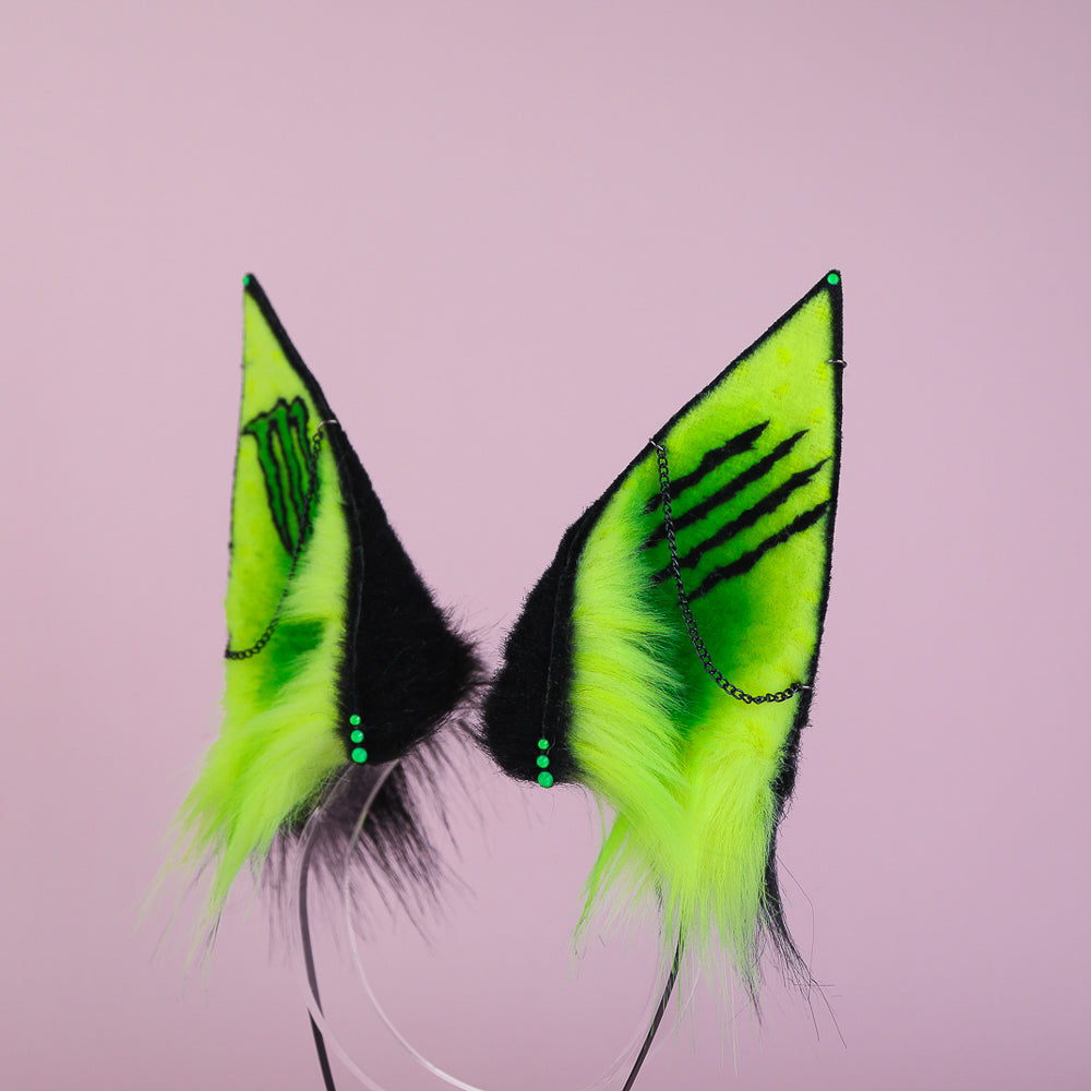 Ears are fully wired and posable on a metal headband. Approximately 3,5 inches tall. We use luxury quality faux fur and crystals. Decorated with a chain.