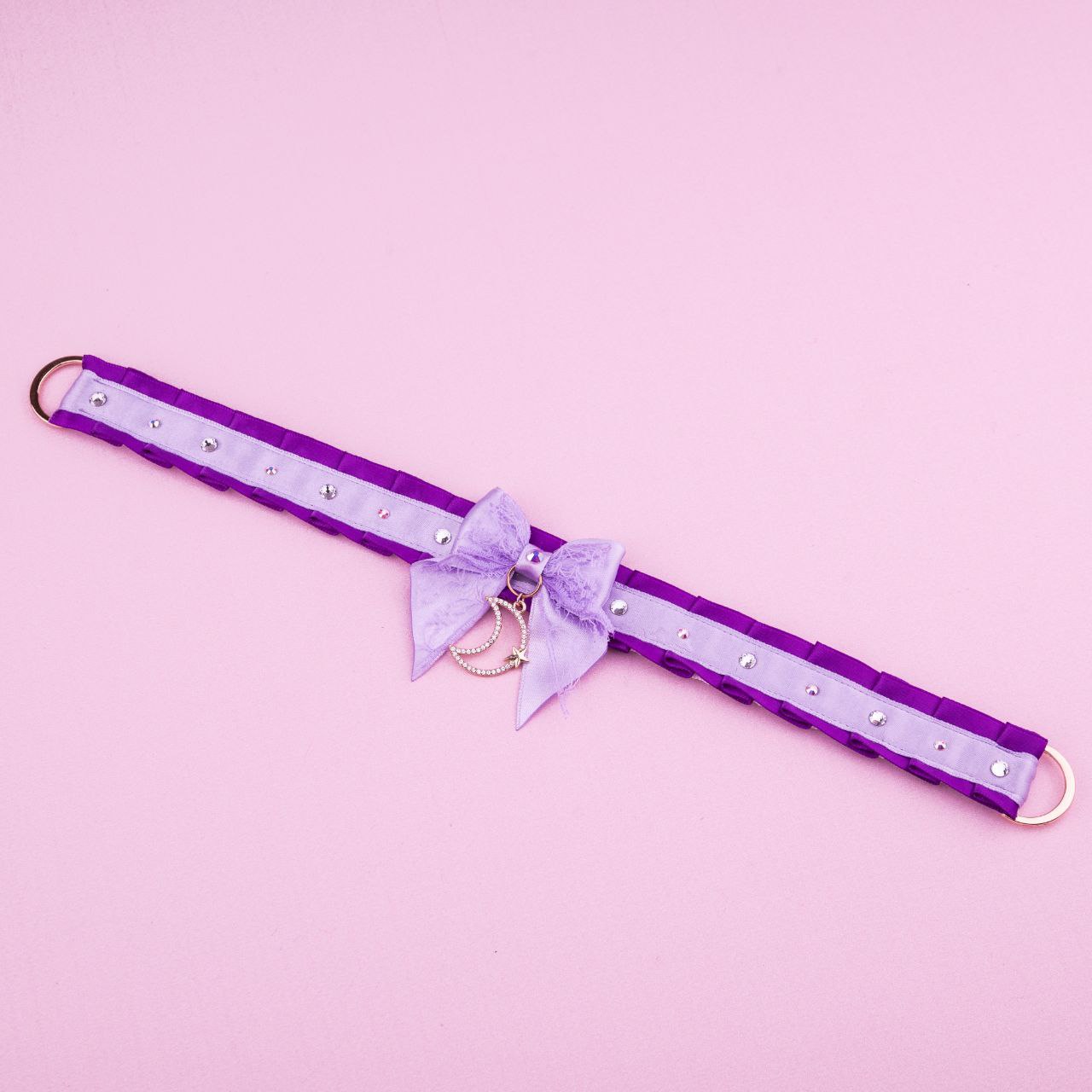 Violet pleated choker with rhinestone accents and a bow with a moon pendant.