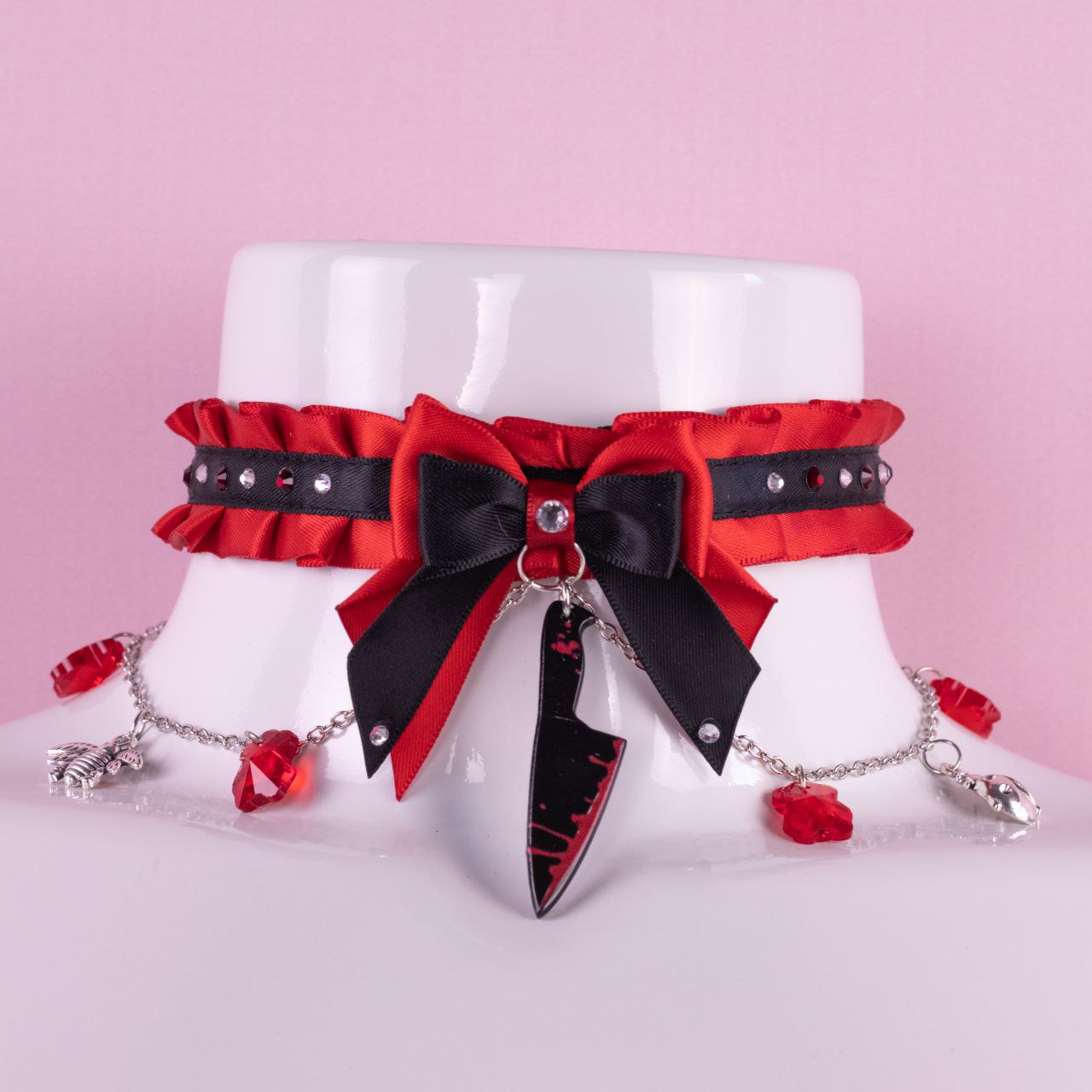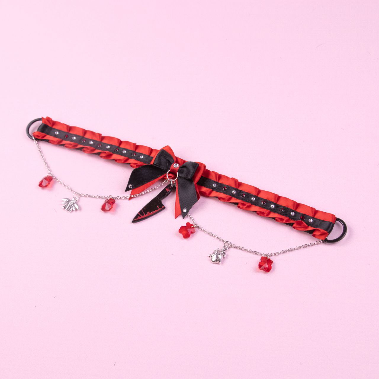Pleated black and red choker with bow, charm, chains and rhinestone accents.