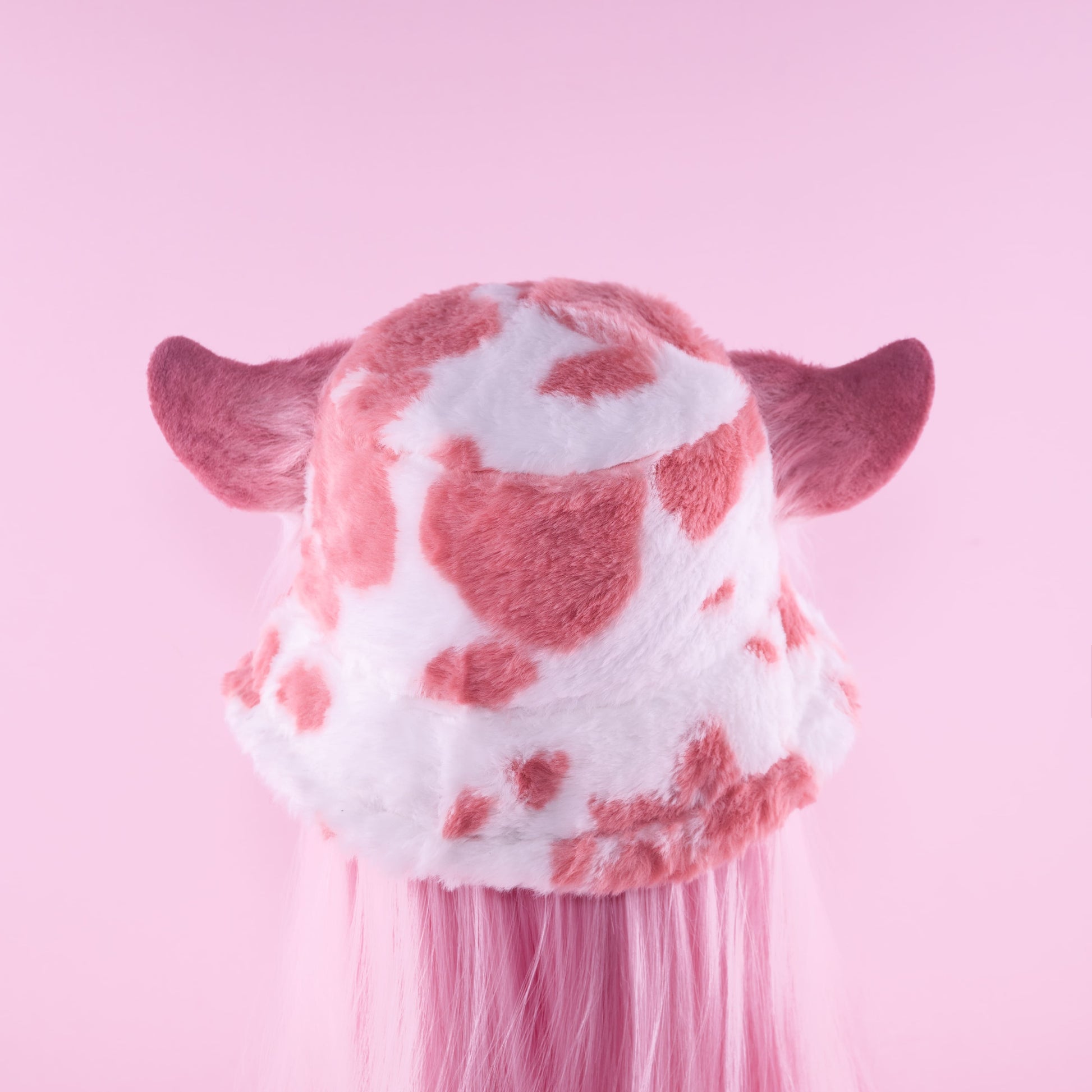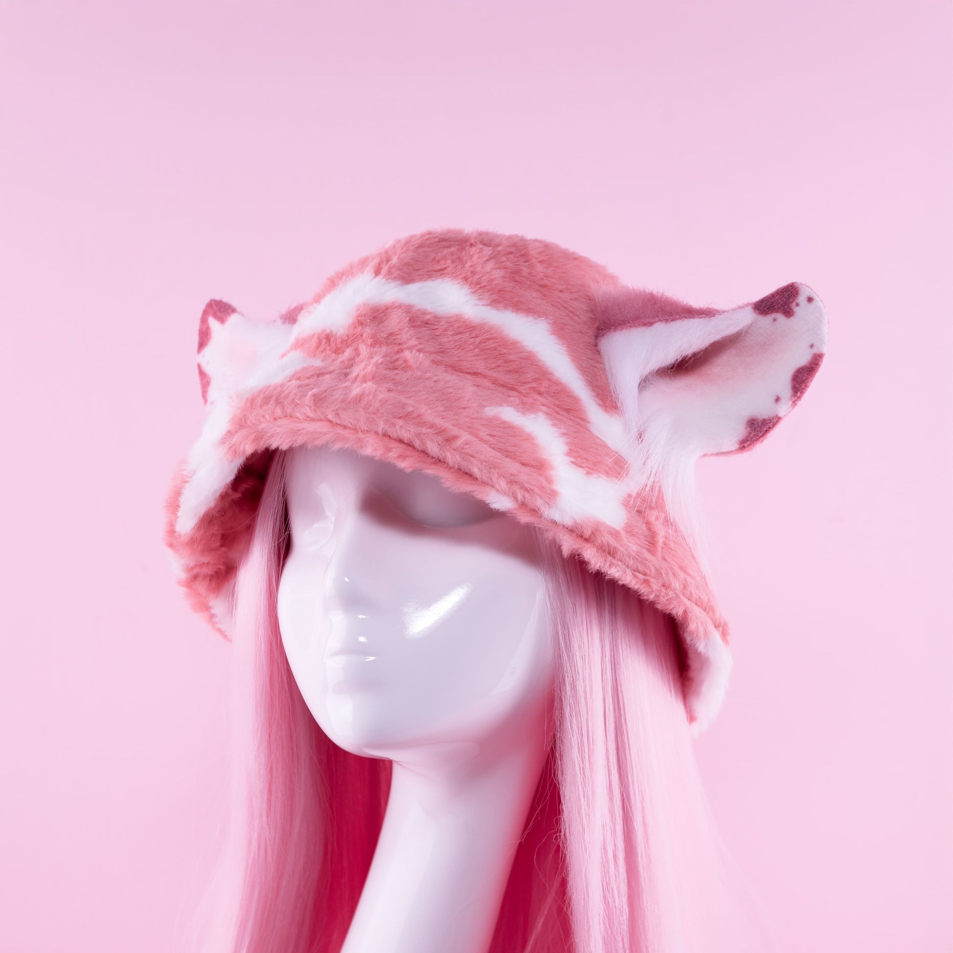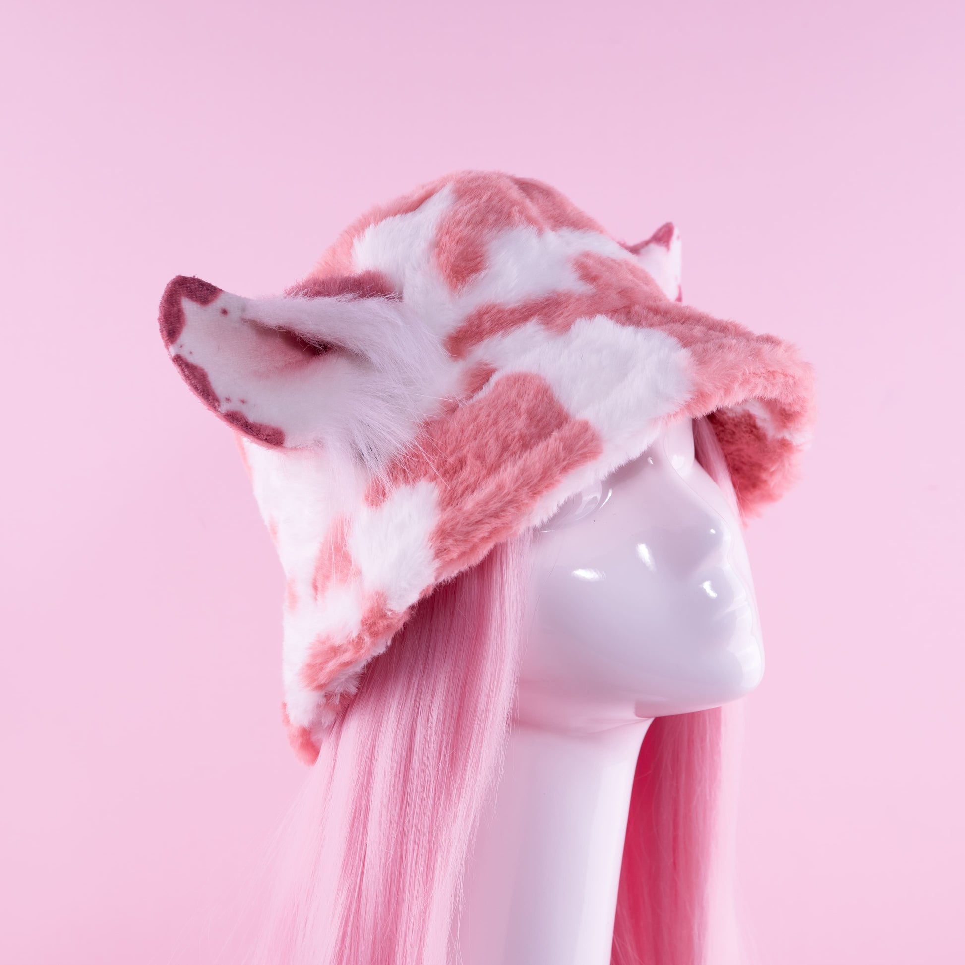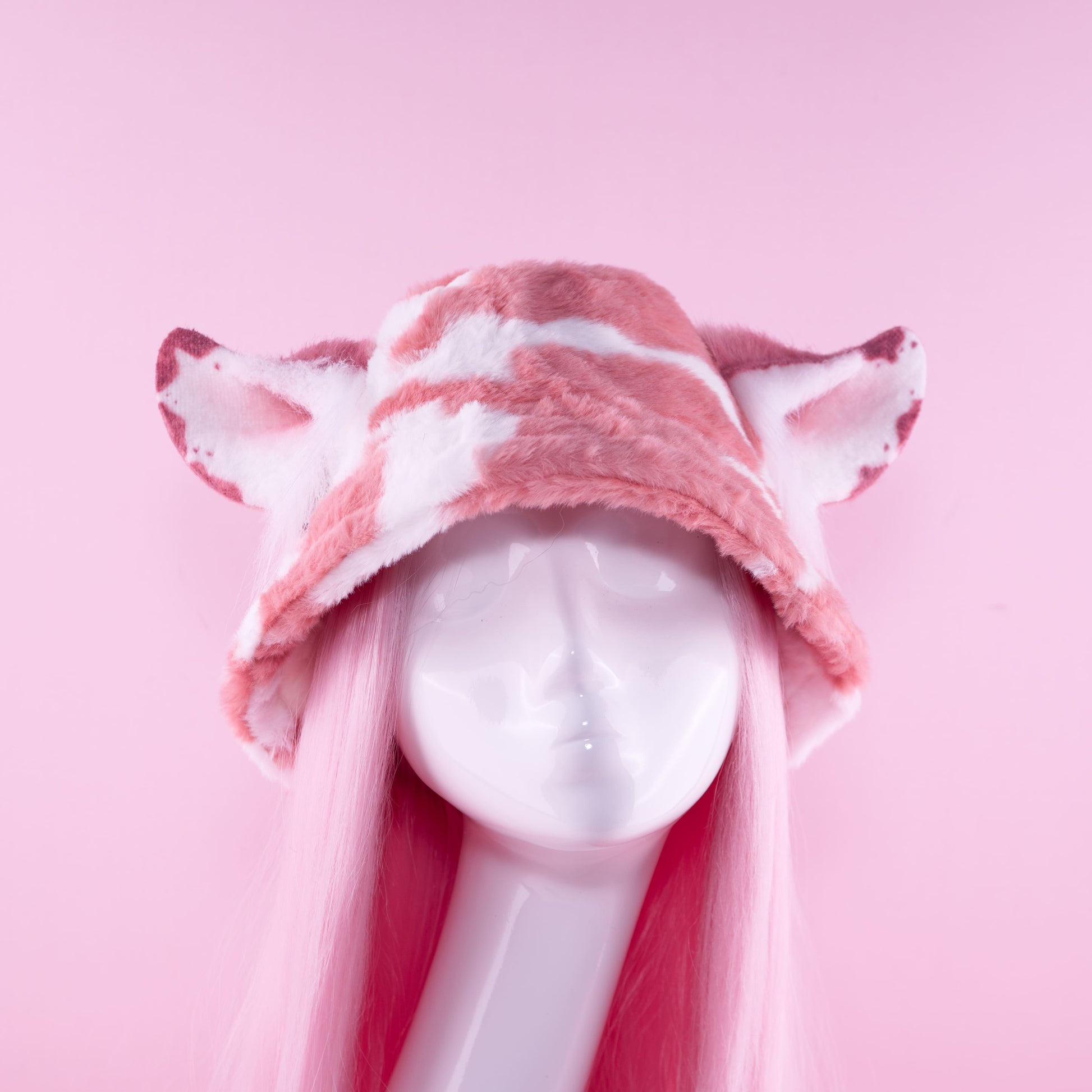 White and pink hat with removable cow ears, 2.5 inches. Made of luxury faux fur.