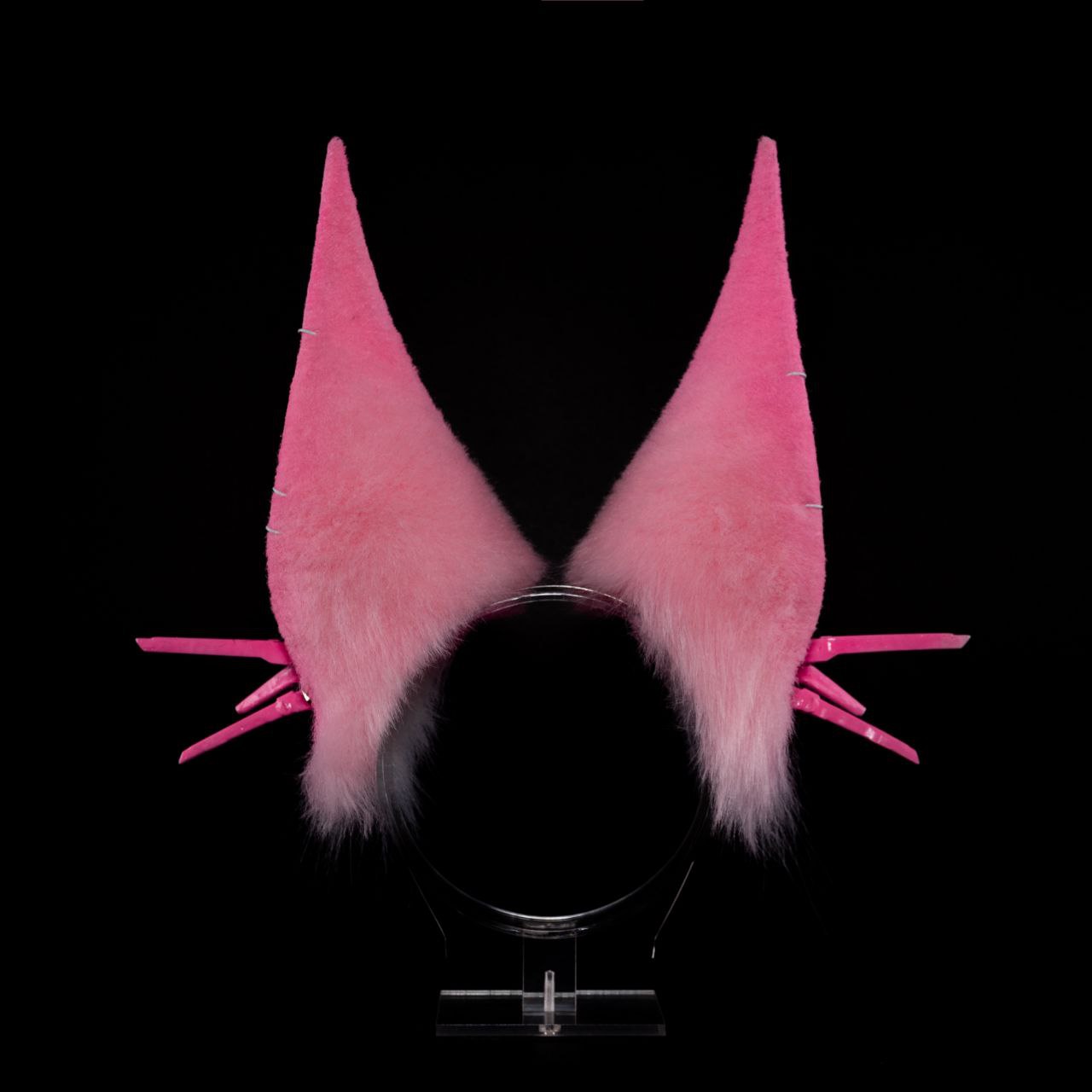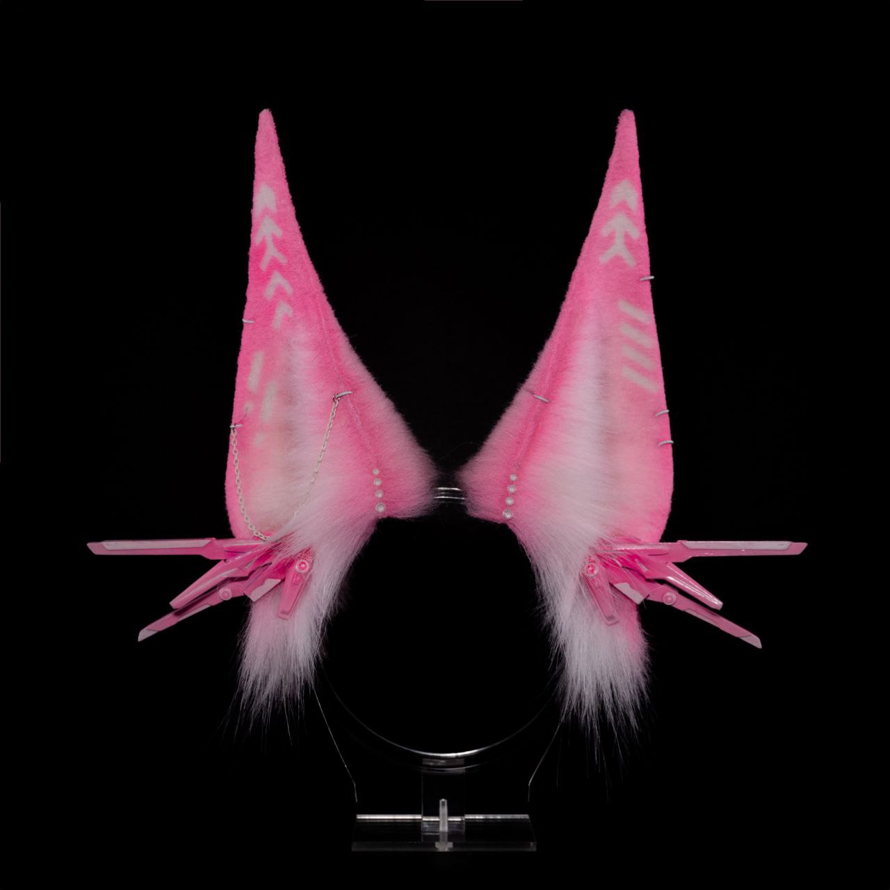 Pink Anubis ears, approximately 7.5 inches tall, are made of luxury quality faux fur and crystals. Decorated with airbrushing, rhinestones and piercing hoops. Fully wired and posable on a metal headband.
