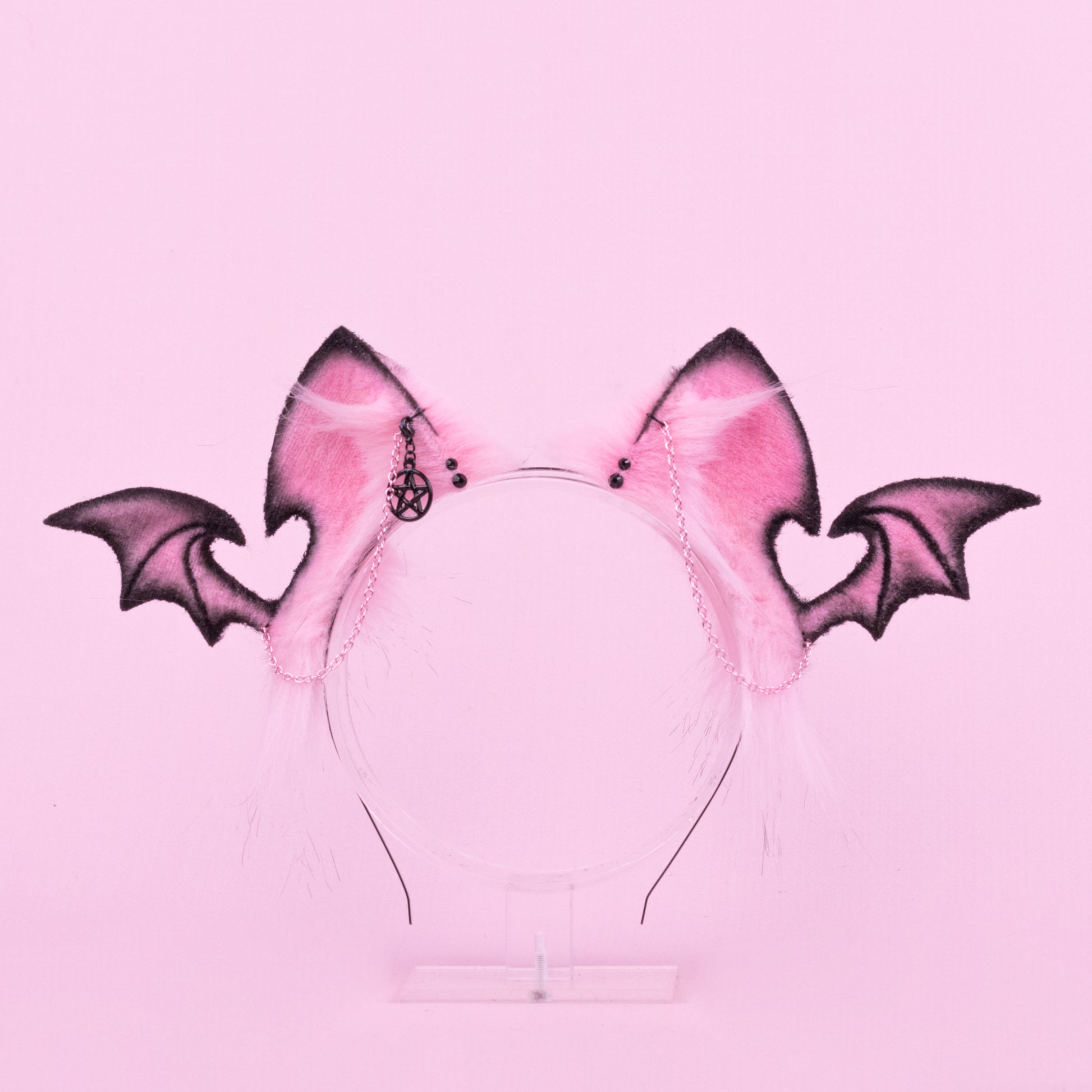 White and pink kitten shaped ears, approximately 2.5 inches, decorated with airbrushing, piercing, rhinestones and chains. Ears are fully wired and posable on a metal headband. Made of luxury quality faux fur and crystals.