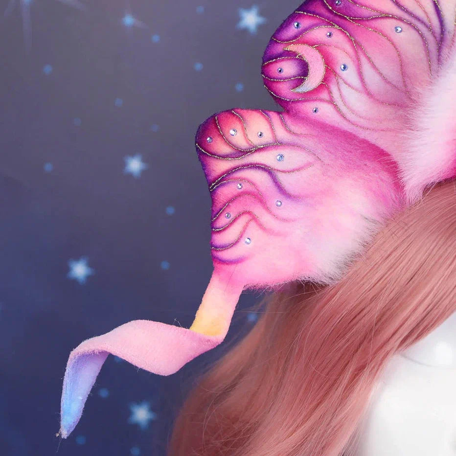 Ears are fully wired and posable on a metal headband. Approximately 16 inches tall. We use luxury quality faux fur and crystals.